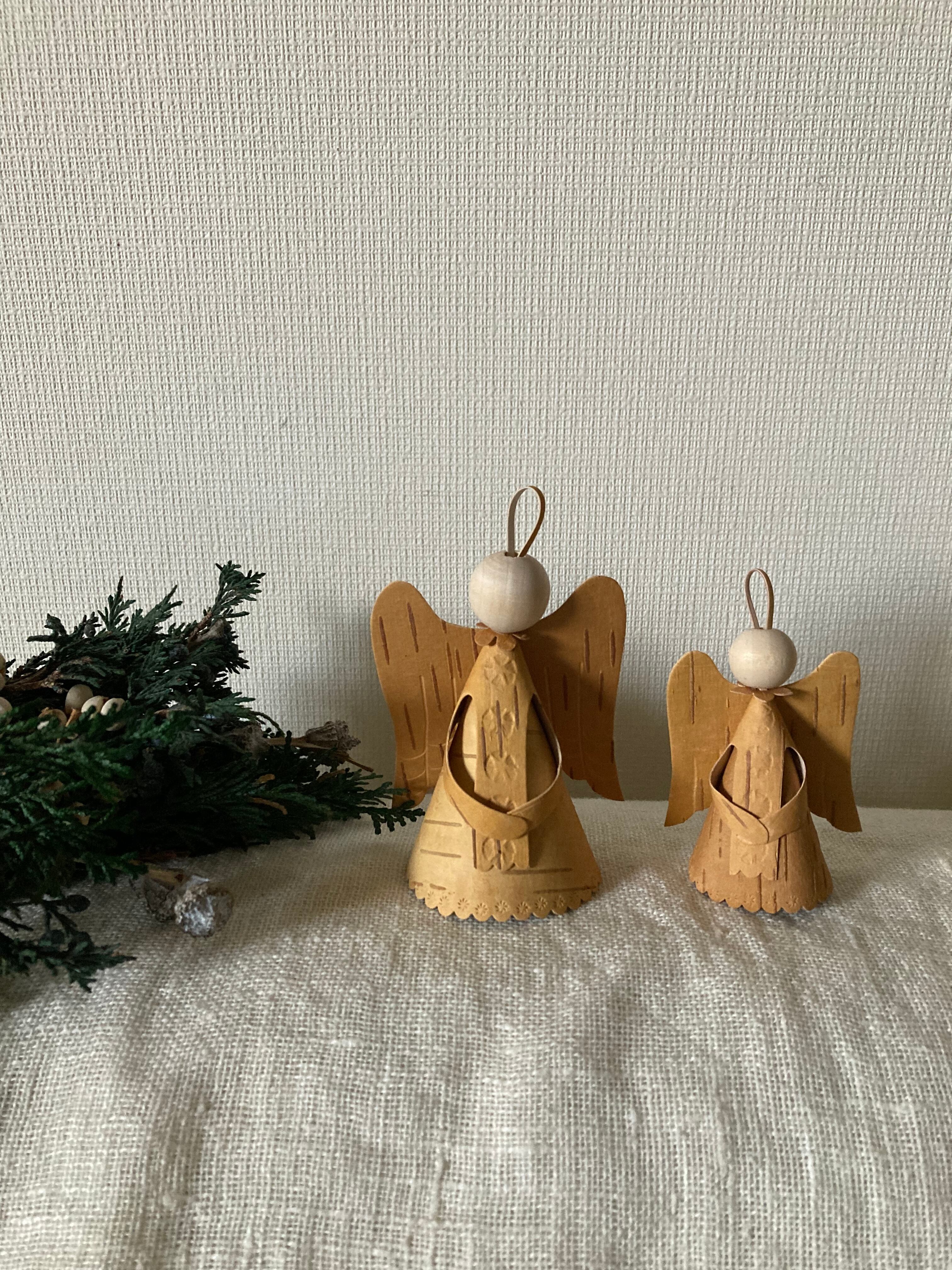 まん丸の顔がなんとも愛らしい、白樺の樹皮で作られた天使のオーナメントです。
