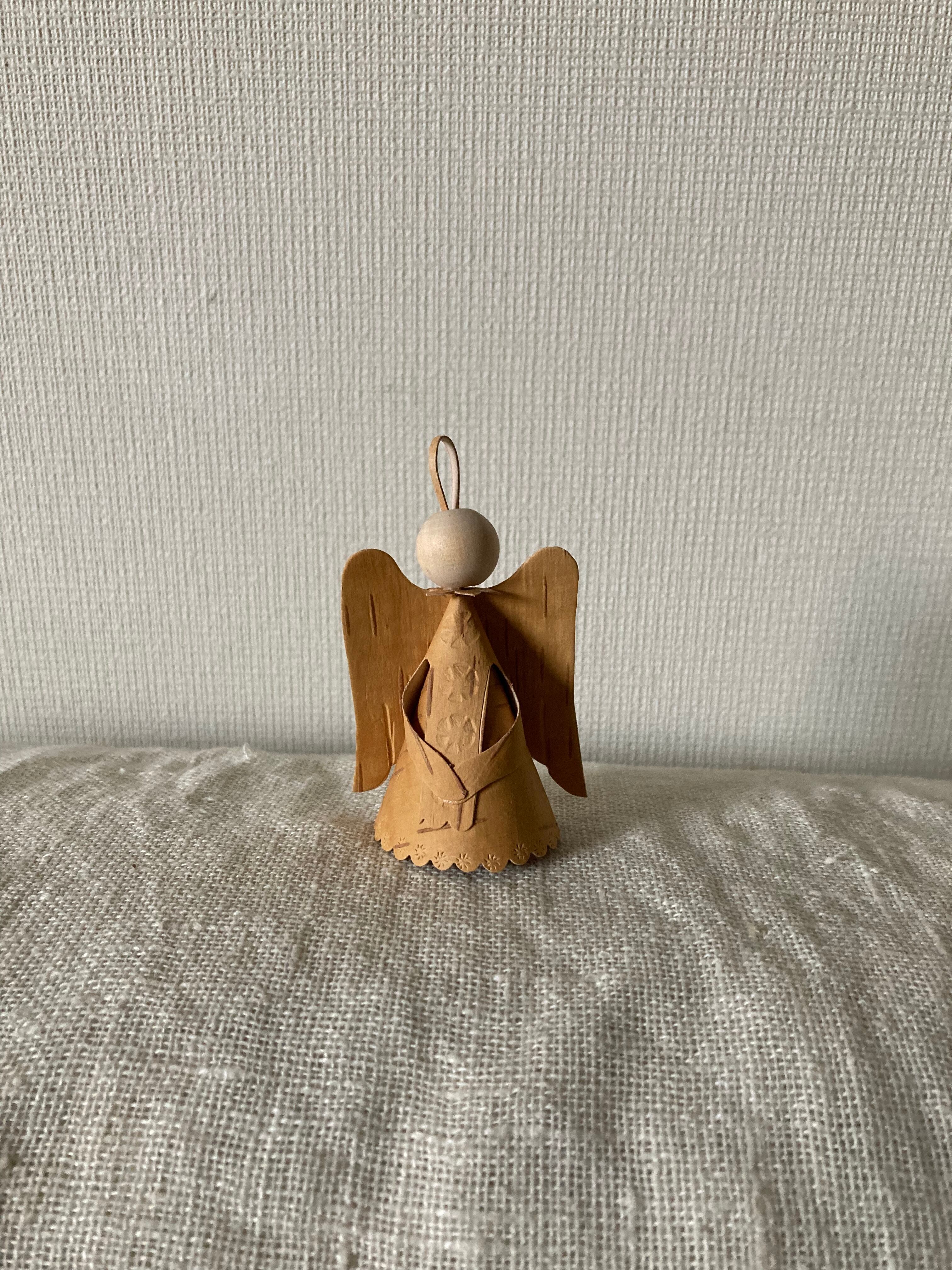 まん丸の顔がなんとも愛らしい、白樺の樹皮で作られた天使のオーナメントです。