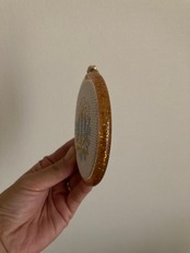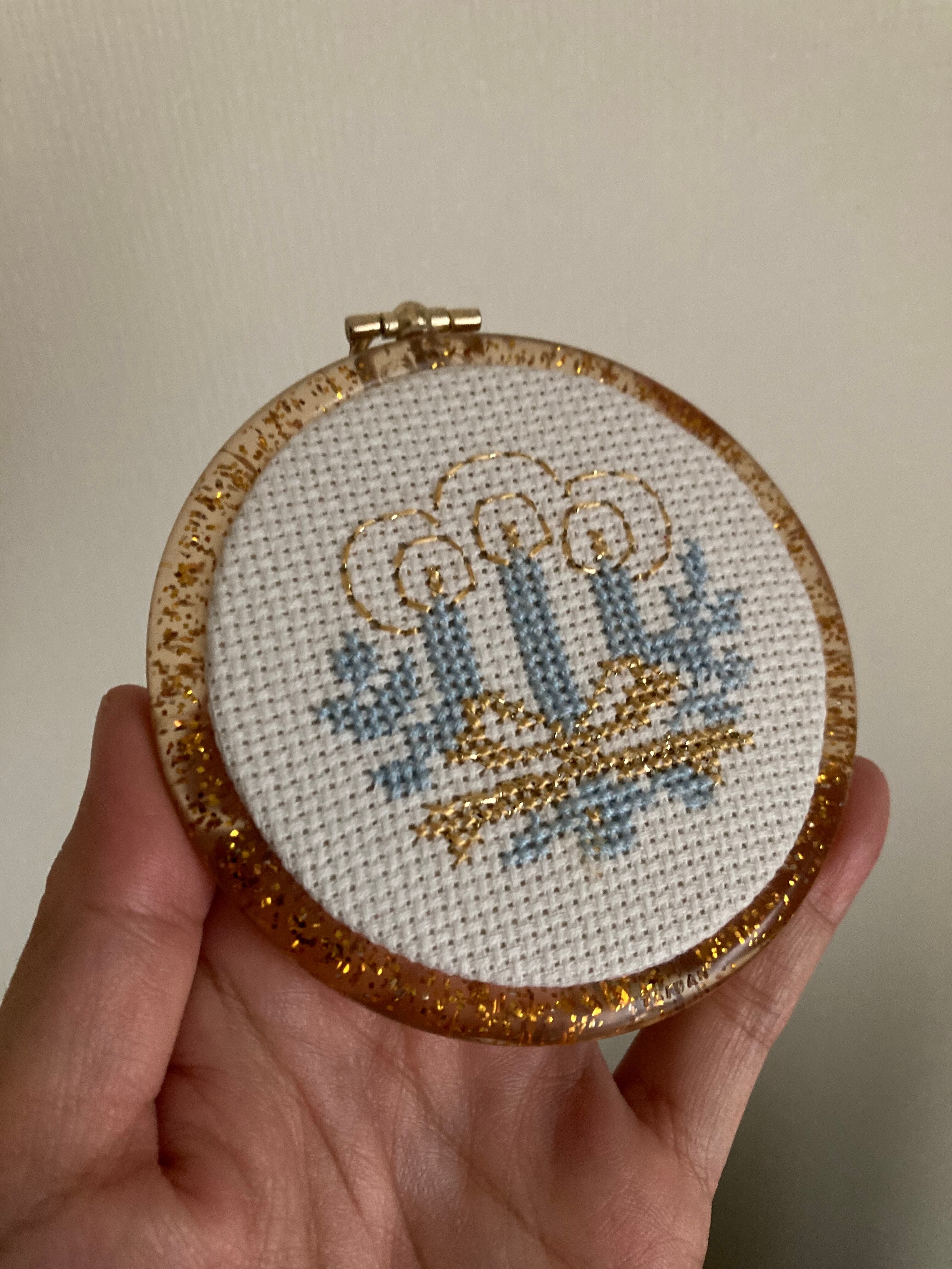 ゴールドと薄いブルーのキャンドル刺繍がシックで素敵なクリスマスの丸額入り刺繍飾りです♫