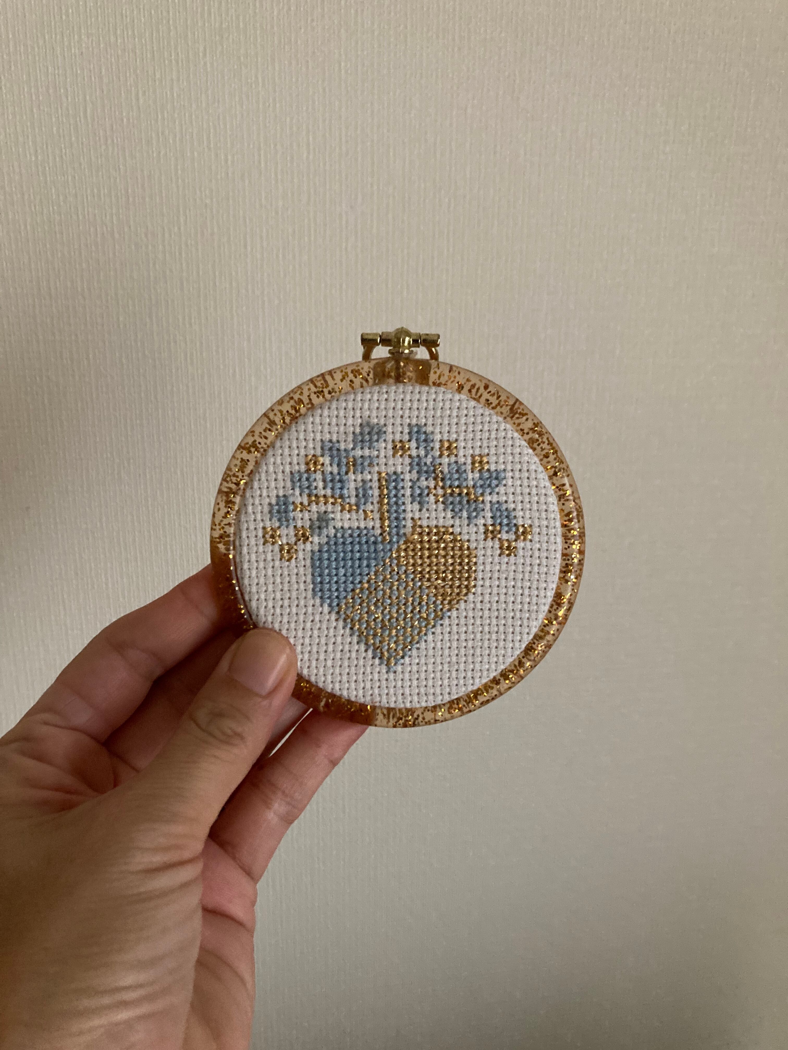 ゴールドと薄いブルーの、ハートのオーナメント刺繍がシックで素敵なクリスマスの丸額入り刺繍飾りです♫