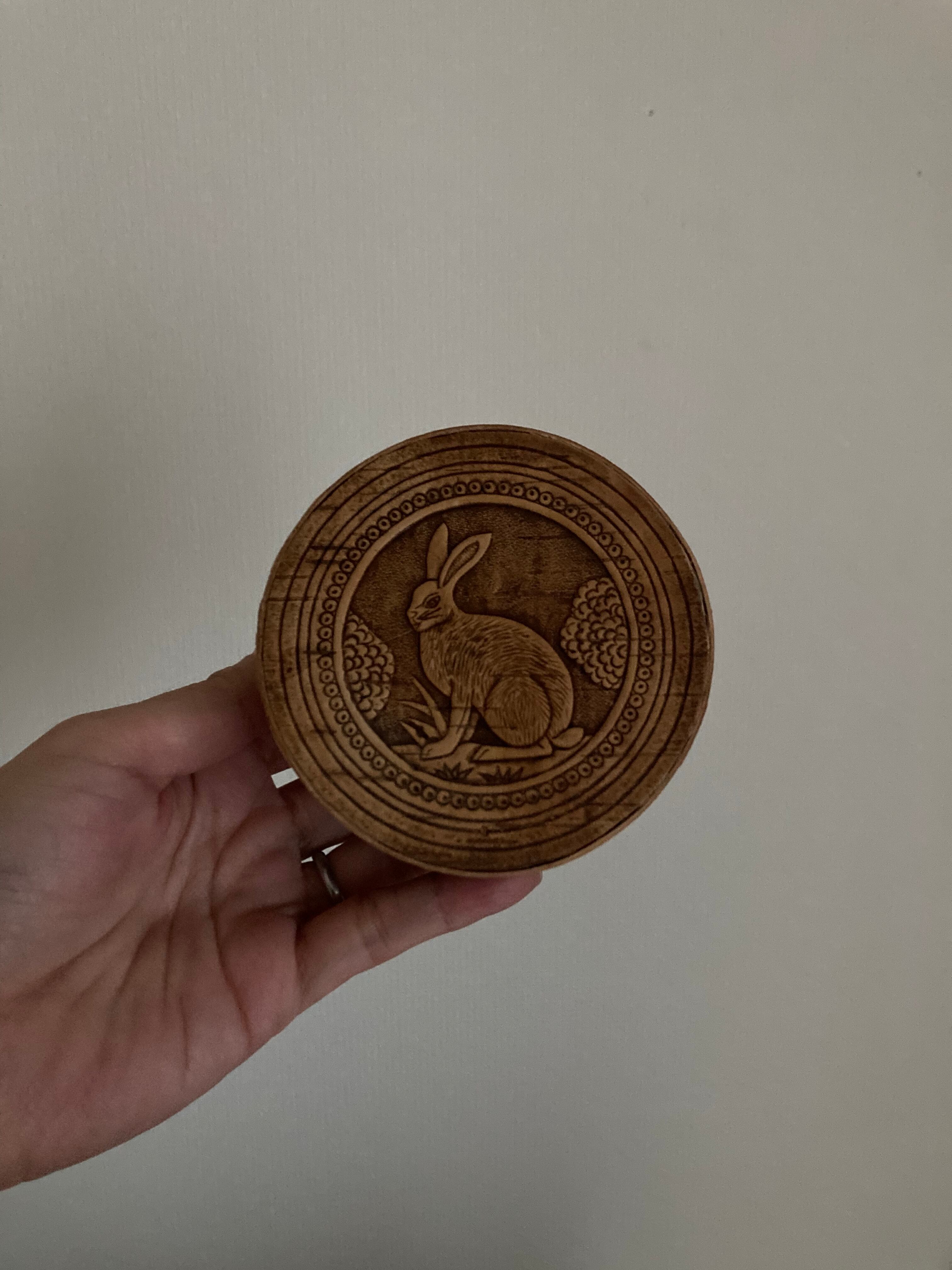 蓋のウサギとサイドのモミの木の型押し模様が、ほっこり可愛らしいベレスタ。