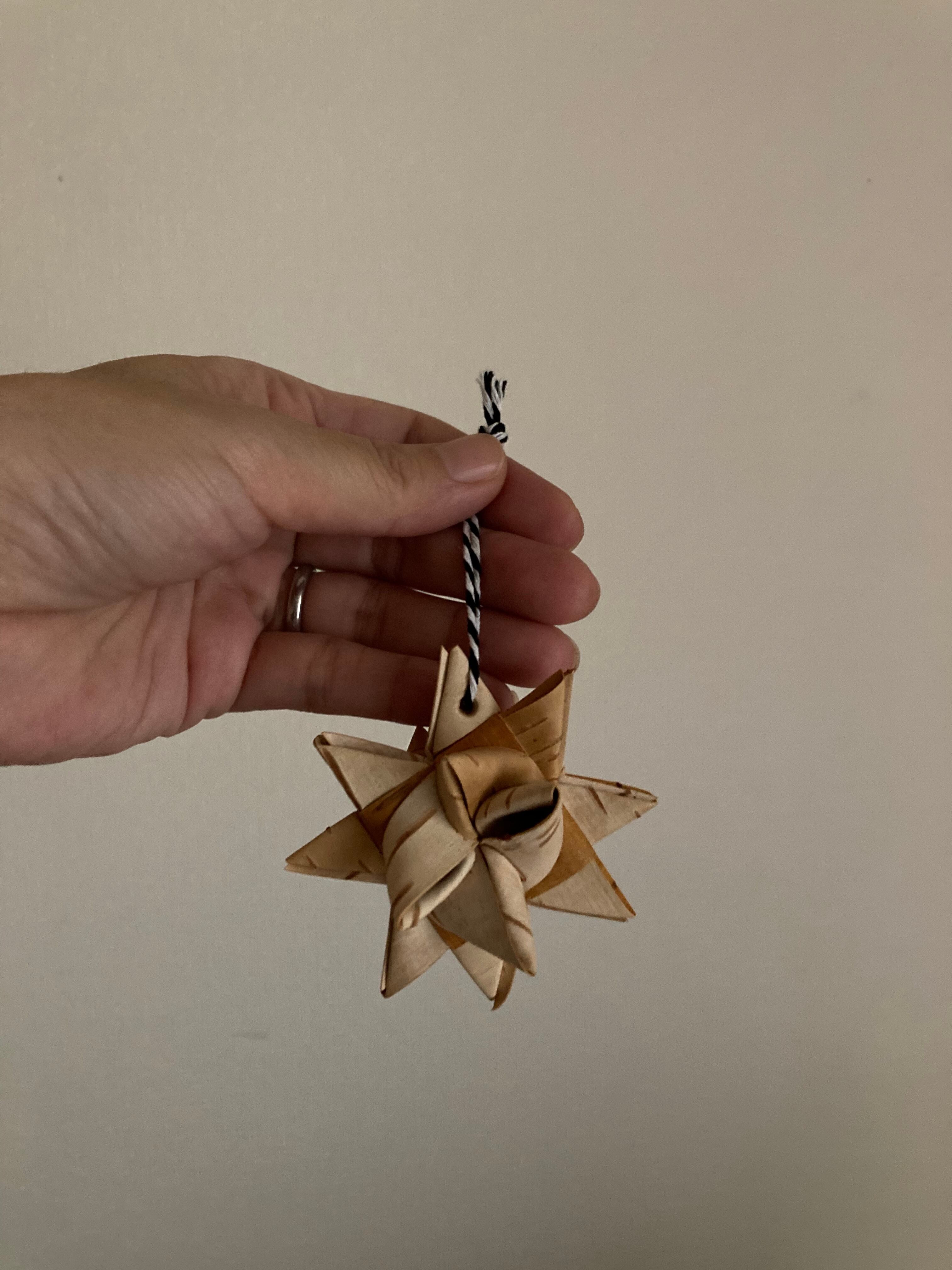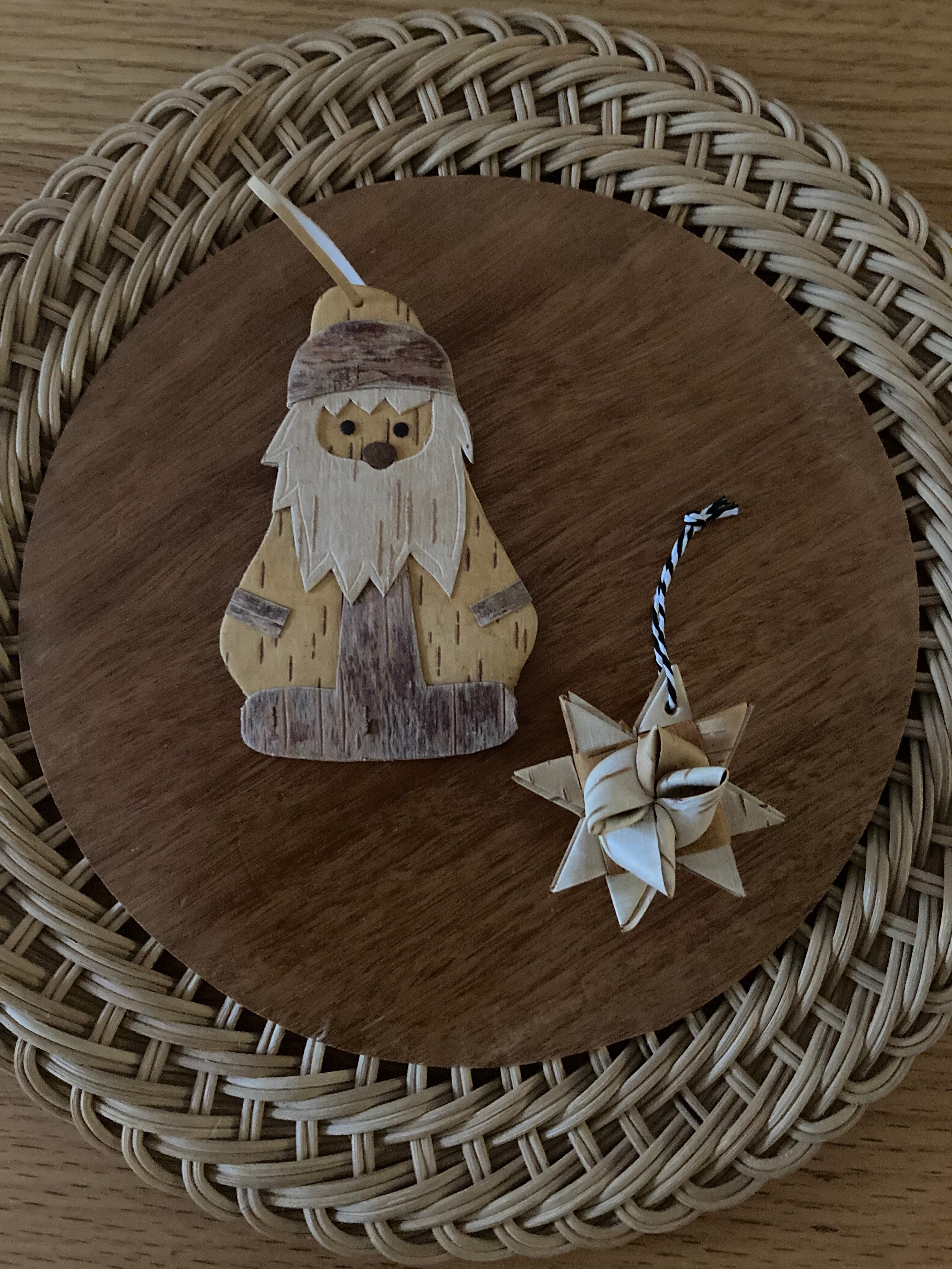 白樺の樹皮をカットして細工したサンタのオーナメントと、コロンとした形が可愛い、白樺の立体的な星のオーナメント♫