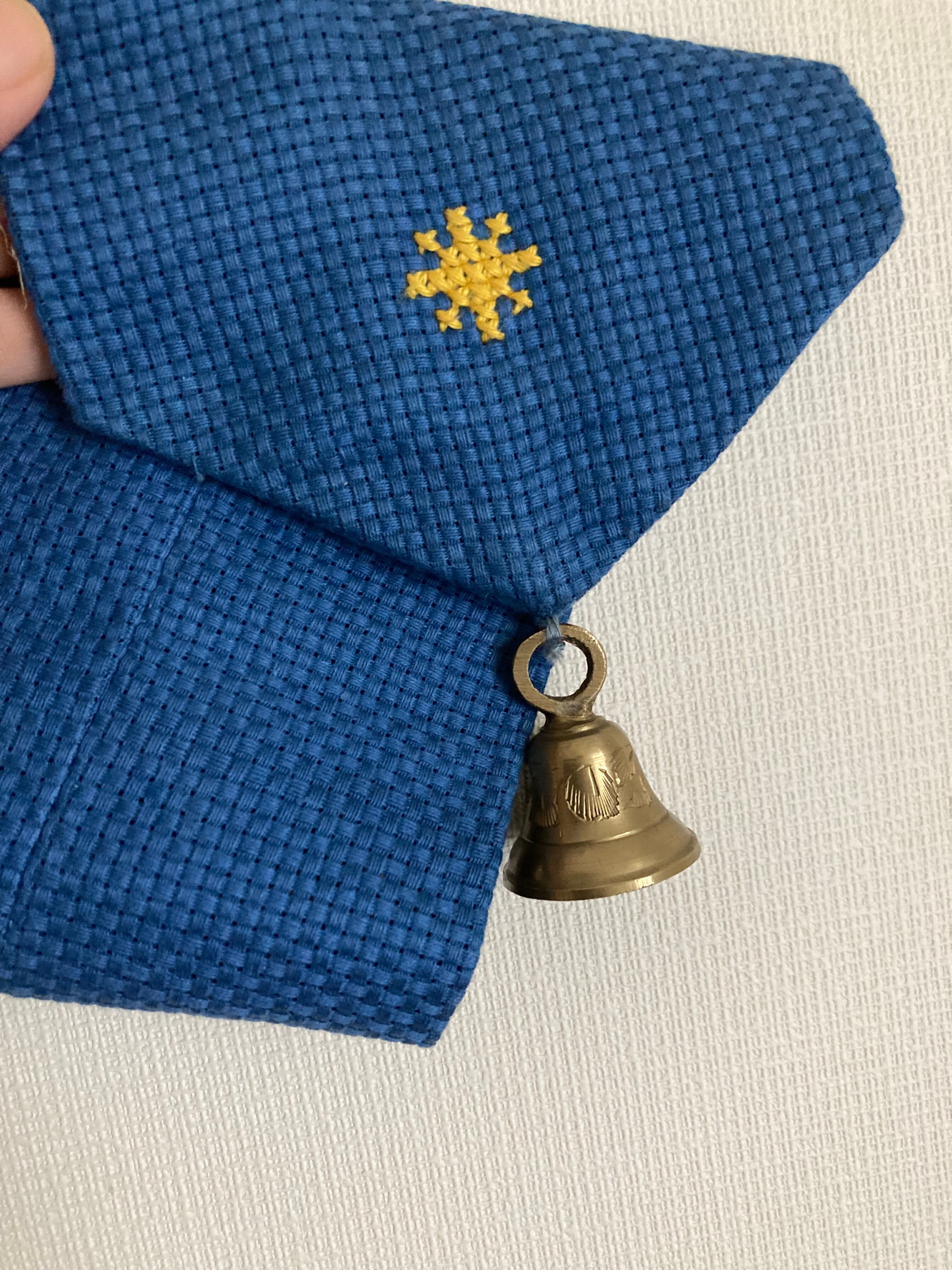 青い生地に、星空の下の教会、教会に向かう人々とクリスマスツリーの刺繍とベルが、とても可愛らしいクリスマスのタペストリーです♫