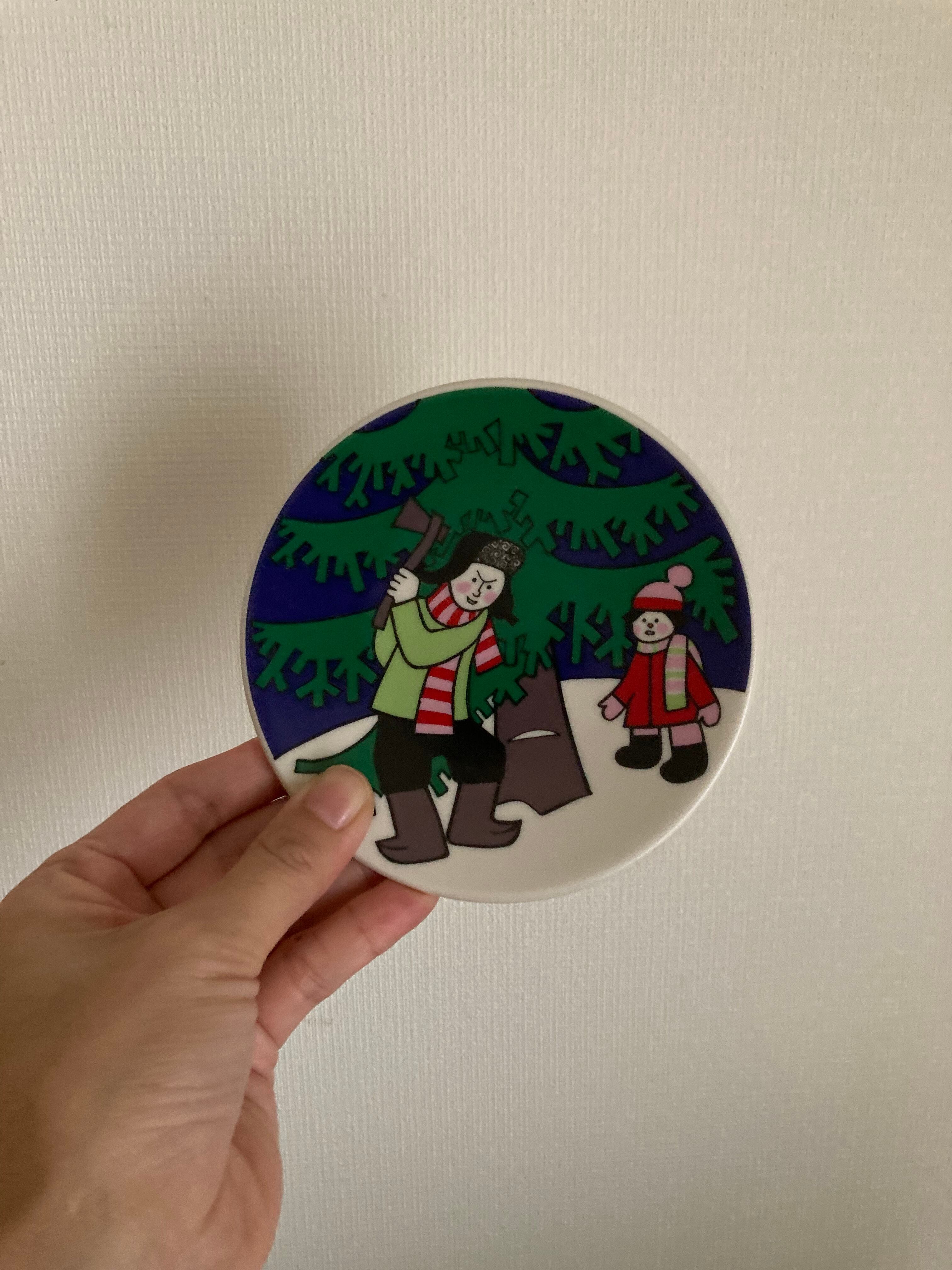 クリスマスに備えて、モミの木を切ろうとしているお兄さんと女の子の絵柄が可愛らしいミニプレートです。2人の冬の装いもオシャレ♫