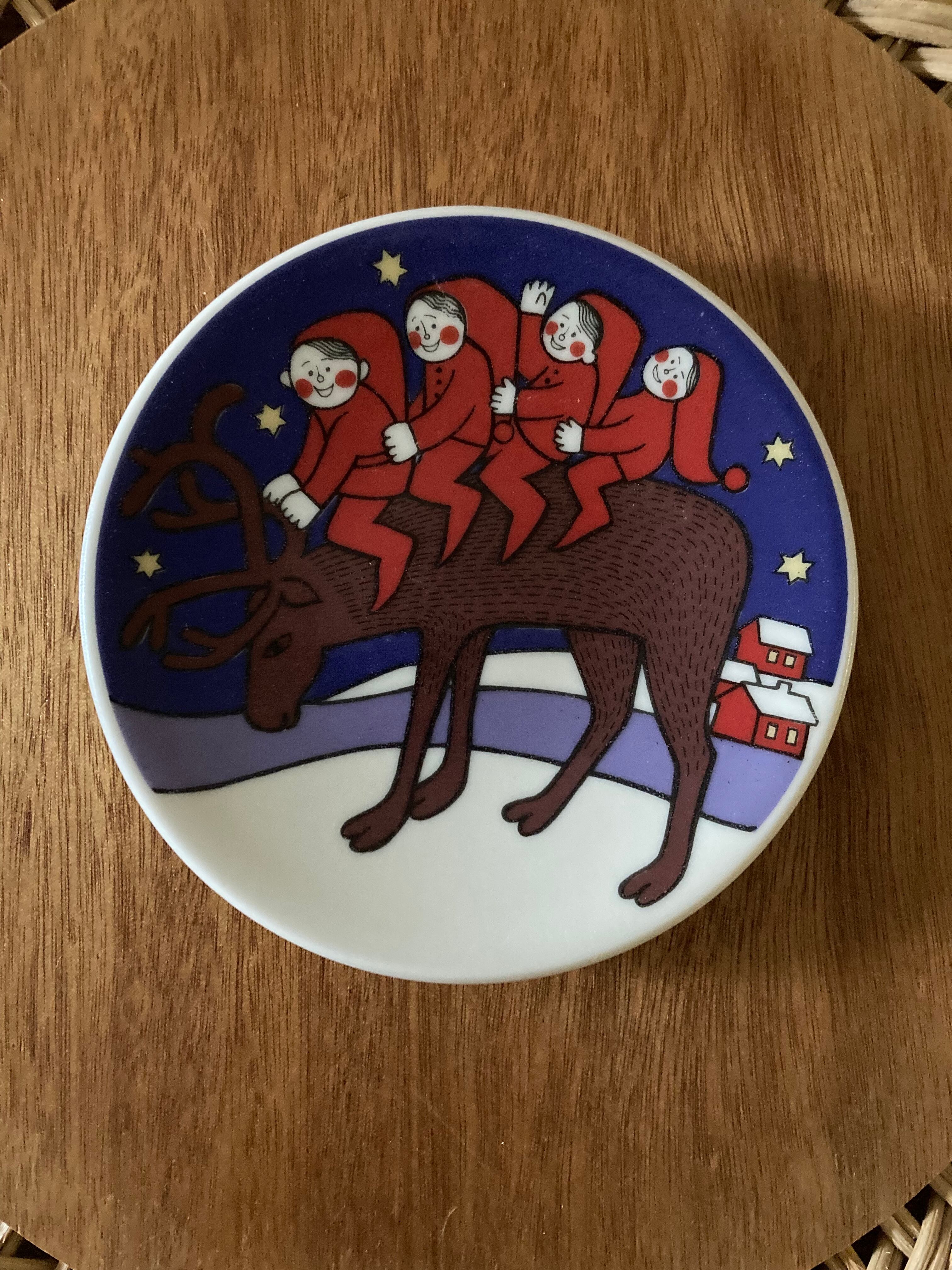 星空の下、トナカイに乗ってる楽しそうな4人のトムテの絵柄が、とても可愛らしいミニプレートです。
