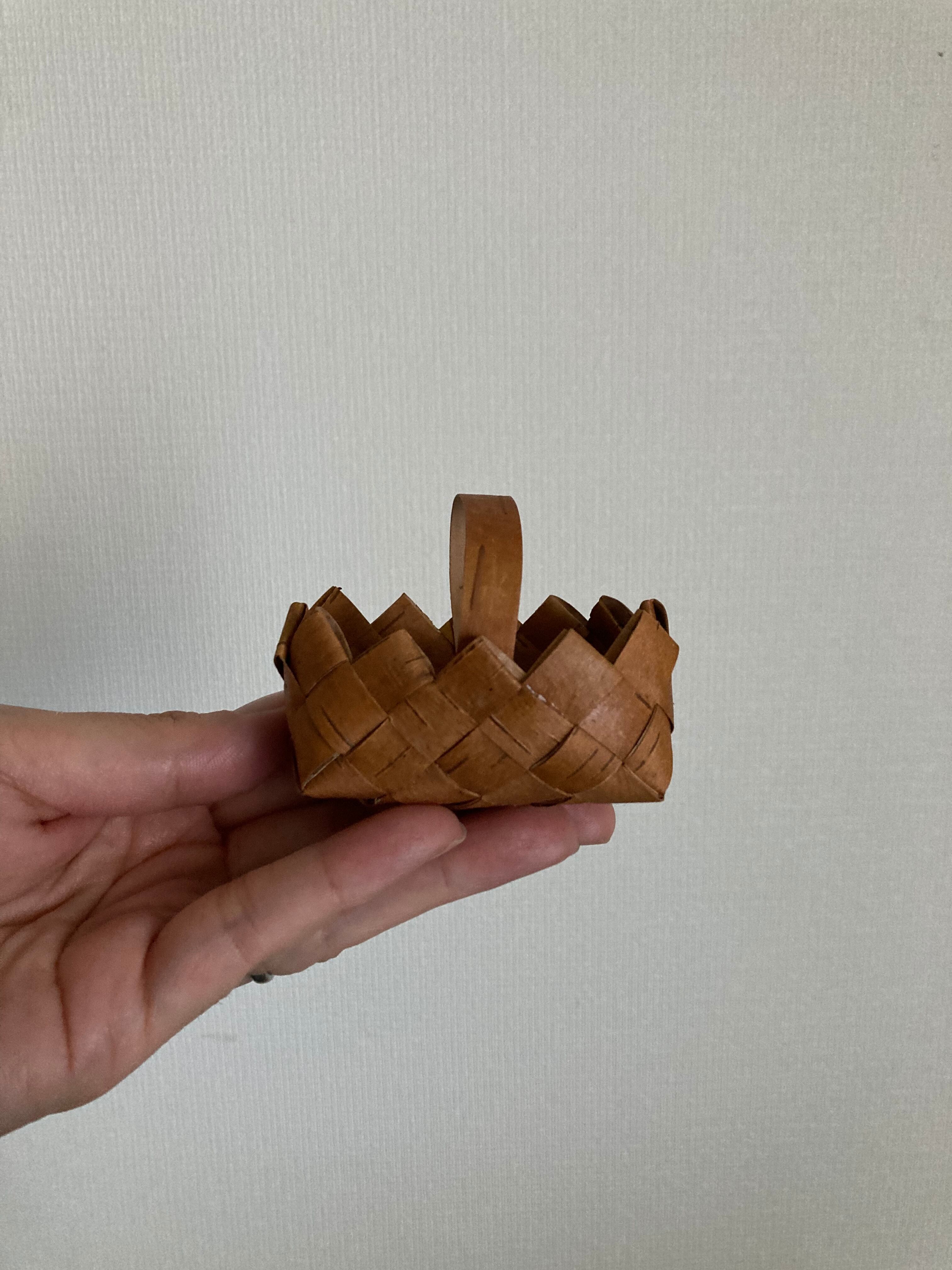 上のギザギザと、手のひらに乗るミニチュアサイズがとても可愛らしい、白樺のバスケット♫