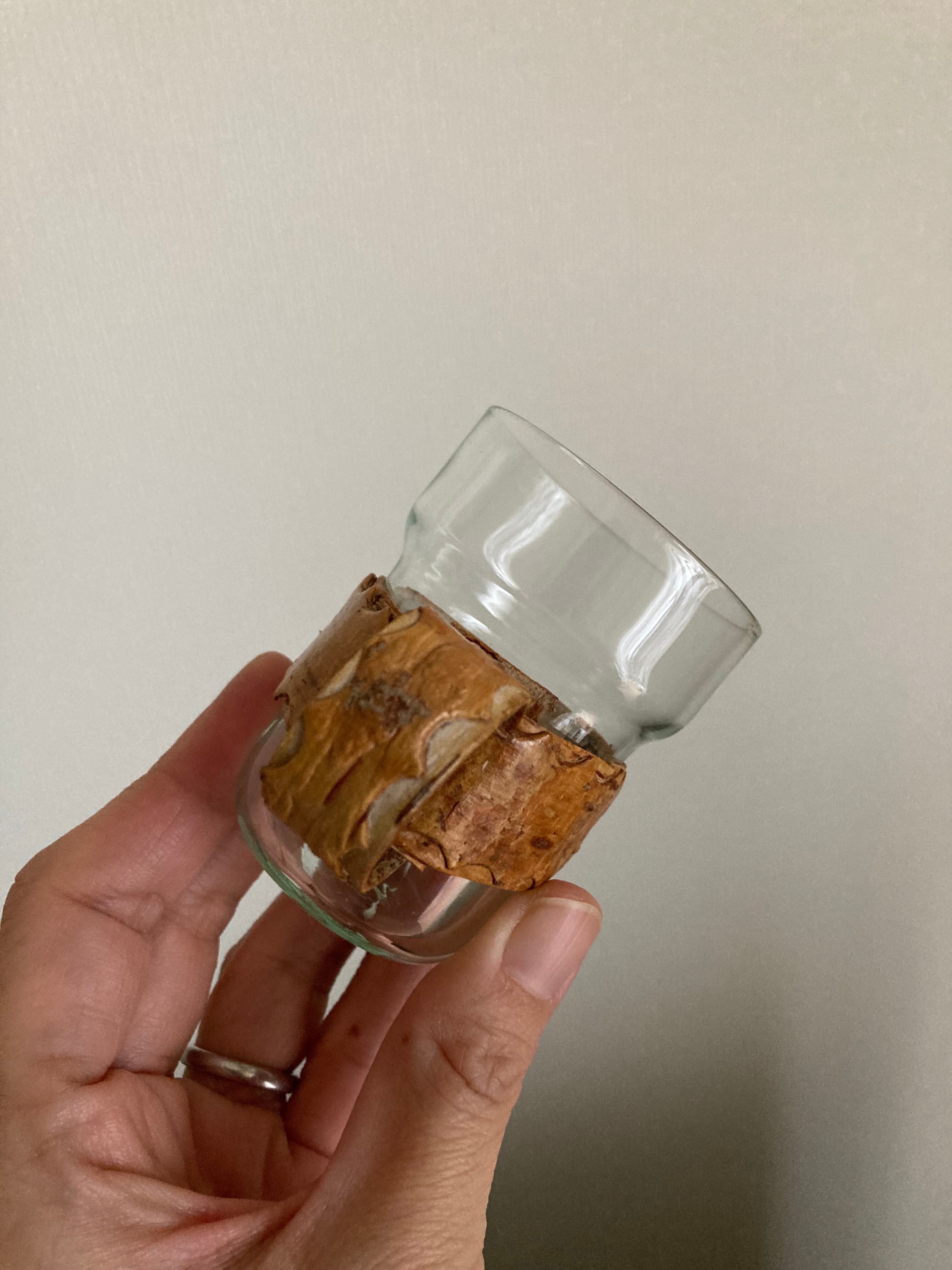 小さな白樺の取っ手付きホルダーにぴったり収まる小さなグラスがセットになっています♫
