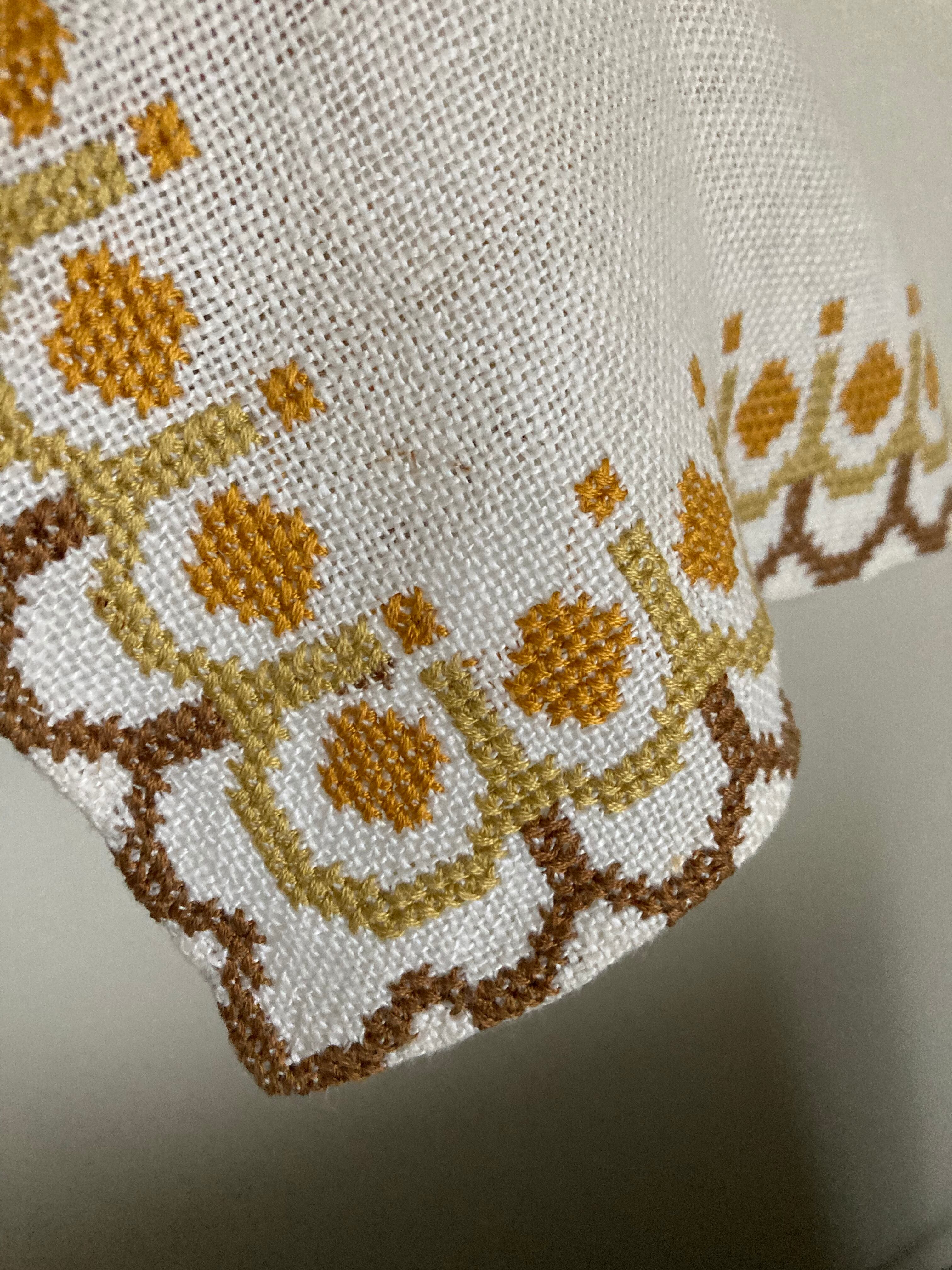 白のリネン生地に、お花のような落ち着いた黄色の丸い刺繍、回りの波型のブラウン刺繍が可愛らしい、リネンクロスです♫