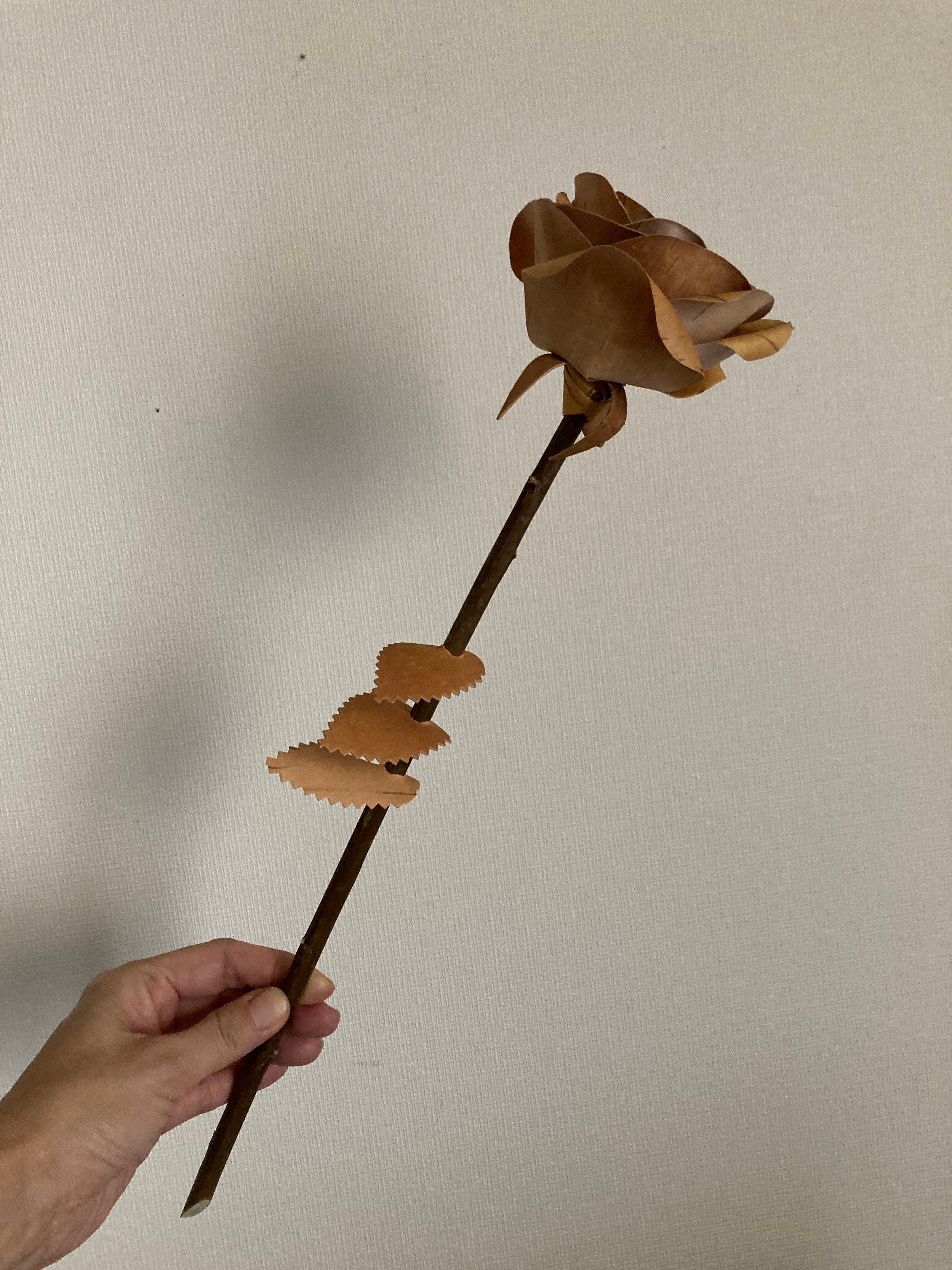 すっと伸びた長い枝に大ぶりな白樺の樹皮が重なった薔薇の細工がとても素敵な一品♫