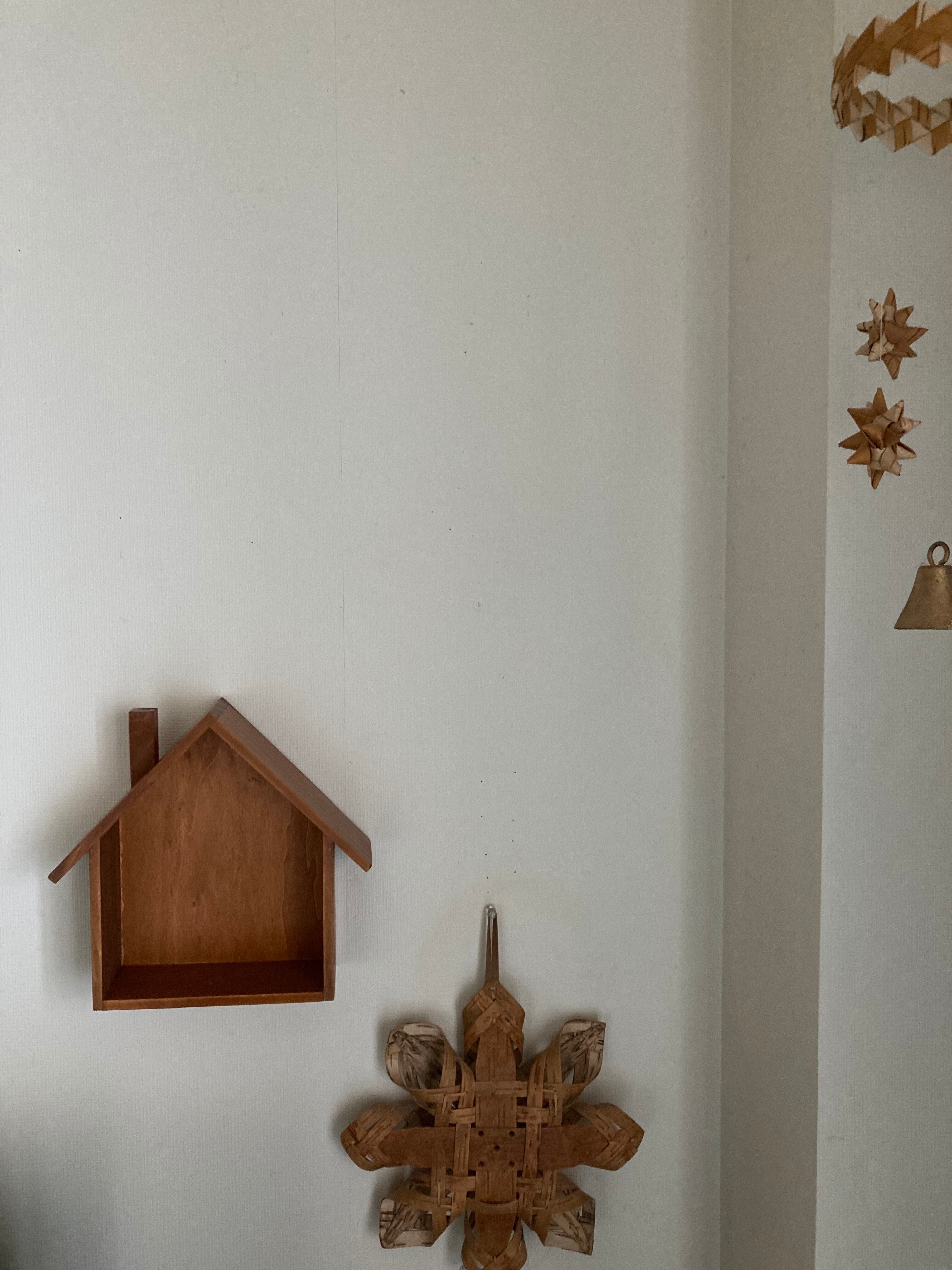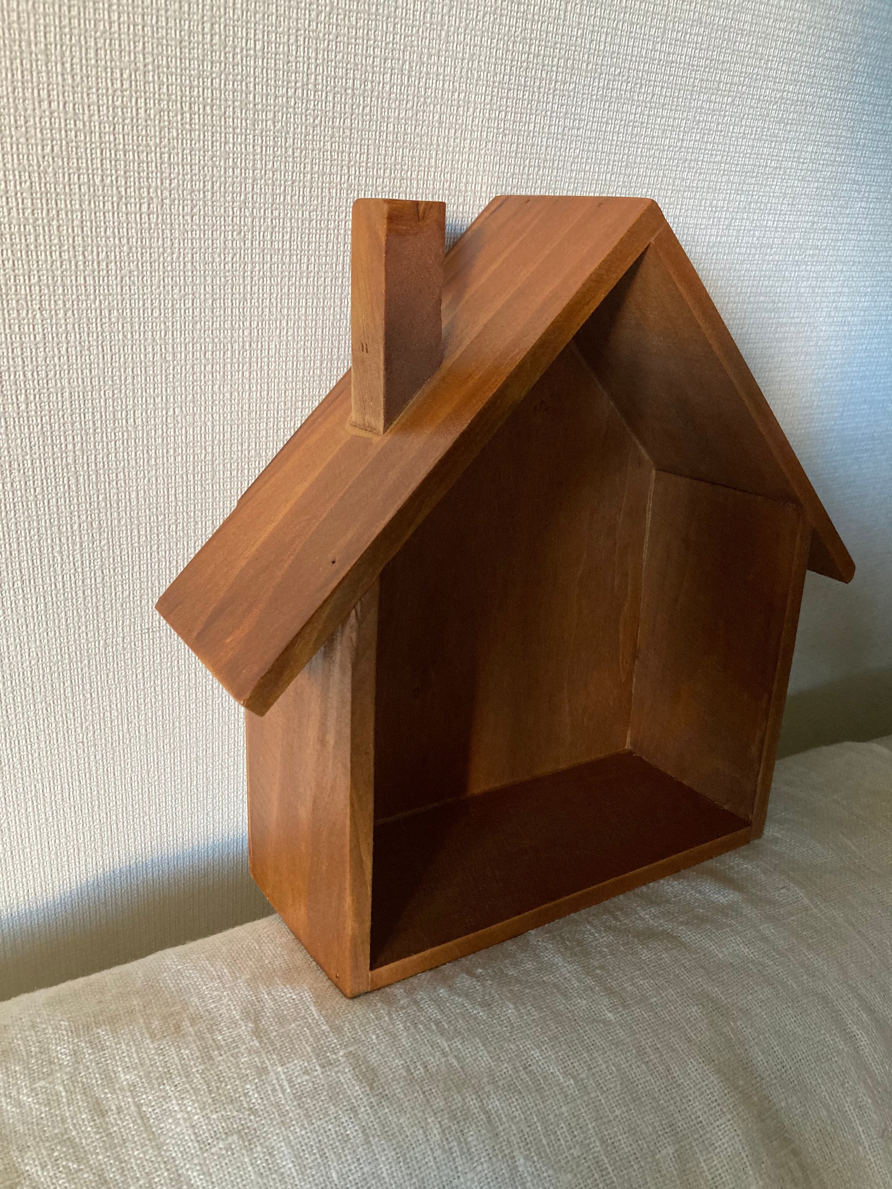 ナチュラルな木のおうち型壁かけの飾り棚になります。