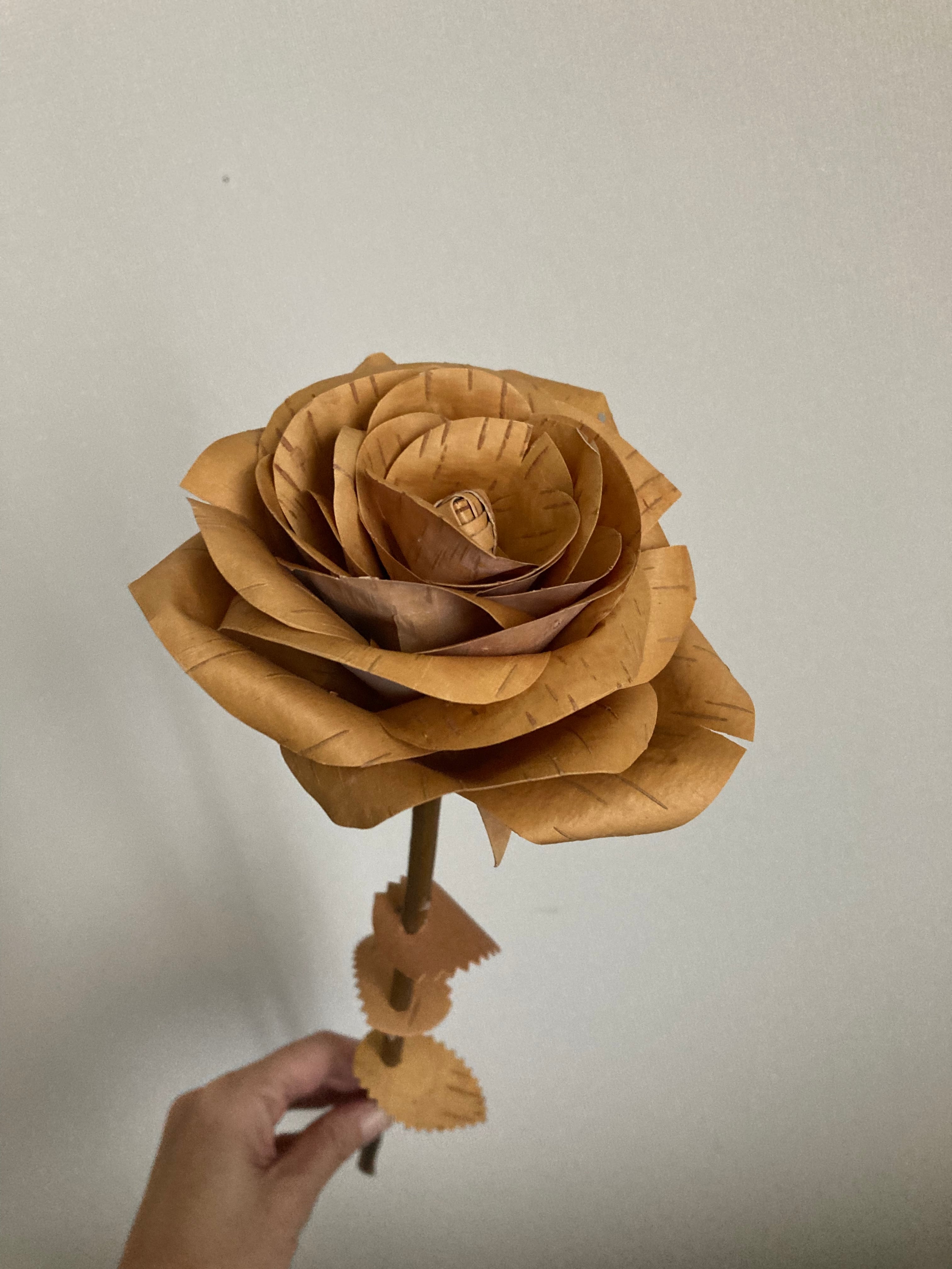 すっと伸びた長い枝に大ぶりな白樺の樹皮が重なった薔薇の花びらの細工がとても素敵な一品♫