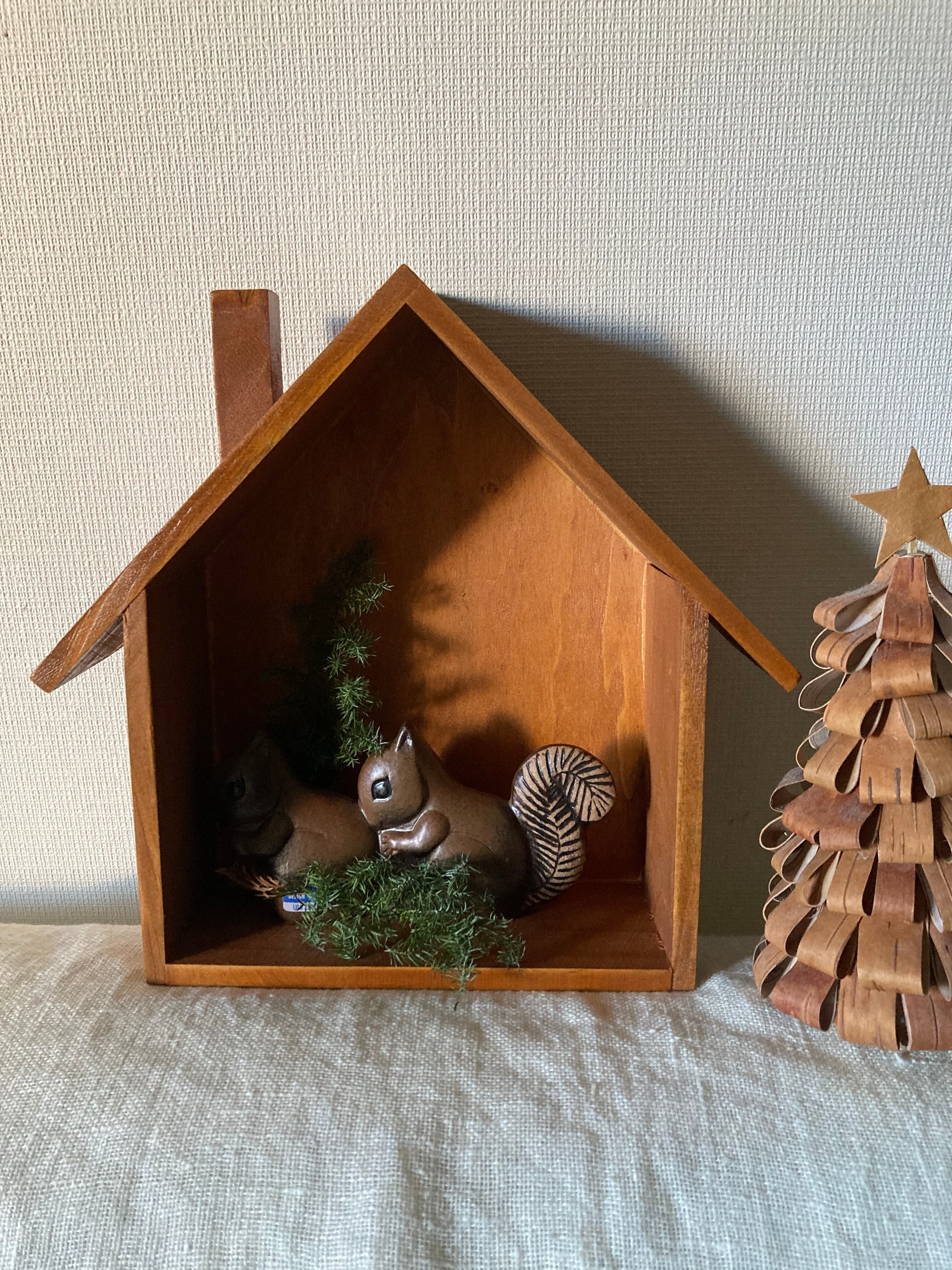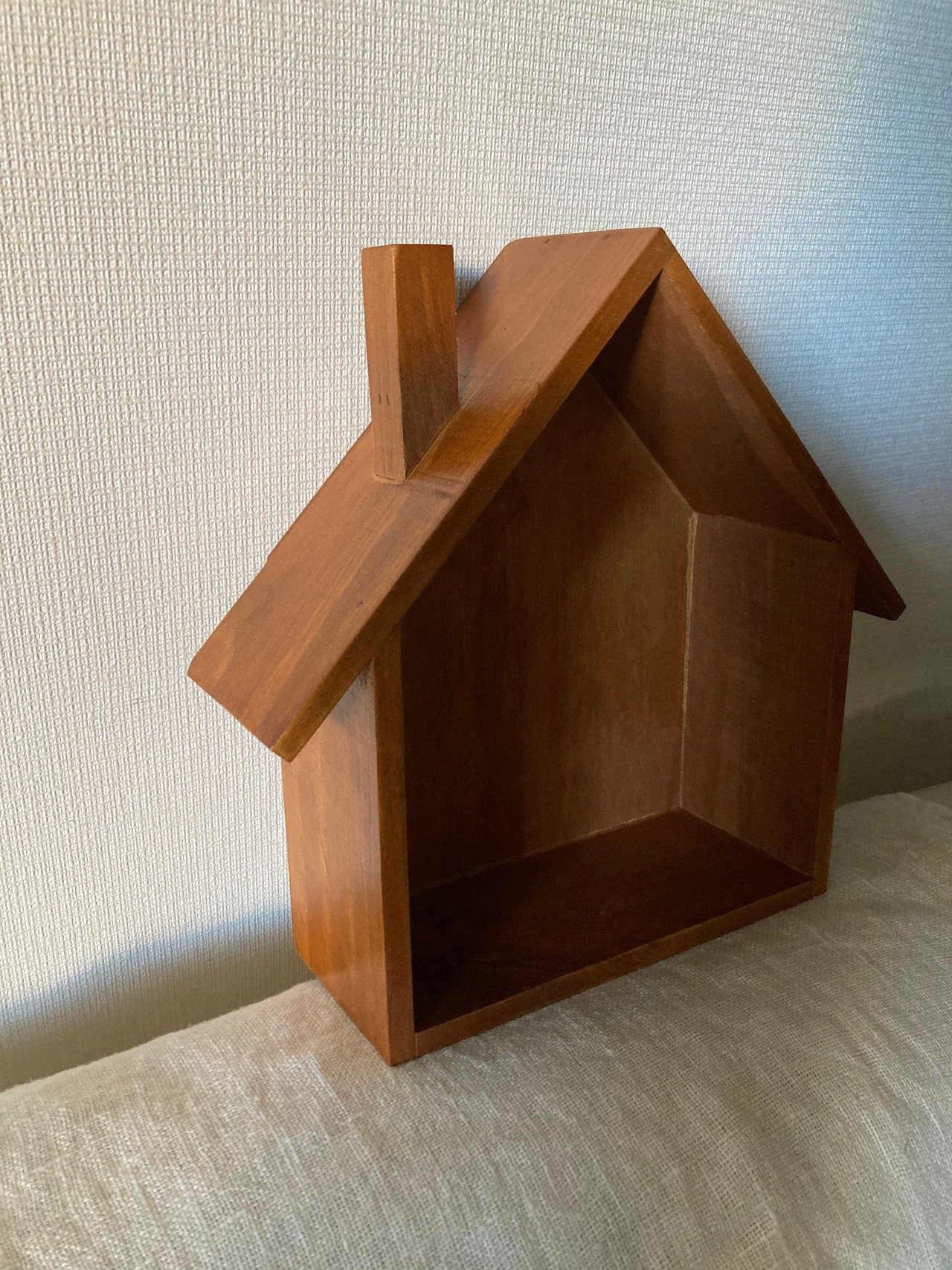ナチュラルな木のおうち型壁かけの飾り棚になります。