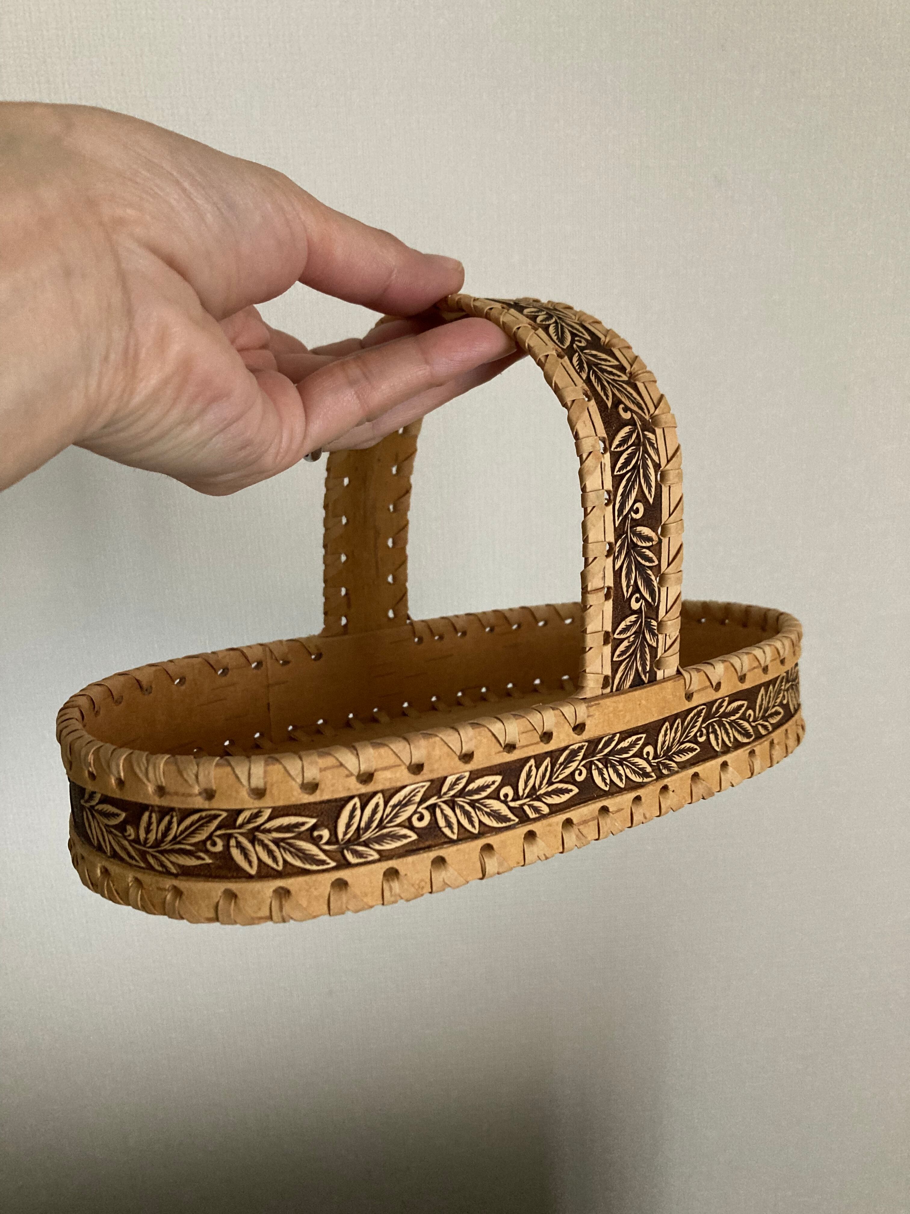 ロシアの白樺細工、葉っぱの型押しの持ち手付きバスケットです。