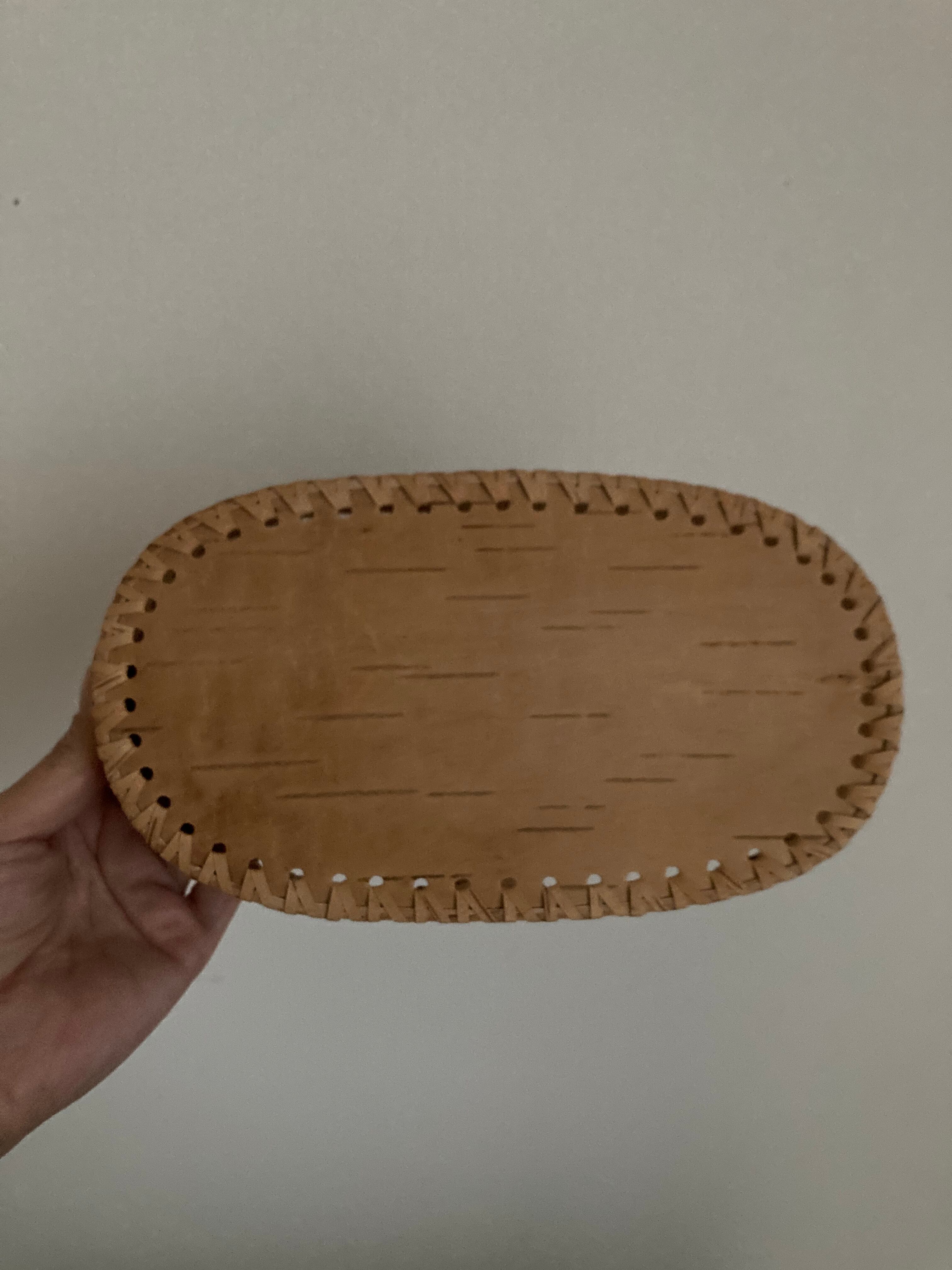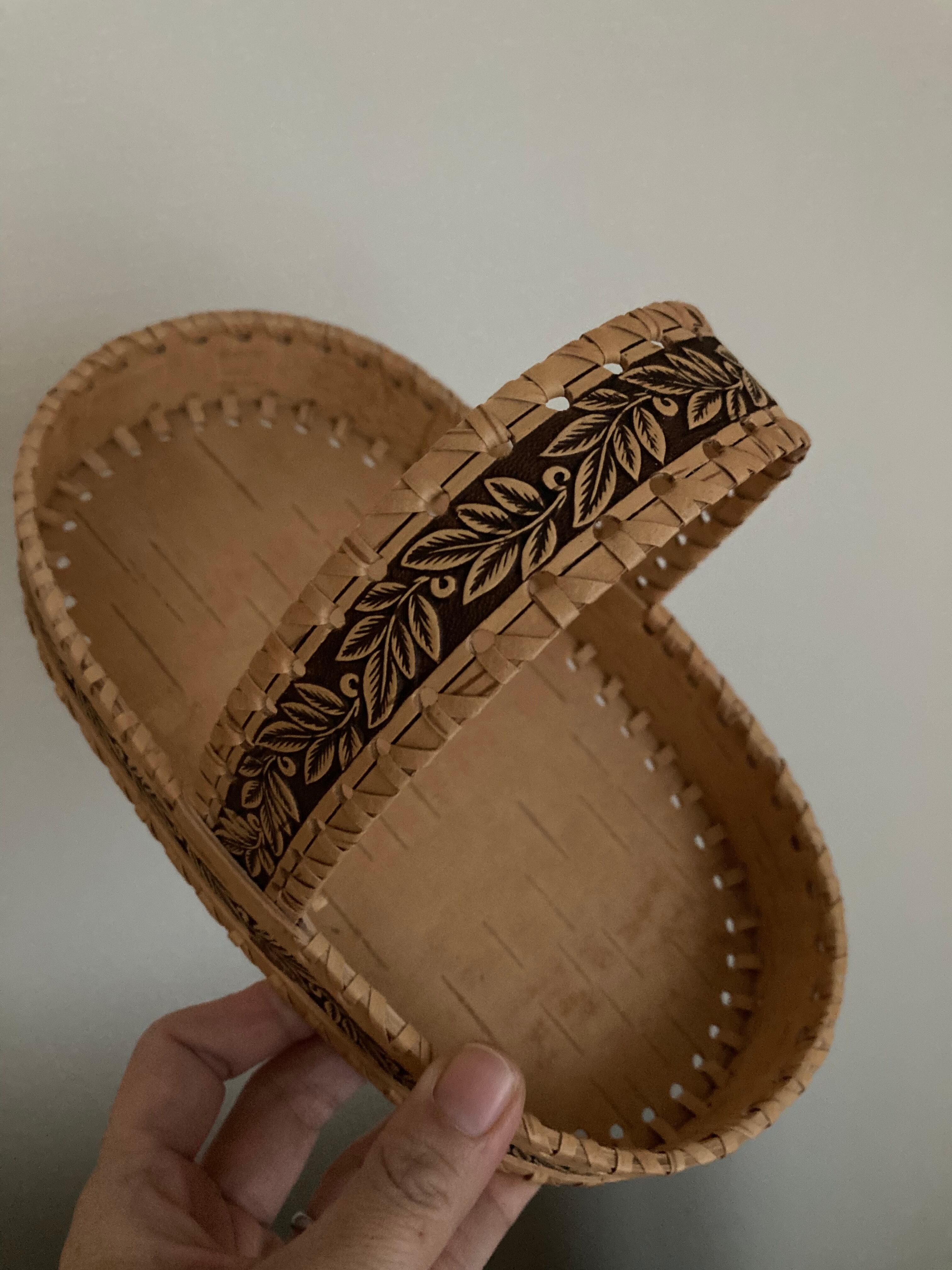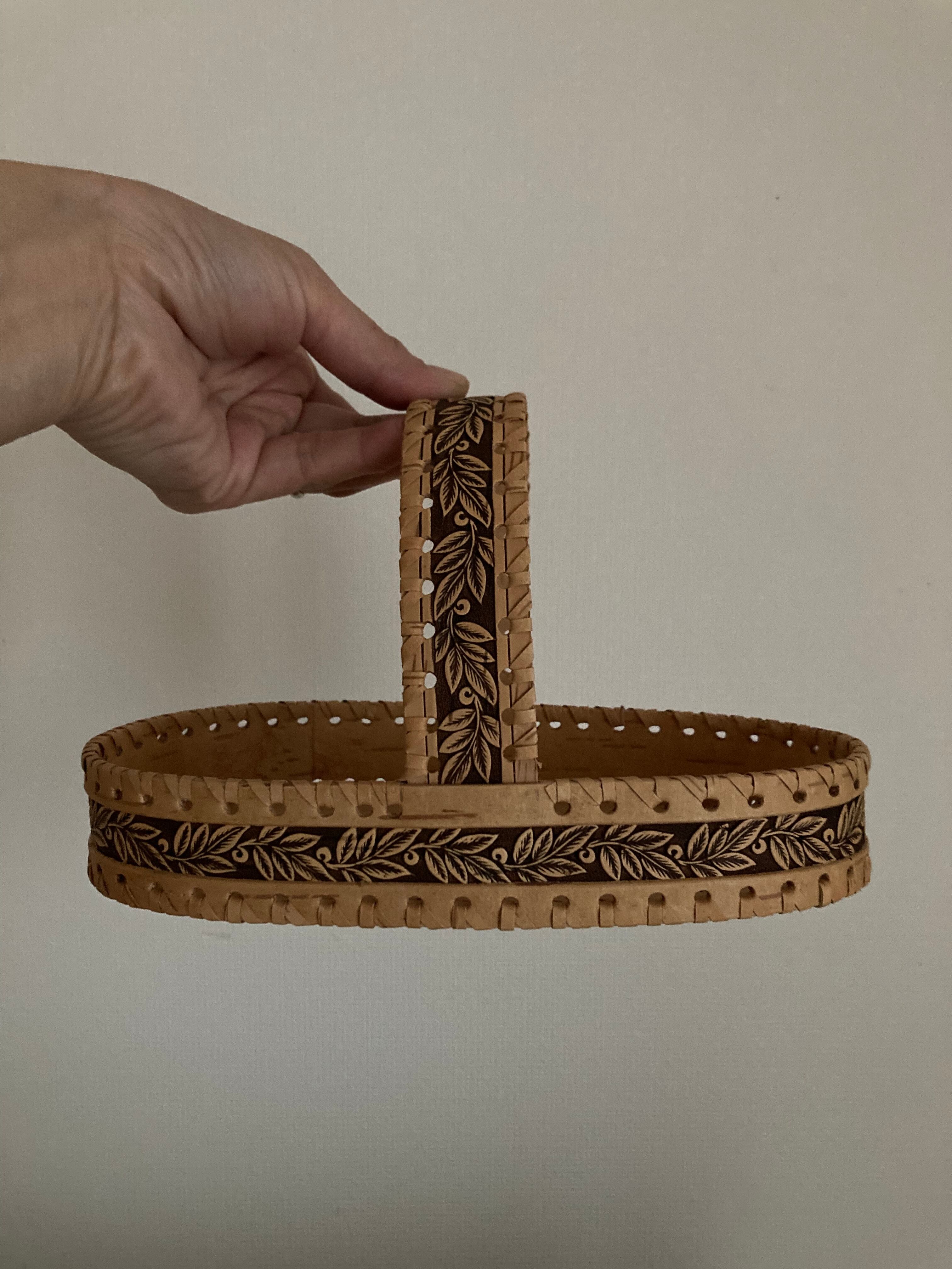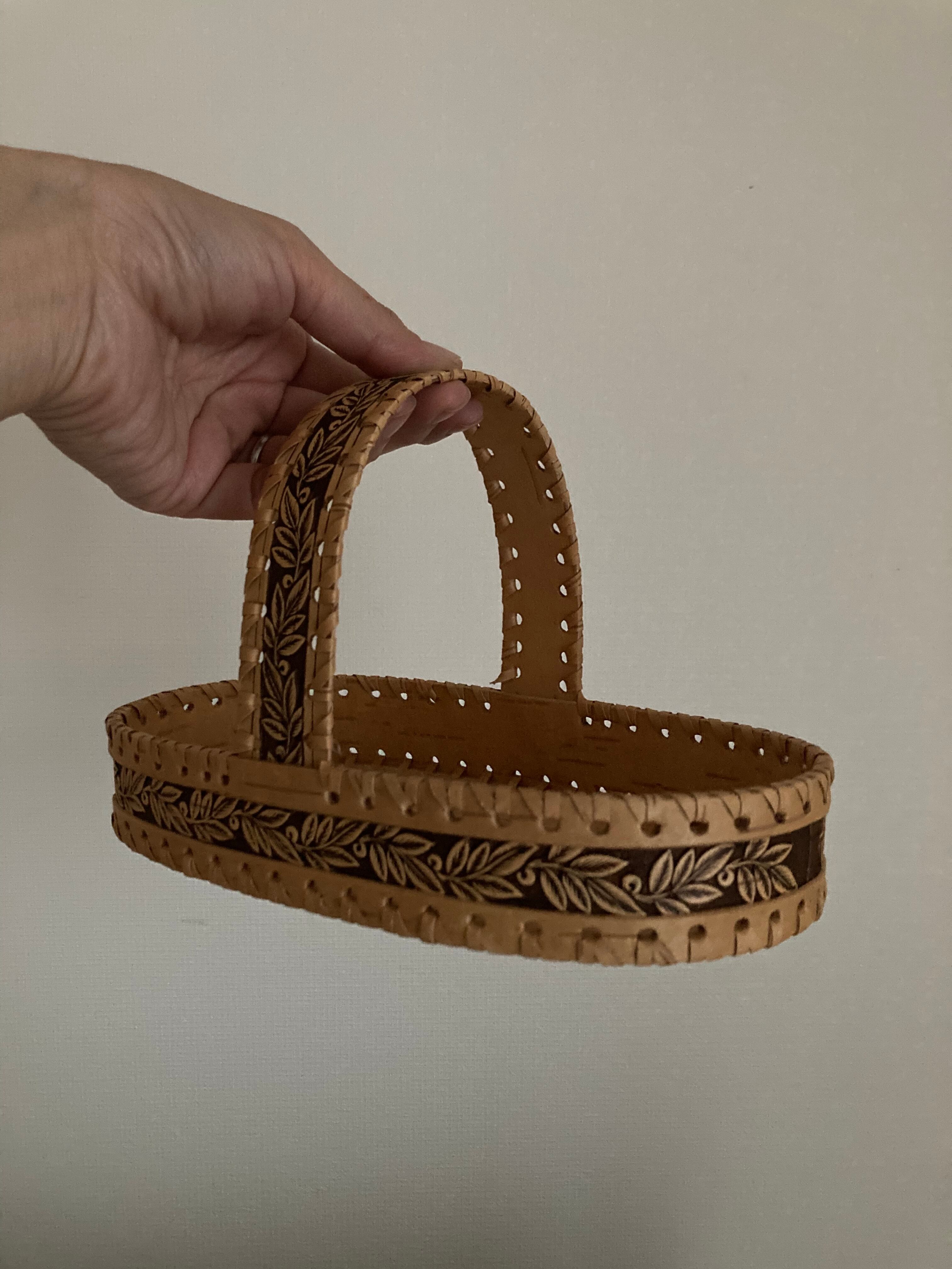 ロシアの白樺細工、葉っぱの型押しの持ち手付きバスケットです。