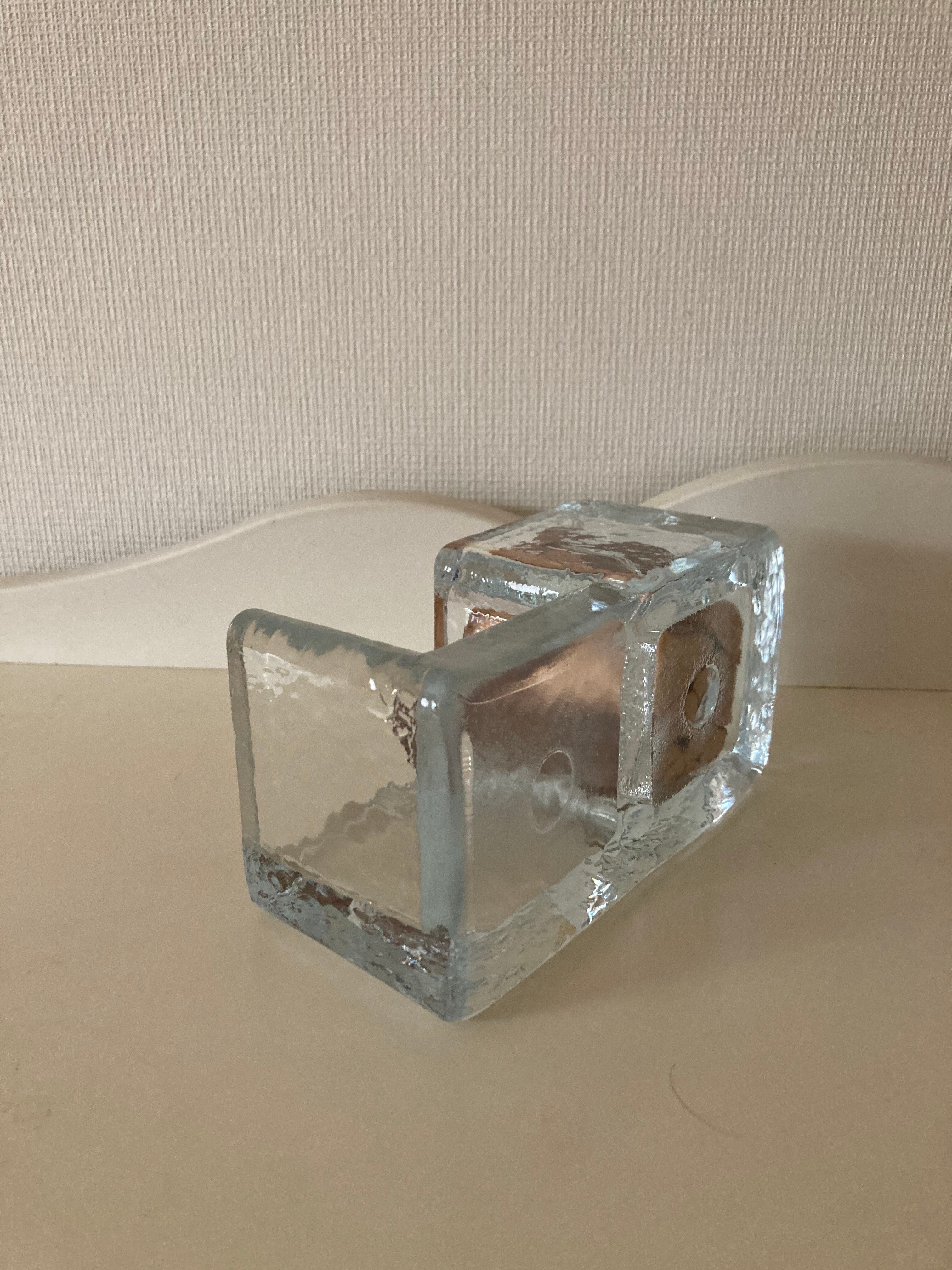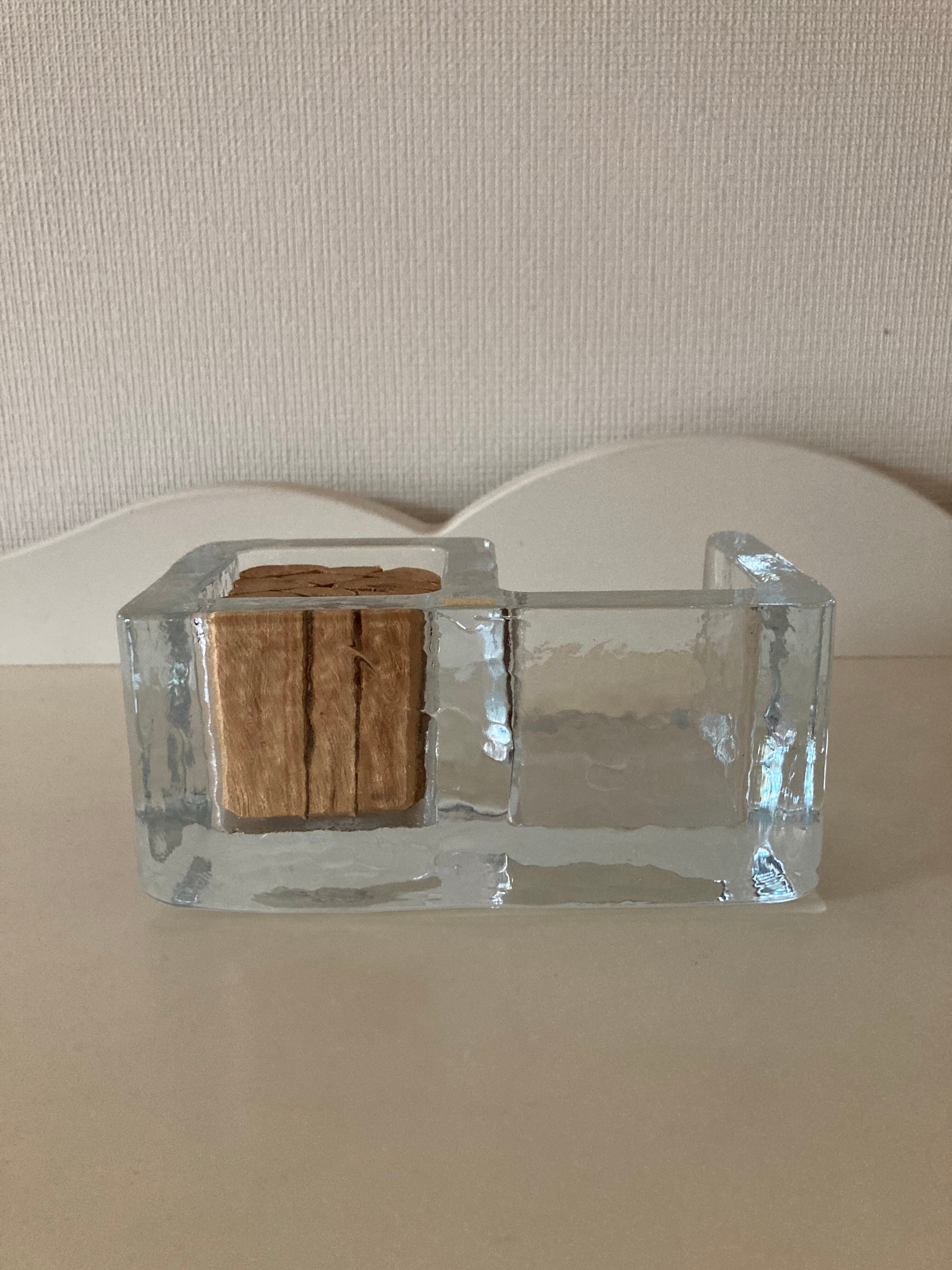 ずっしりとした厚みのあるクリアガラスに、右側にはジュニパーの木、左にはキャンドルホルダーを置くスペースがあり、キャンドルを灯すと、まるで小さな暖炉に火が灯ったようになります♫