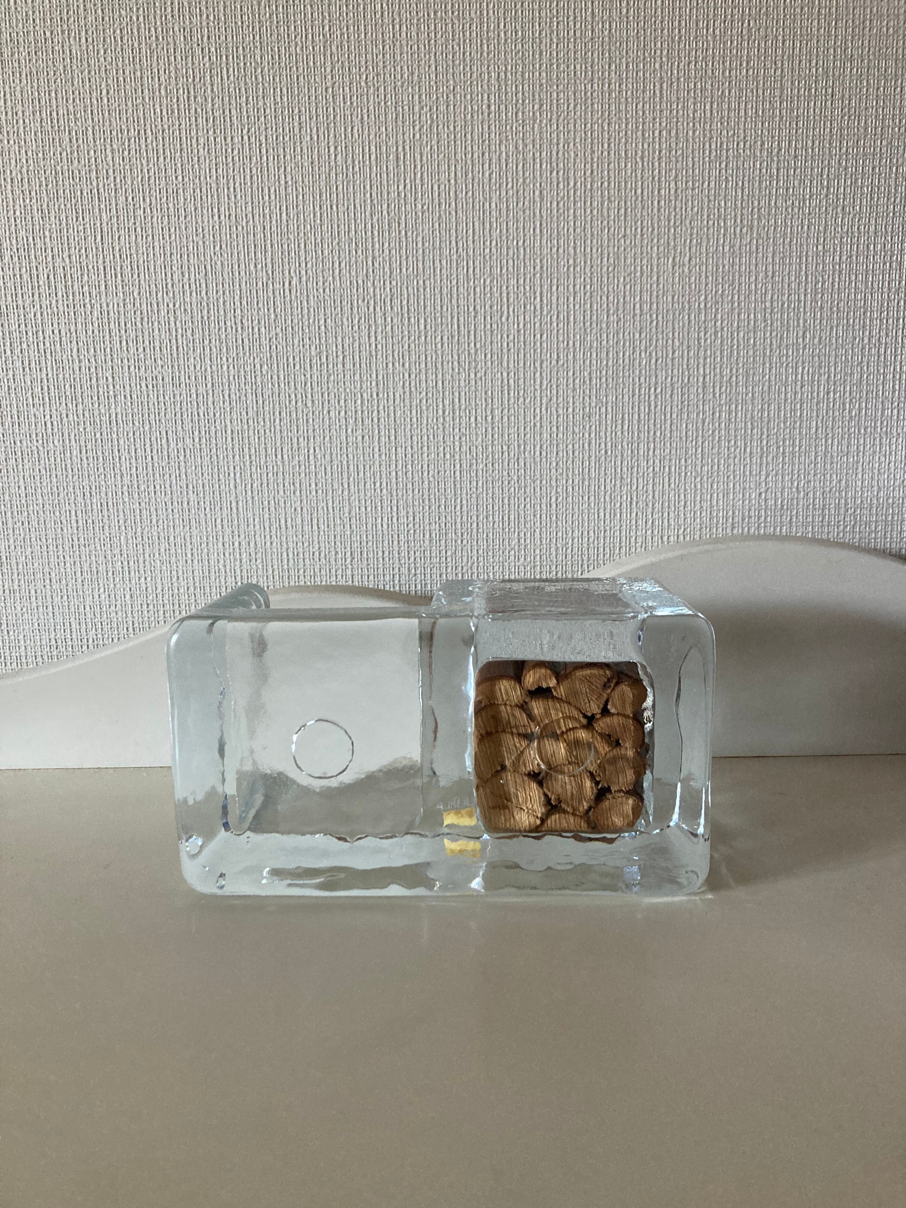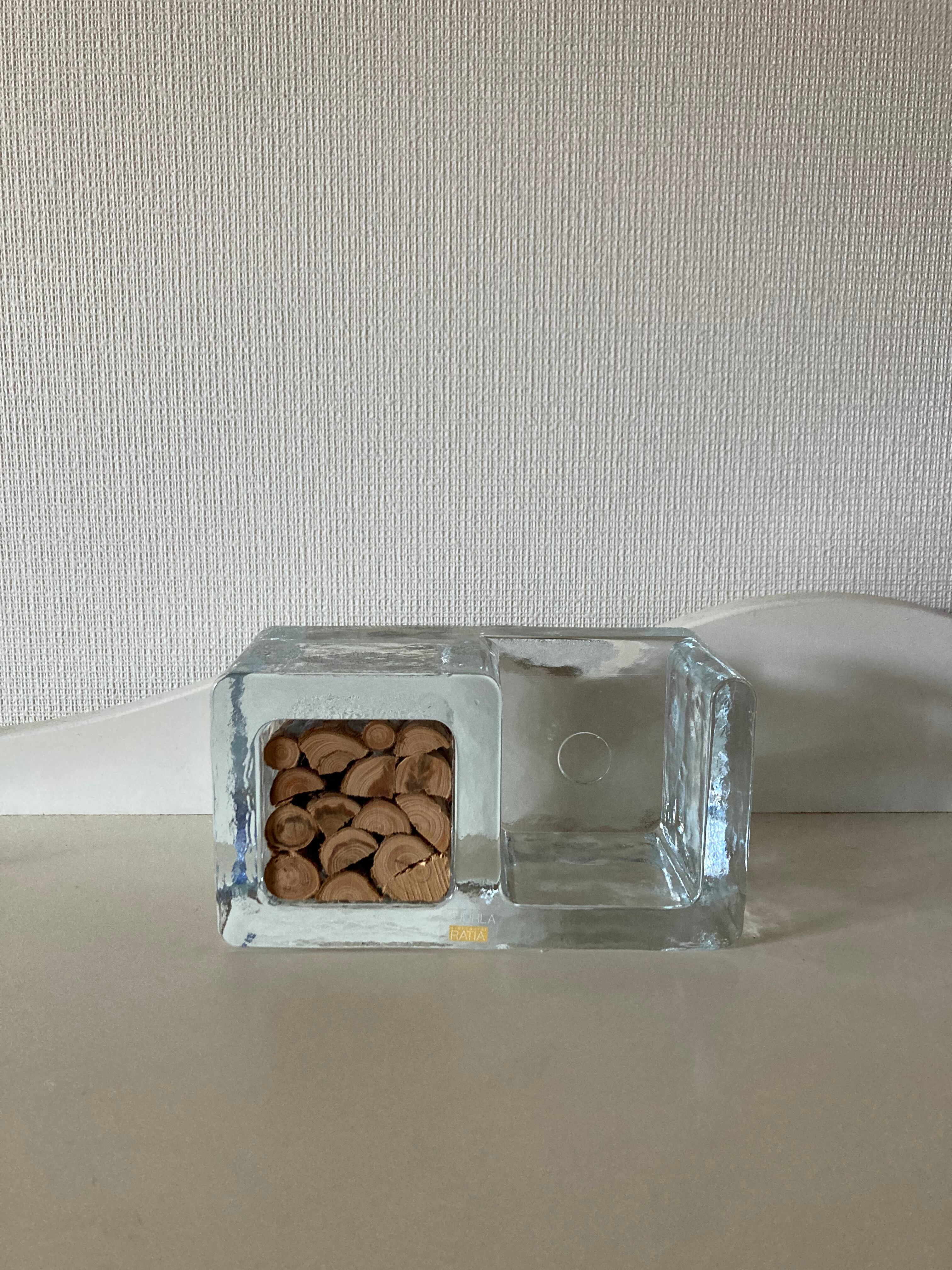 ずっしりとした厚みのあるクリアガラスに、右側にはジュニパーの木、左にはキャンドルホルダーを置くスペースがあり、キャンドルを灯すと、まるで小さな暖炉に火が灯ったようになります♫