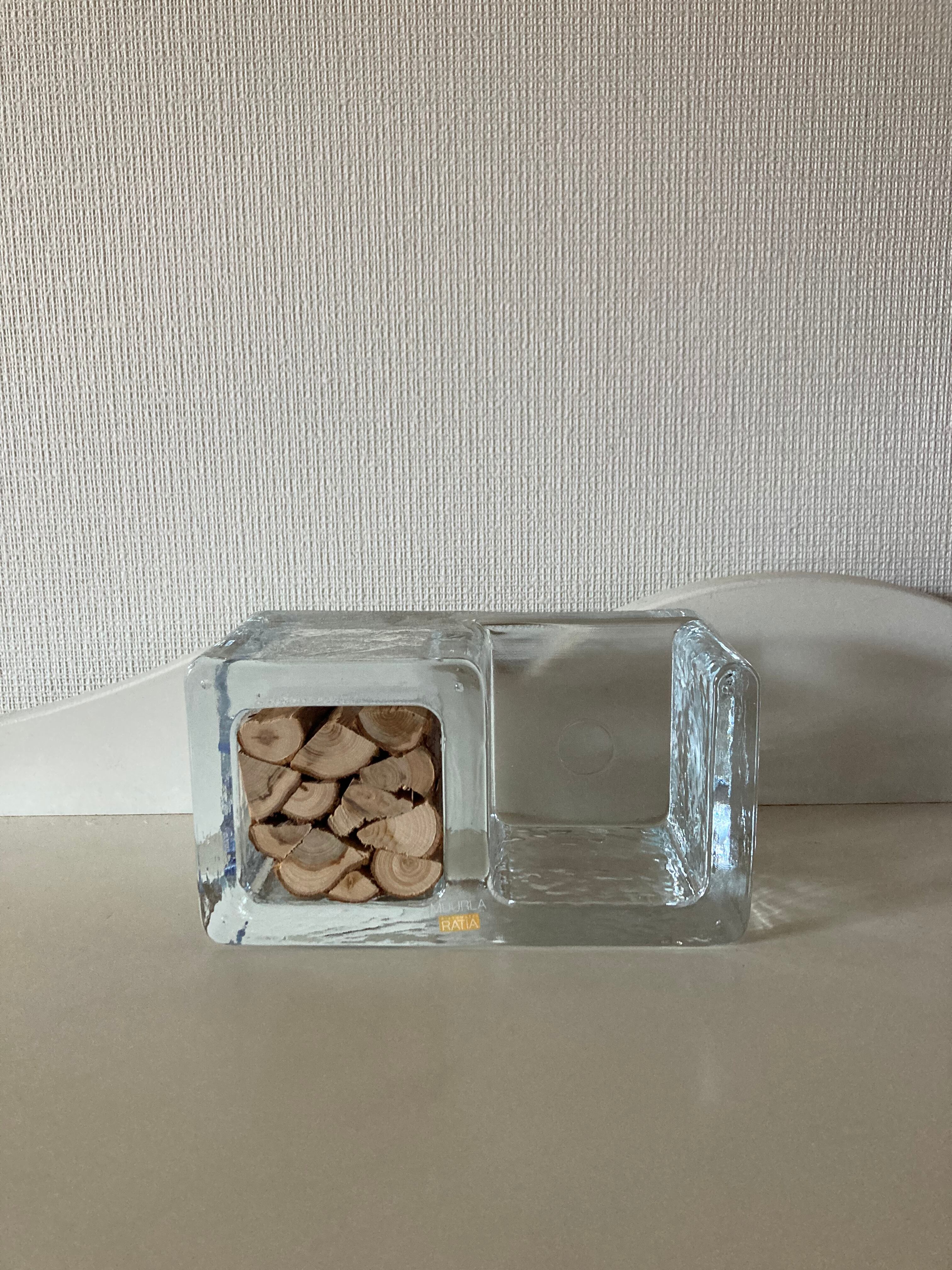 ずっしりとした厚みのあるクリアガラスに、右側にはジュニパーの木、左にはキャンドルホルダーを置くスペースがあり、キャンドルを灯すと、まるで小さな暖炉に火が灯ったようになります♫