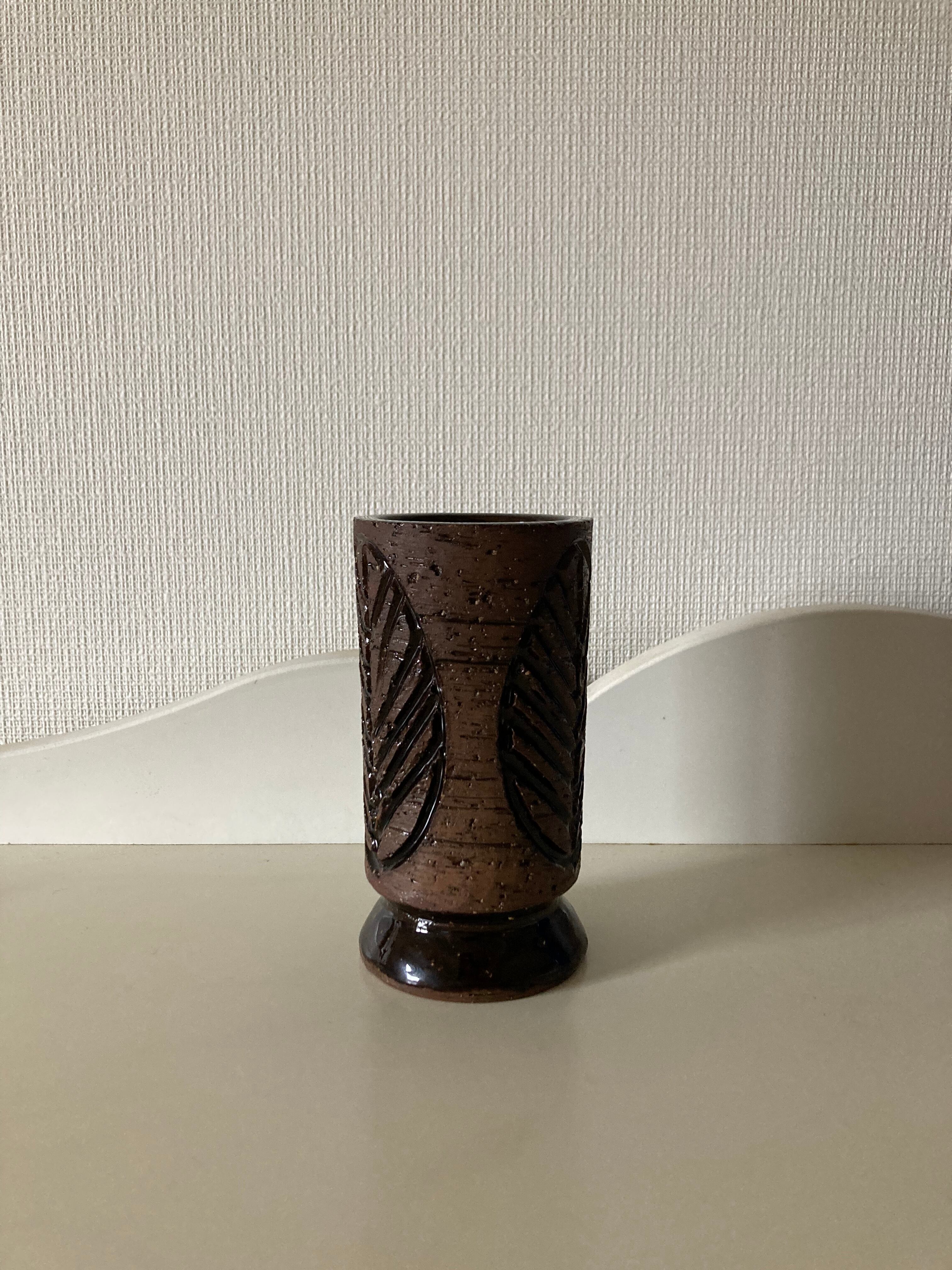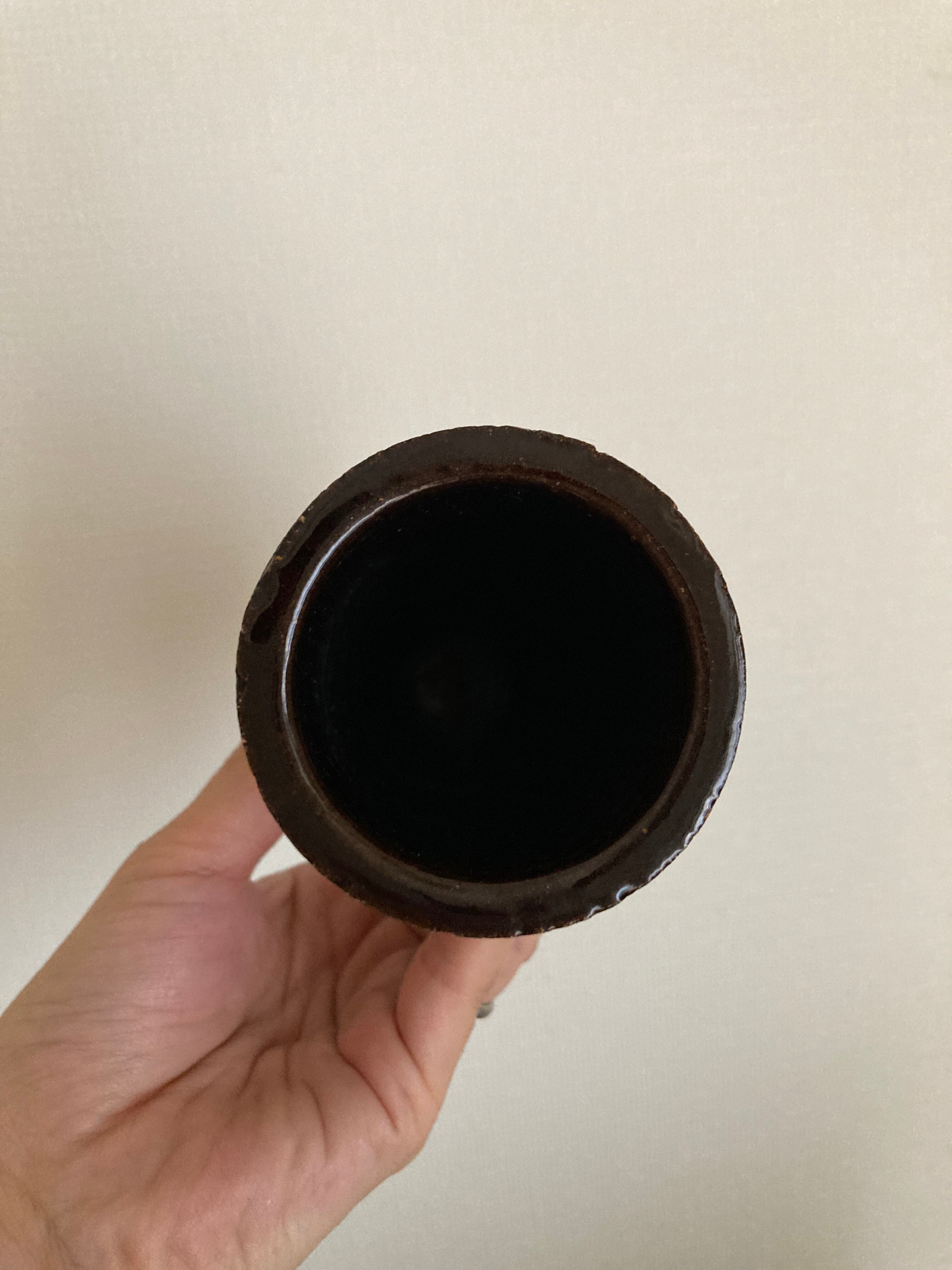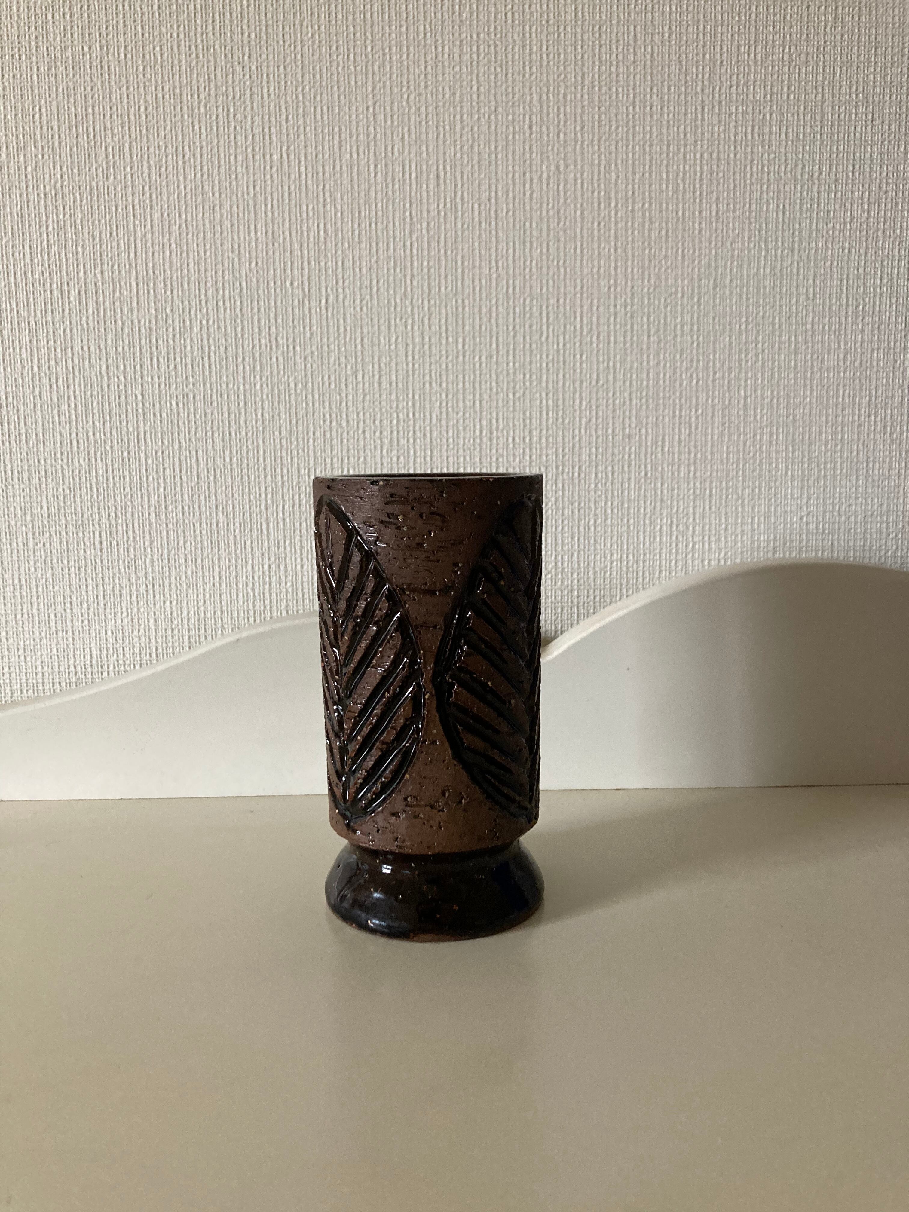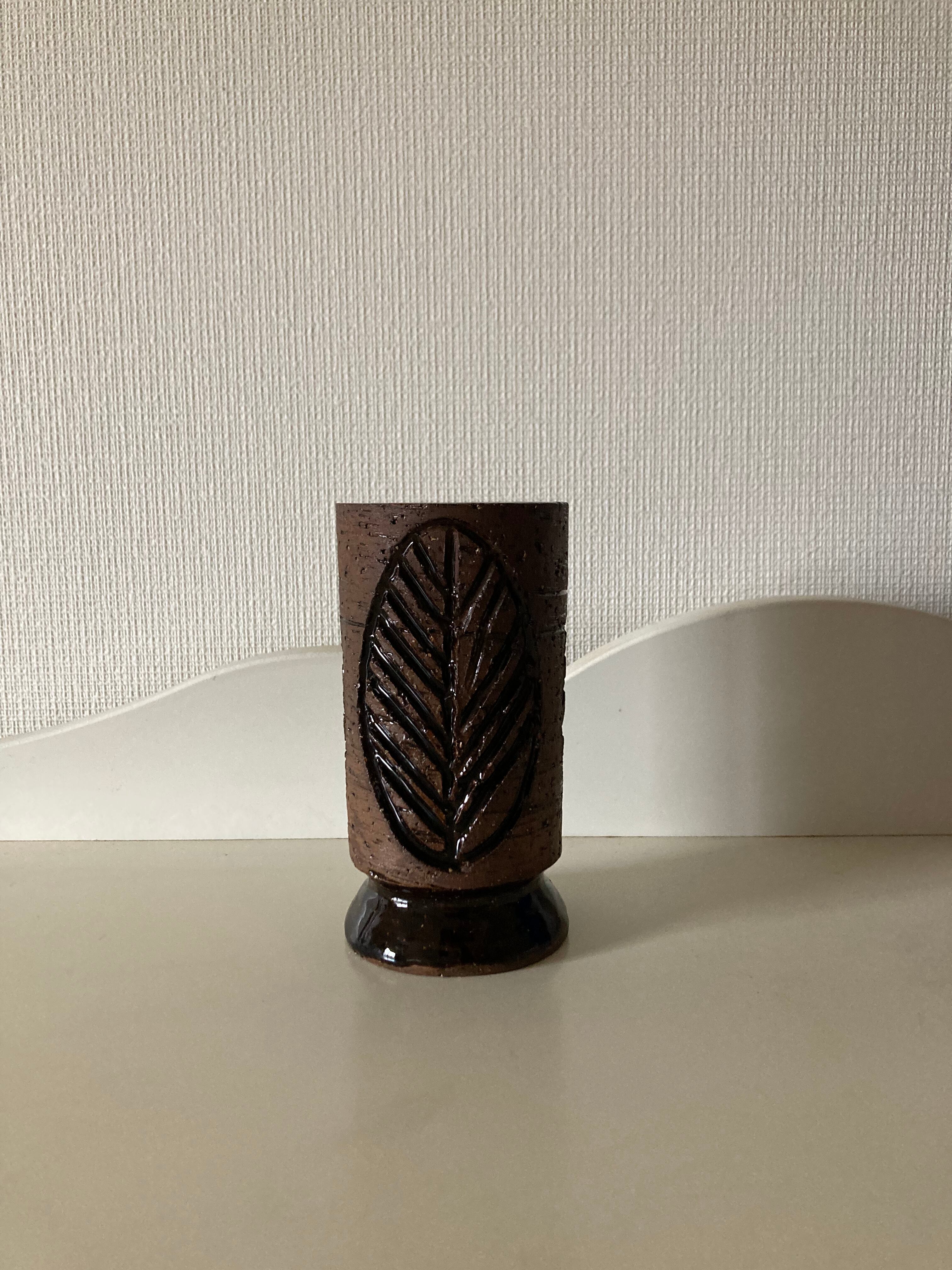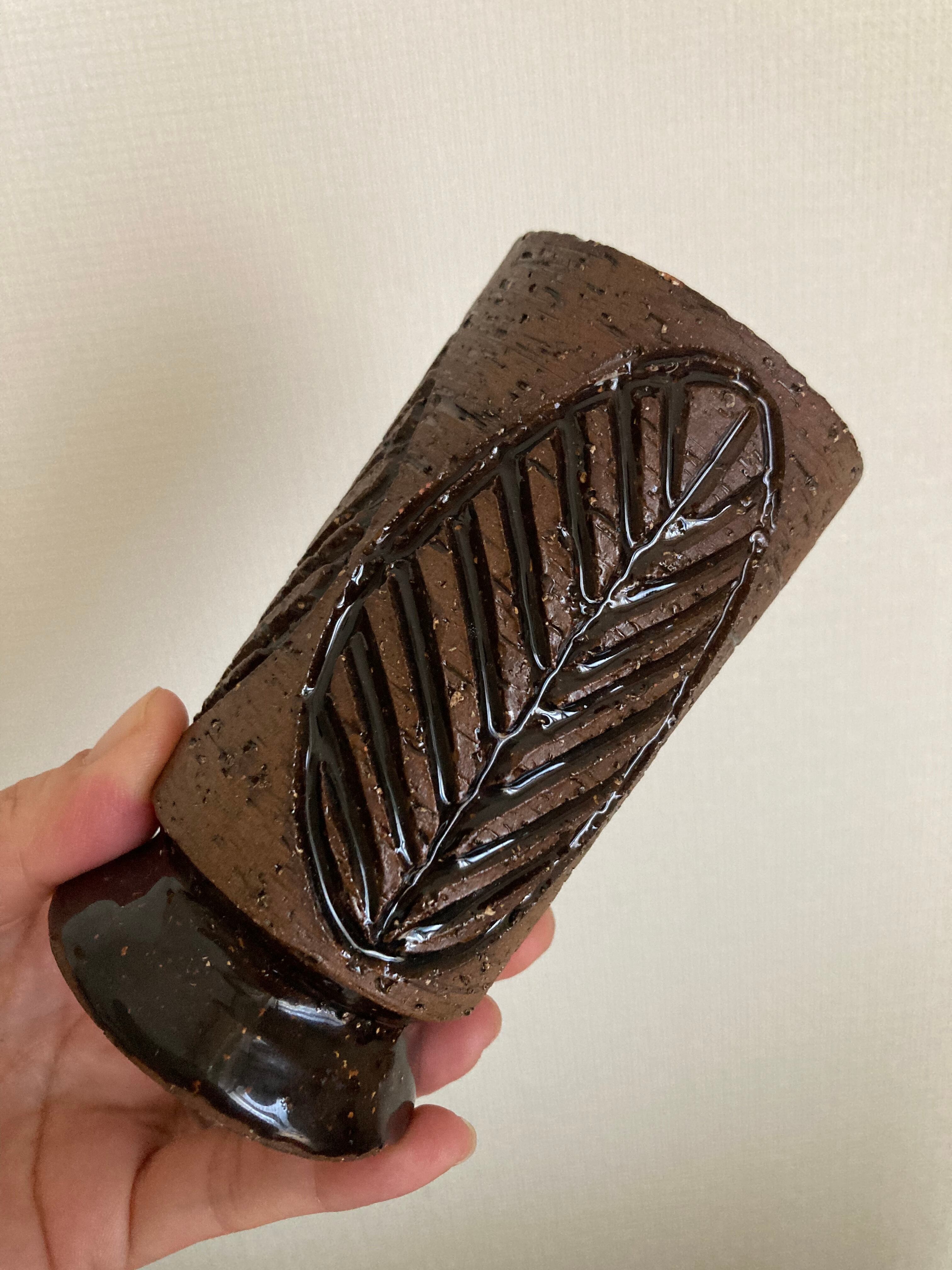 艶やかなブラウンの釉薬と素焼きのコントラストに、シンプルな葉っぱ柄が素敵なフラワーベース♫