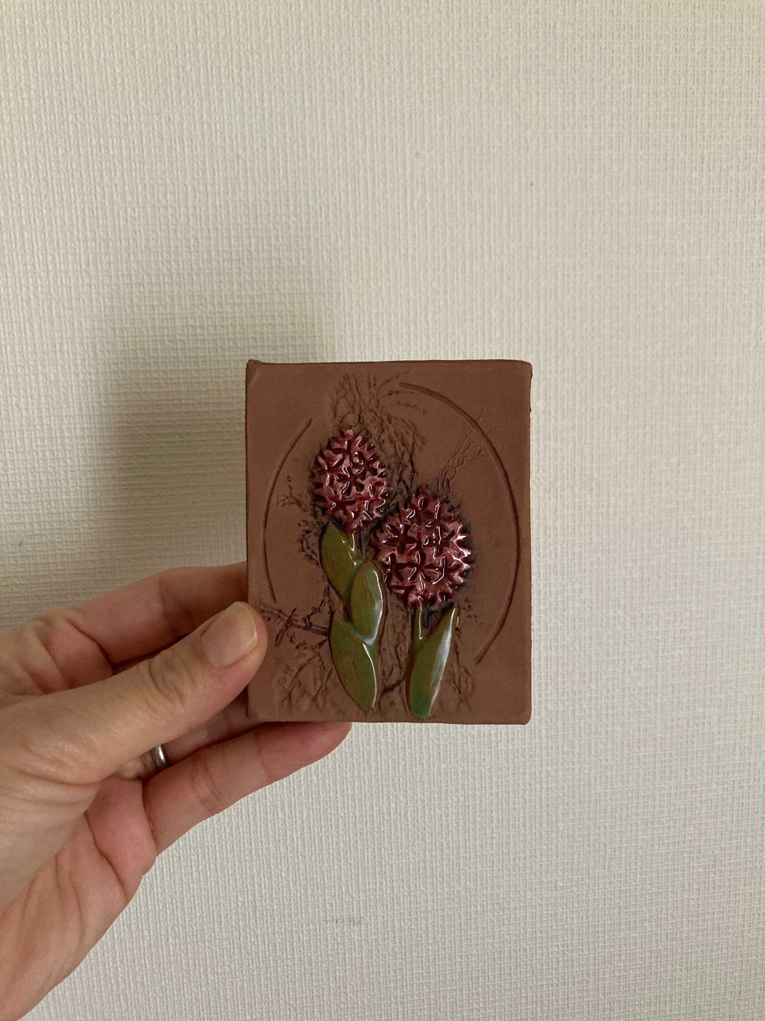 素焼きをベースに、ヒヤシンスに似たスウェーデンのお花、ブリンキュラの落ち着いたピンクの色味がシックで可愛らしい1枚。