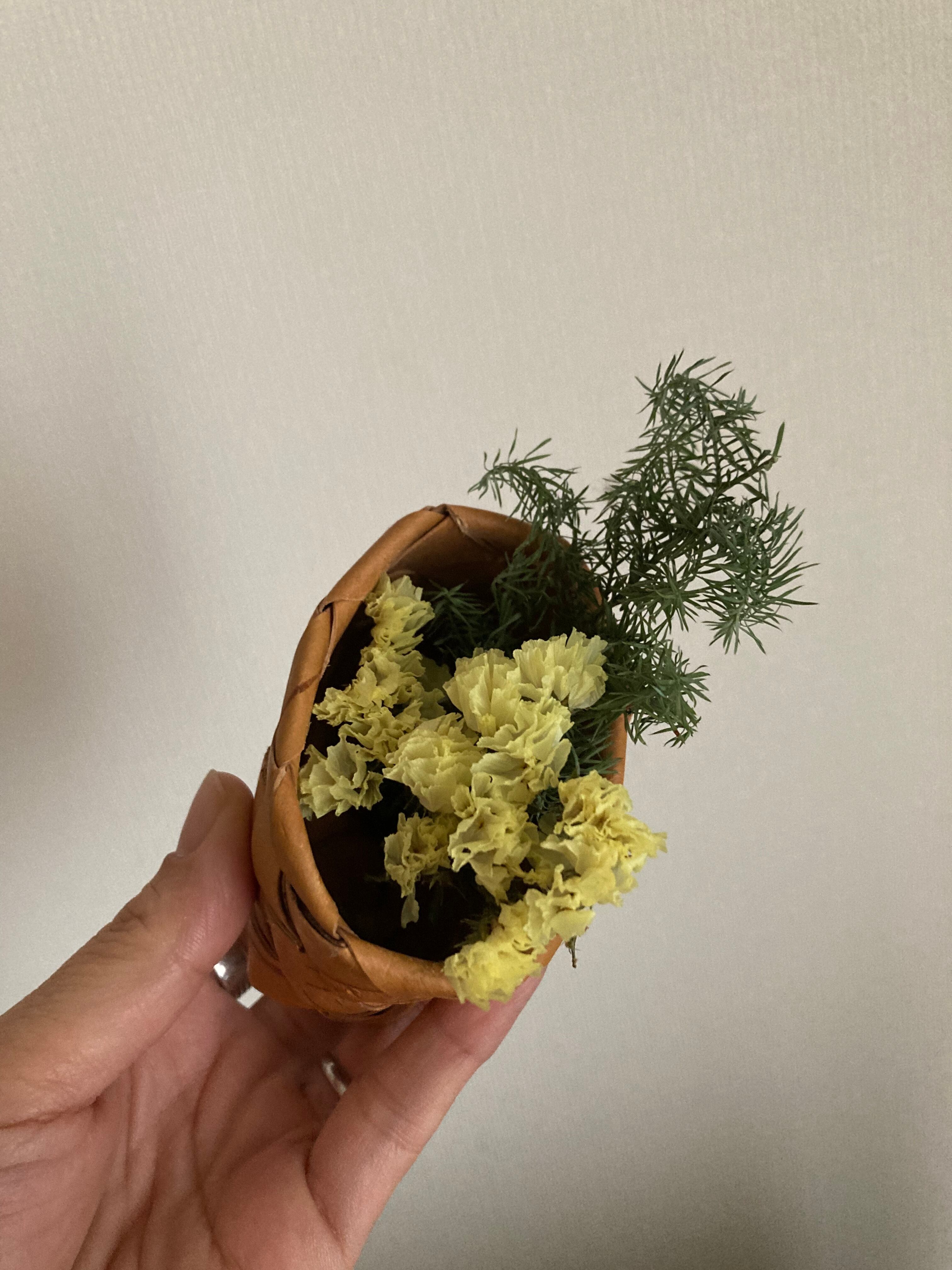 小さめのお人形を入れたり、ドライフラワーなどを入れて、ちょこっと飾ると素敵なかごです♫
