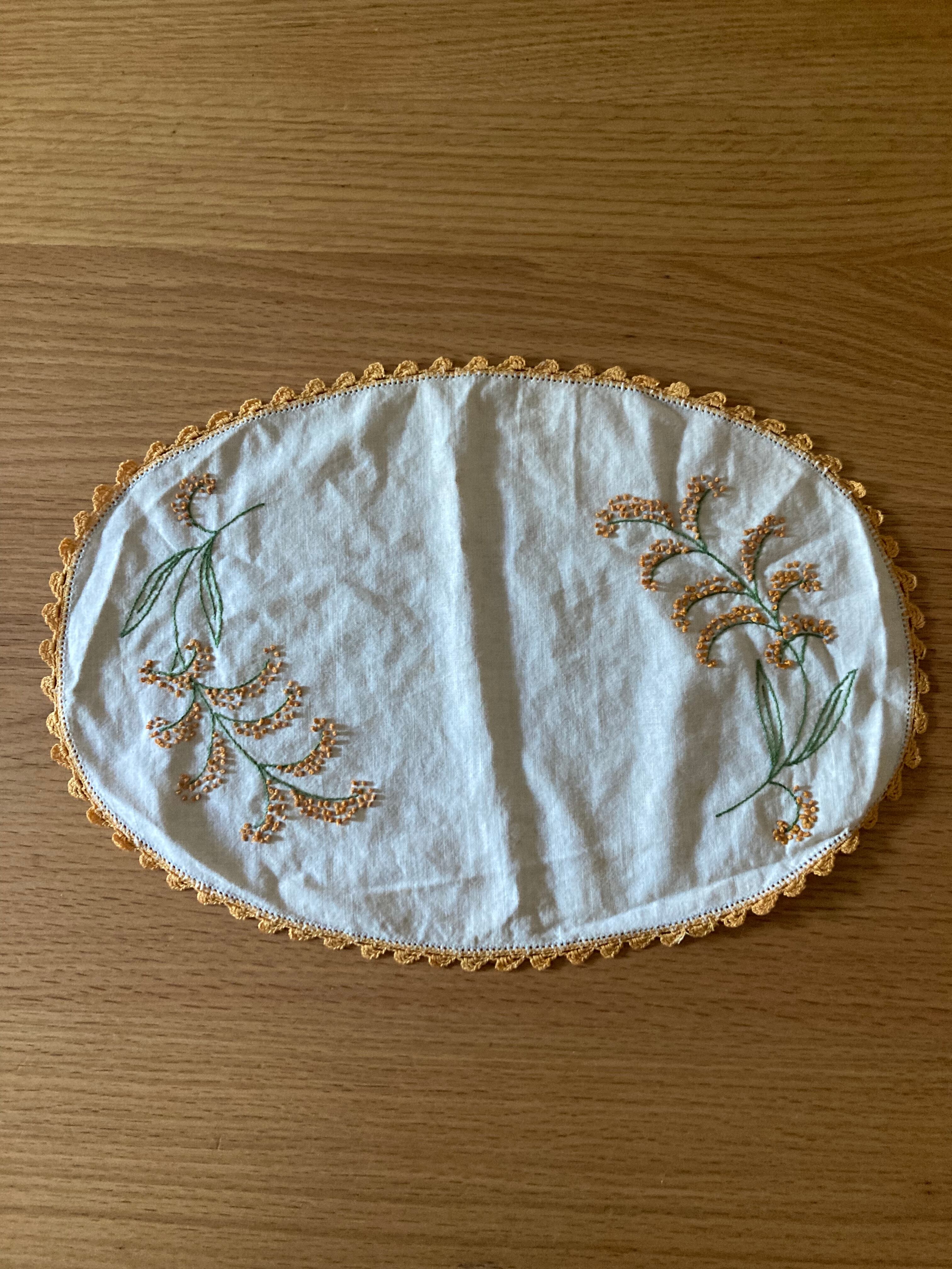 フランス ミモザ刺繍の楕円型クロス ヴィンテージ