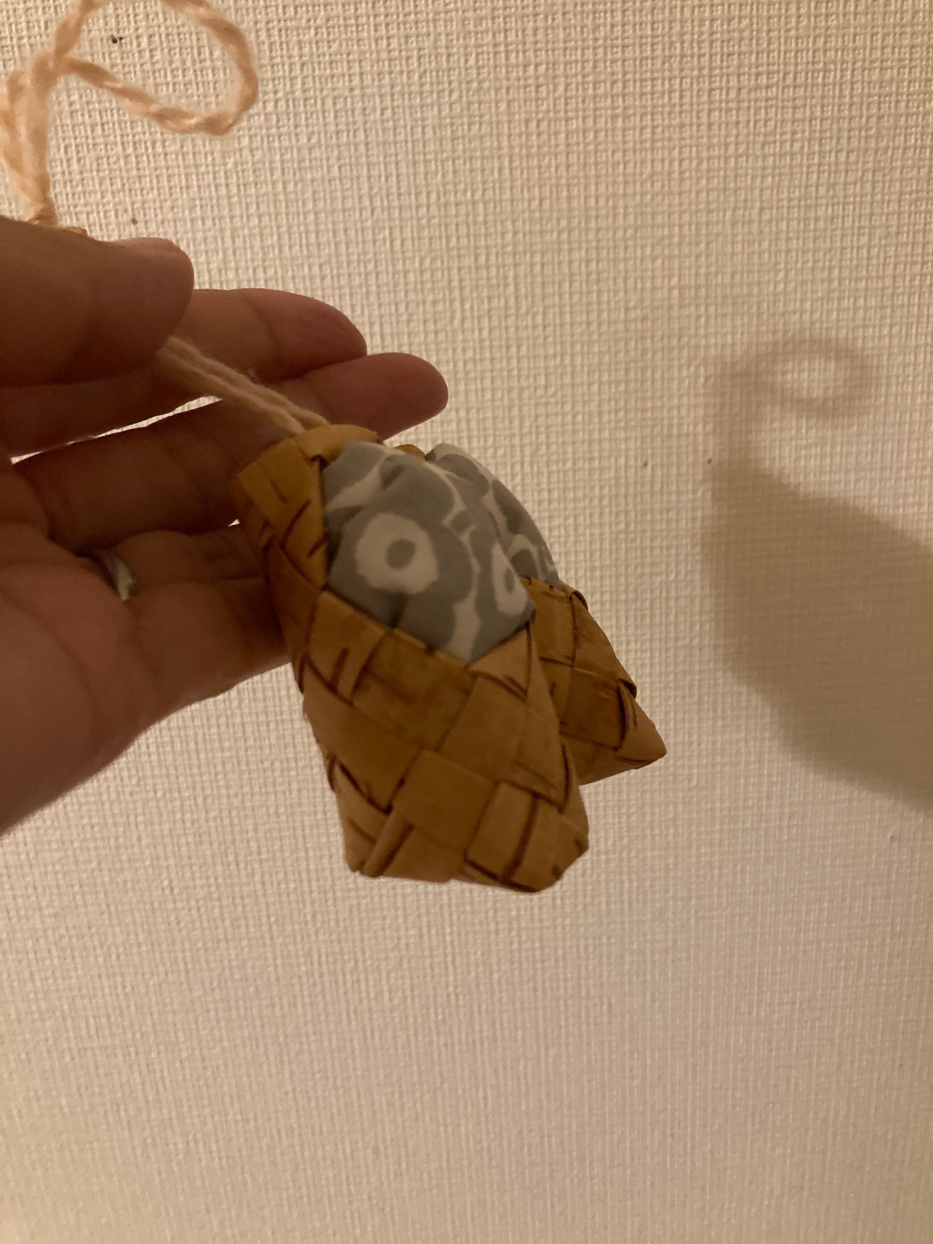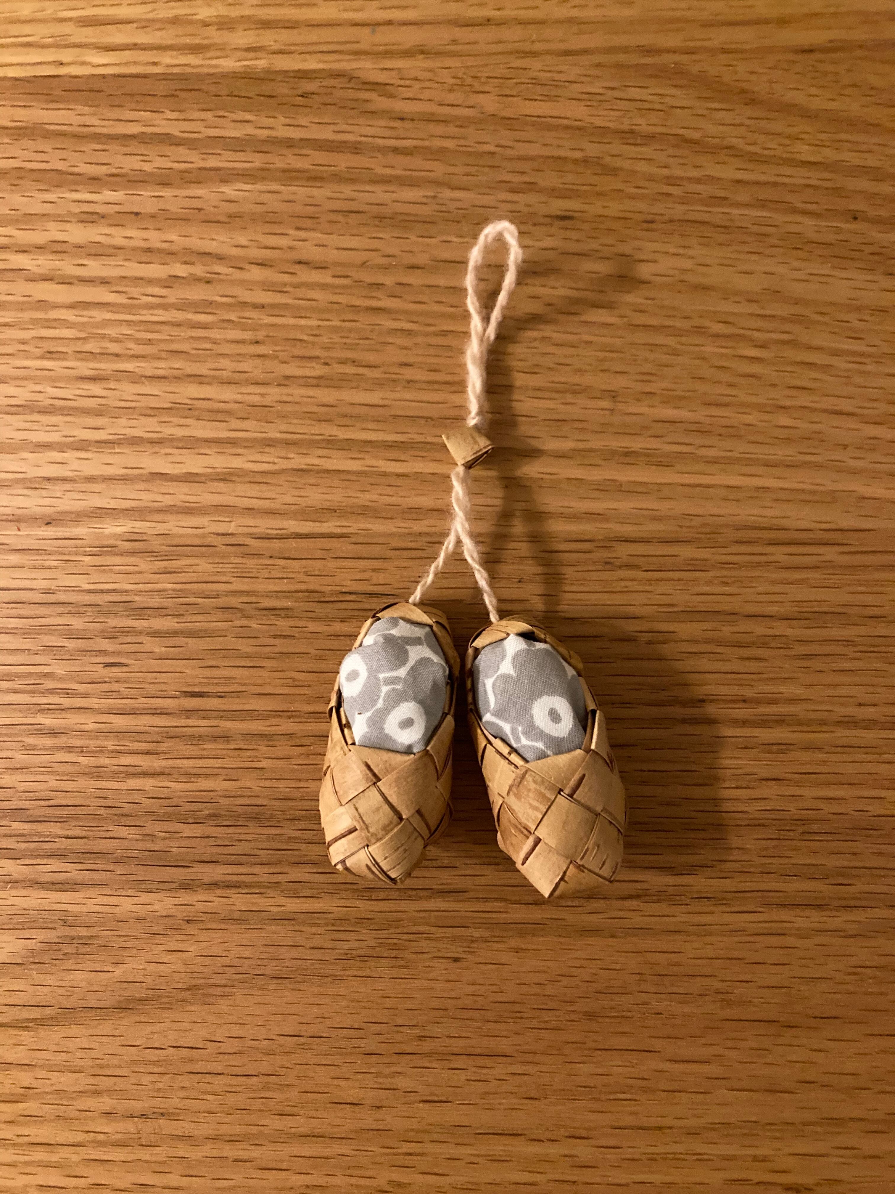 ロシアの白樺細工の職人さんが作った白樺の靴のオーナメントに、ヴィンテージのマリメッコのハギレ生地(ピックイネンウニッコ)を合わせたオーナメント♫(キルト芯をクシュっとしたものにハギレ生地を被せて入れています。特に縫ったりはしてないので、簡単に取り外し可能です)。
