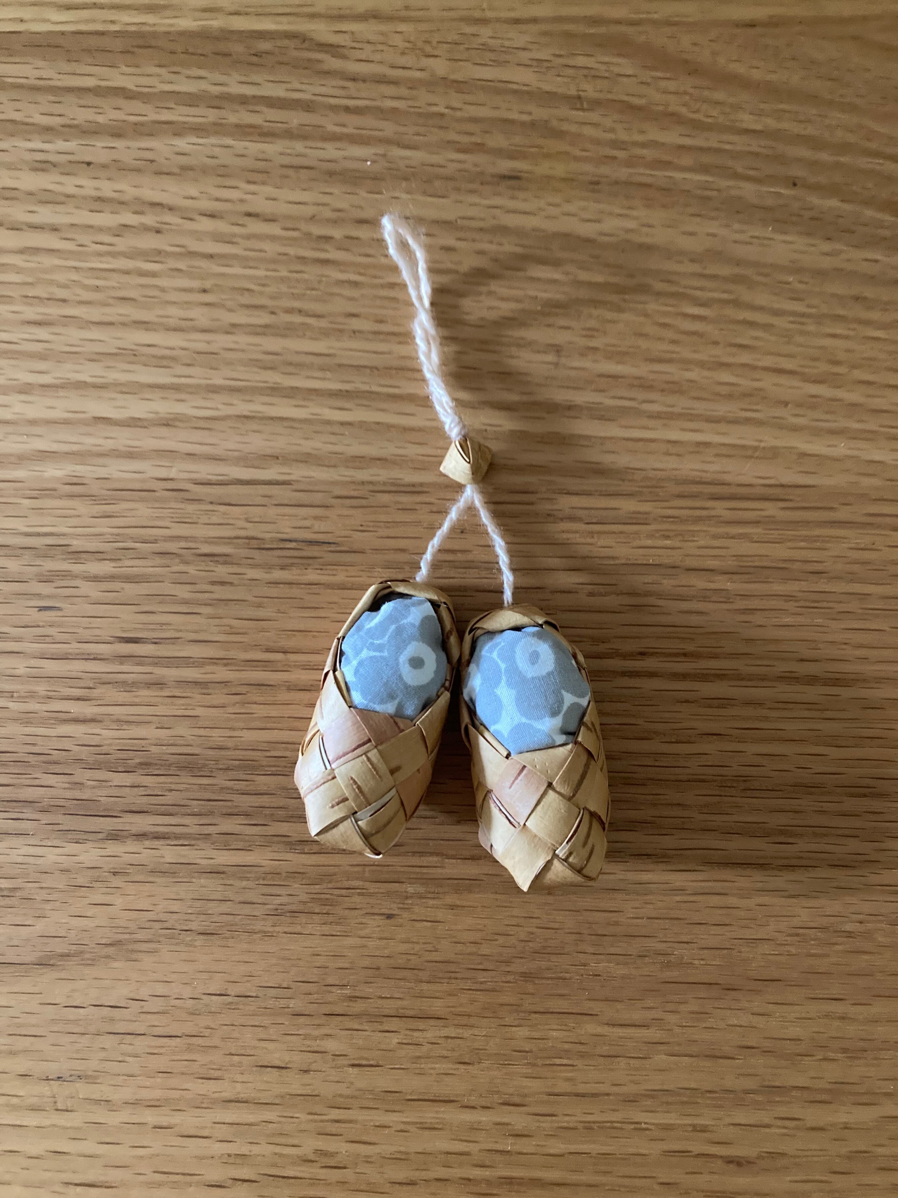 ロシアの白樺細工の職人さんが作った白樺の靴のオーナメントに、ヴィンテージのマリメッコのハギレ生地(ピックイネンウニッコ)を合わせたオーナメント♫(キルト芯をクシュっとしたものにハギレ生地を被せて入れています。特に縫ったりはしてないので、簡単に取り外し可能です)。