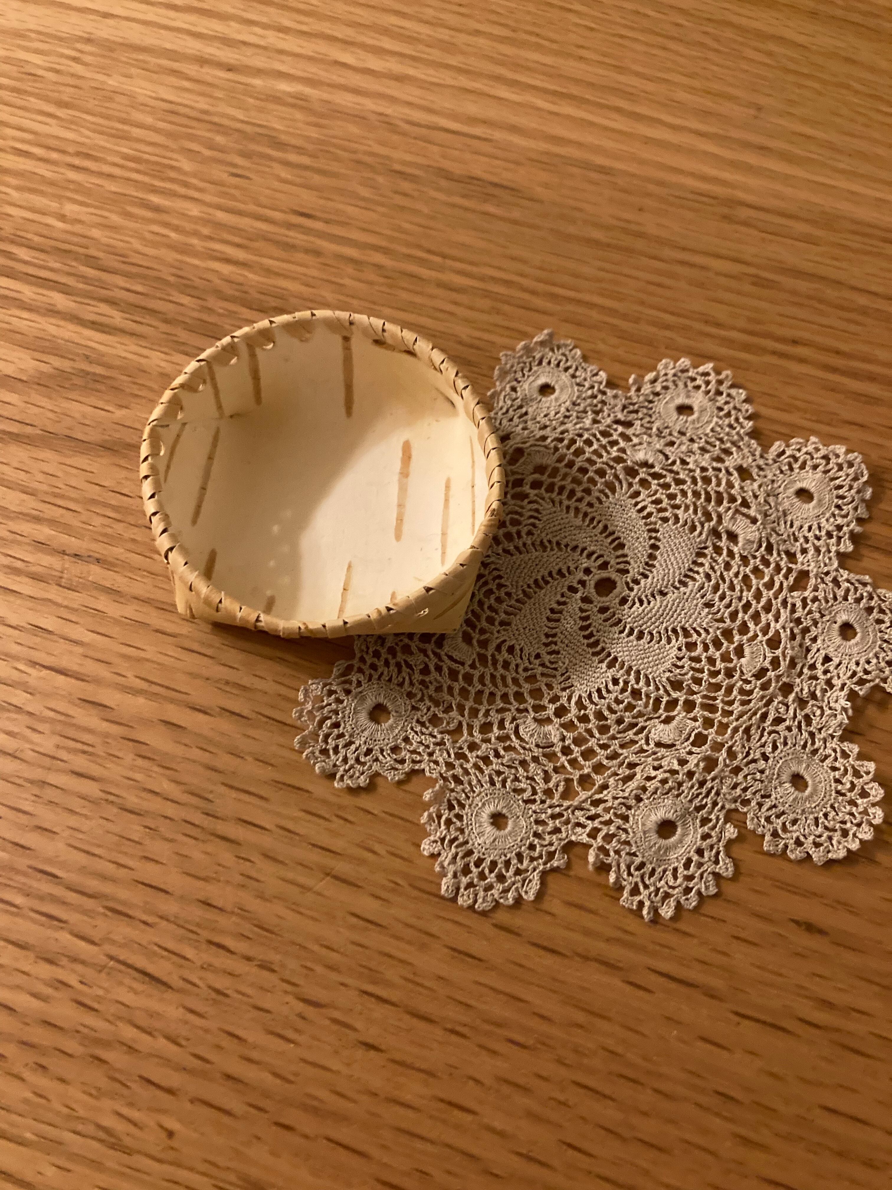 ロシア 白樺の一枚樹皮の小さなかご(マリメッコの生地との組み合わせ)