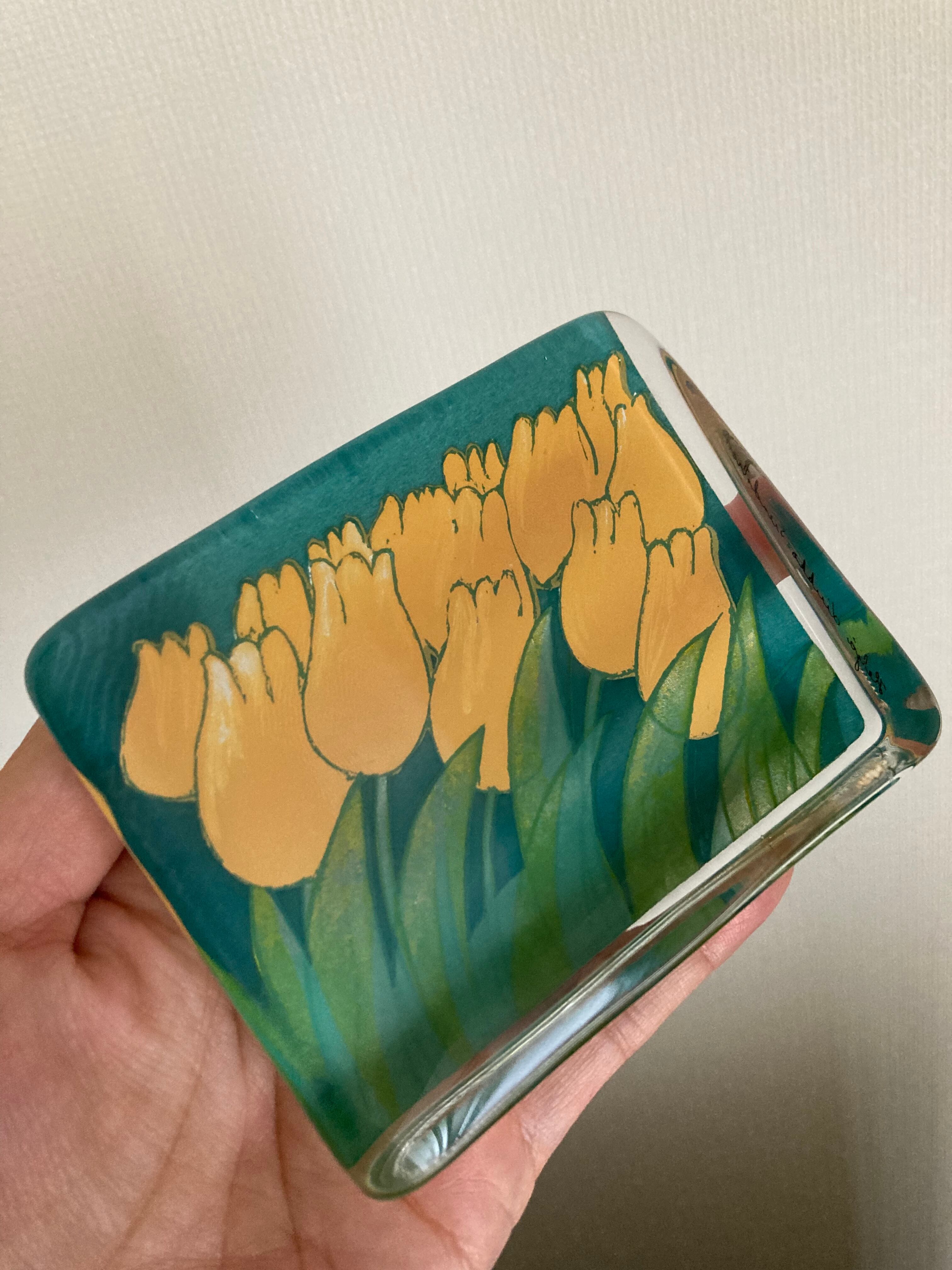 クリアなガラスに、黄色いチューリップが可愛らしいガラスカード。