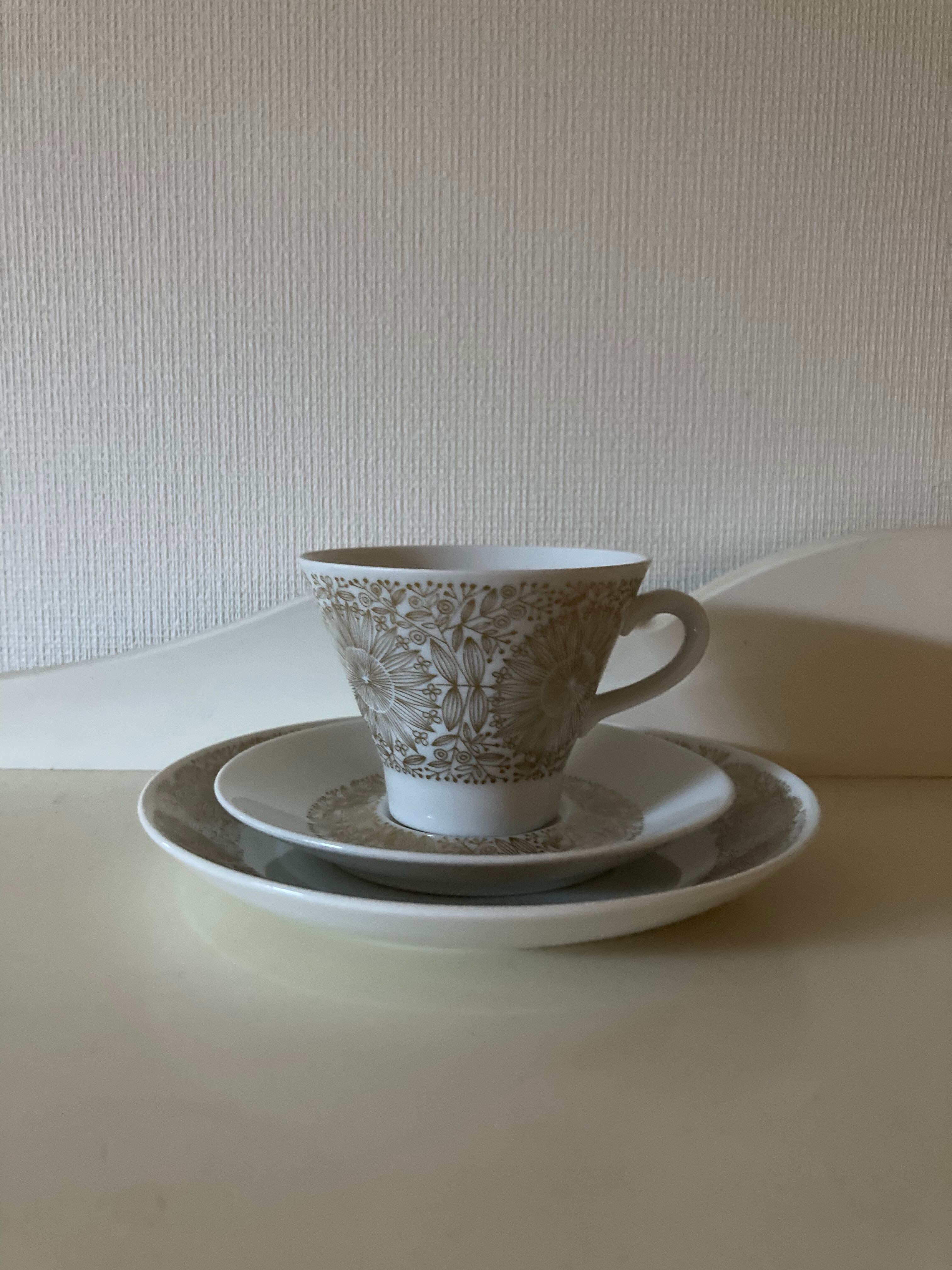 フィンランド、ARABIA社 のFirigranフィリグランのコーヒーカップ&ソーサー、ケーキプレートのトリオセットになります。