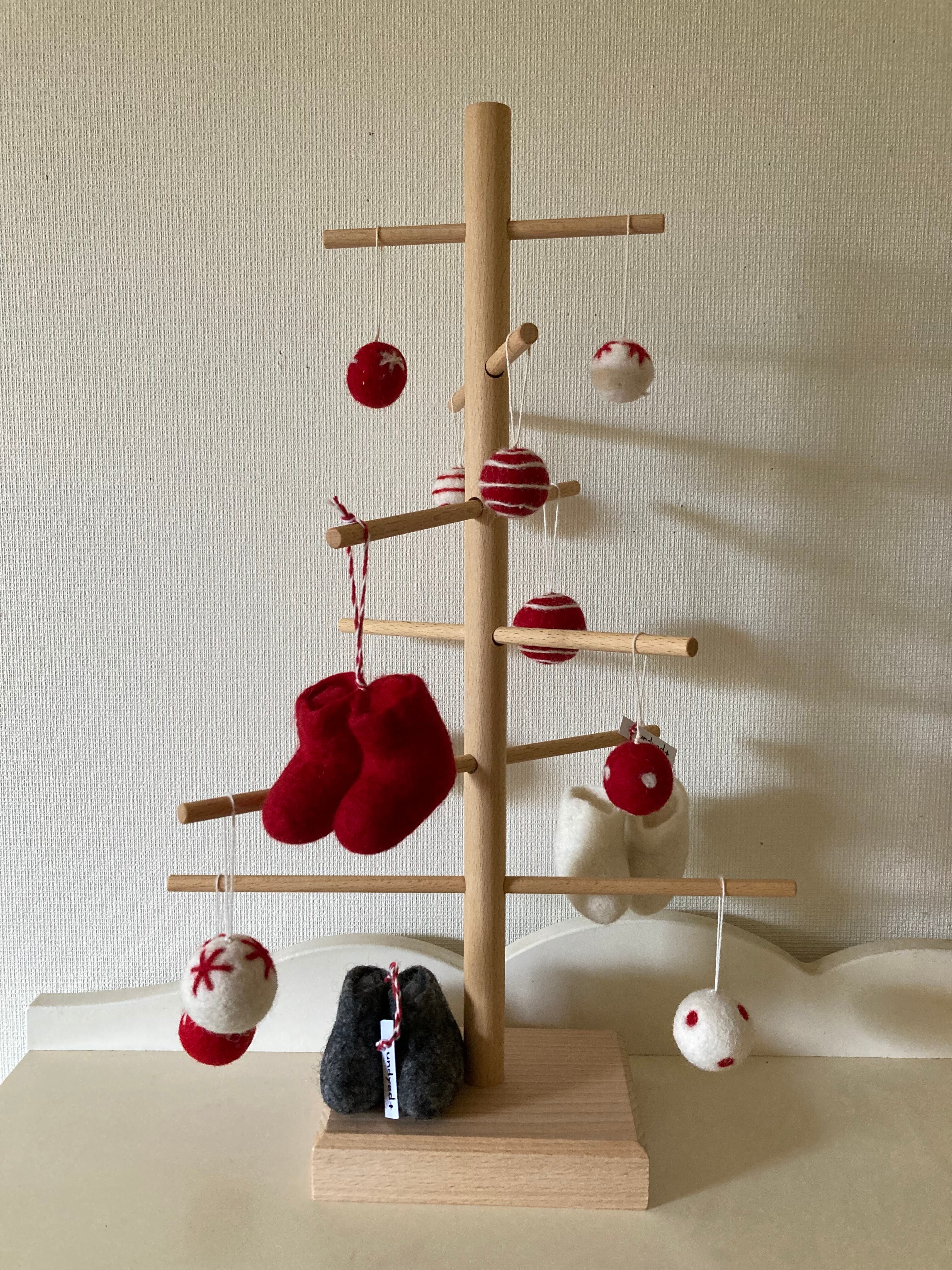 羊毛100%のフェルトの小さなブーツのオーナメント 赤 ♫ハロウィンのホウキのオーナメント付き♫