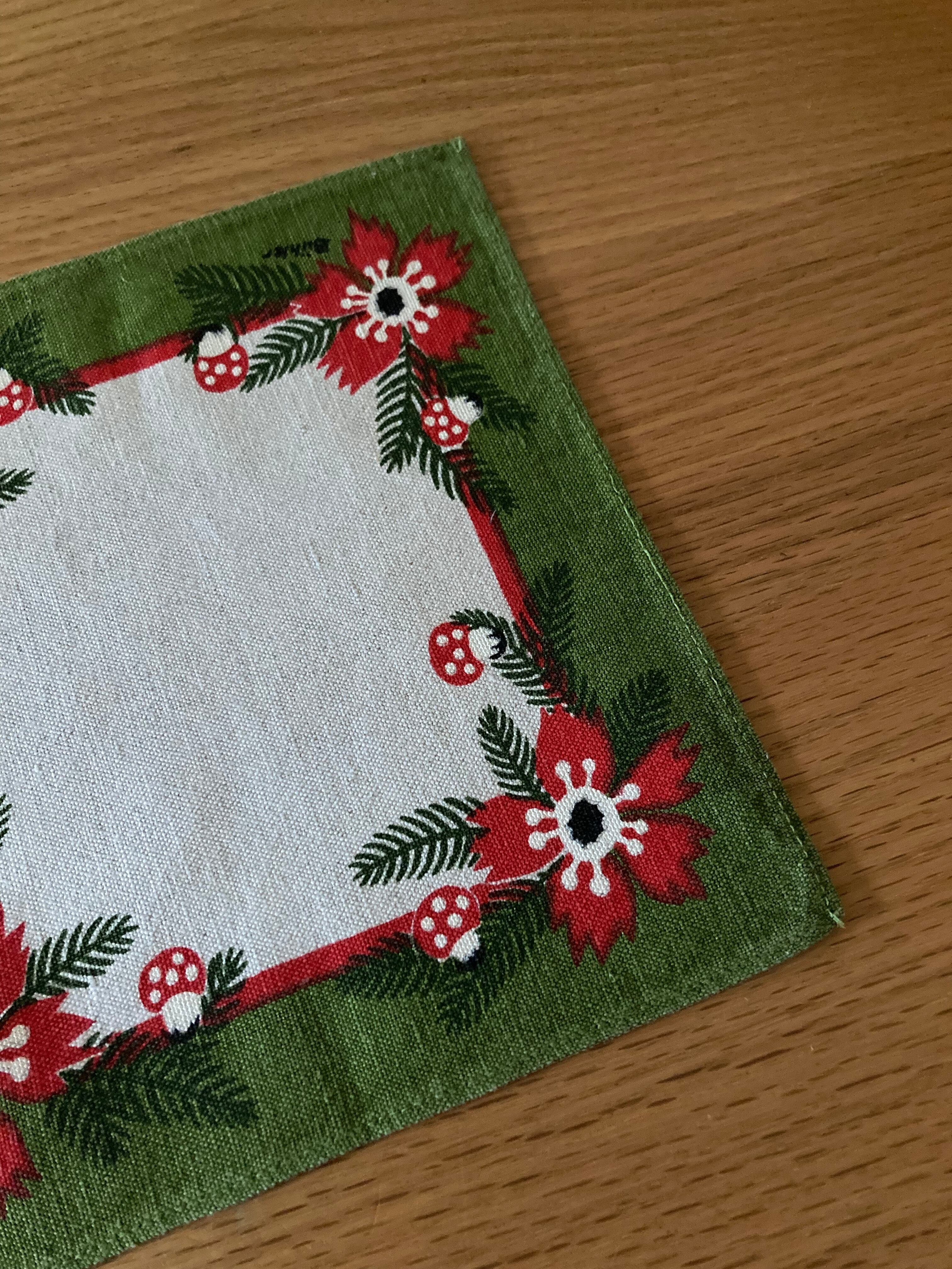 ポインセチアとヒイラギ、キノコのプリントとグリーンと赤の色味が可愛らしいクリスマスのコットンリネンクロスです♫
