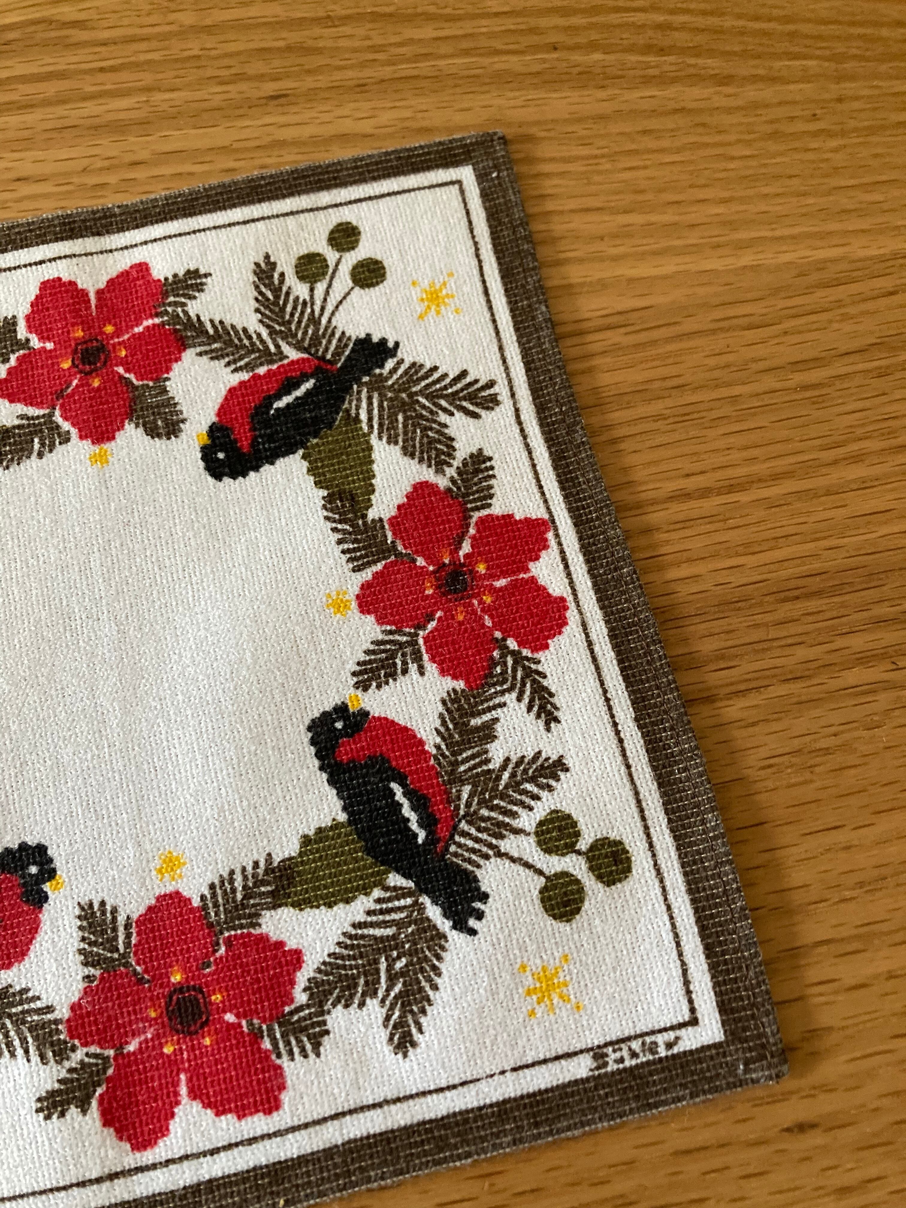 コマドリとポインセチアのプリントが可愛らしいクリスマスのコットンリネンクロスです♫
