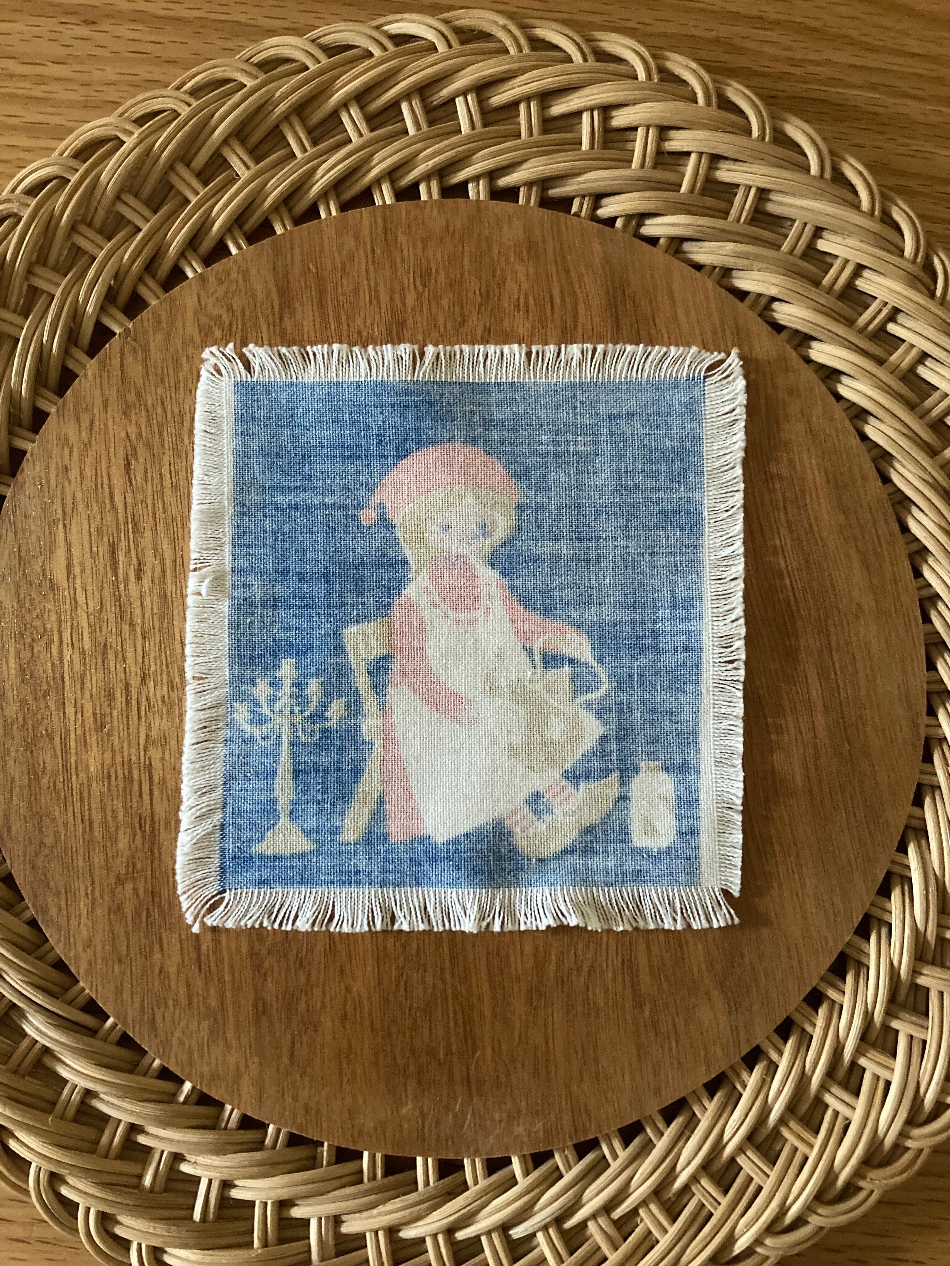 女の子が、クリスマスの準備でしょうか?ポットを磨いてる絵柄が可愛らしいミニクロスです♫