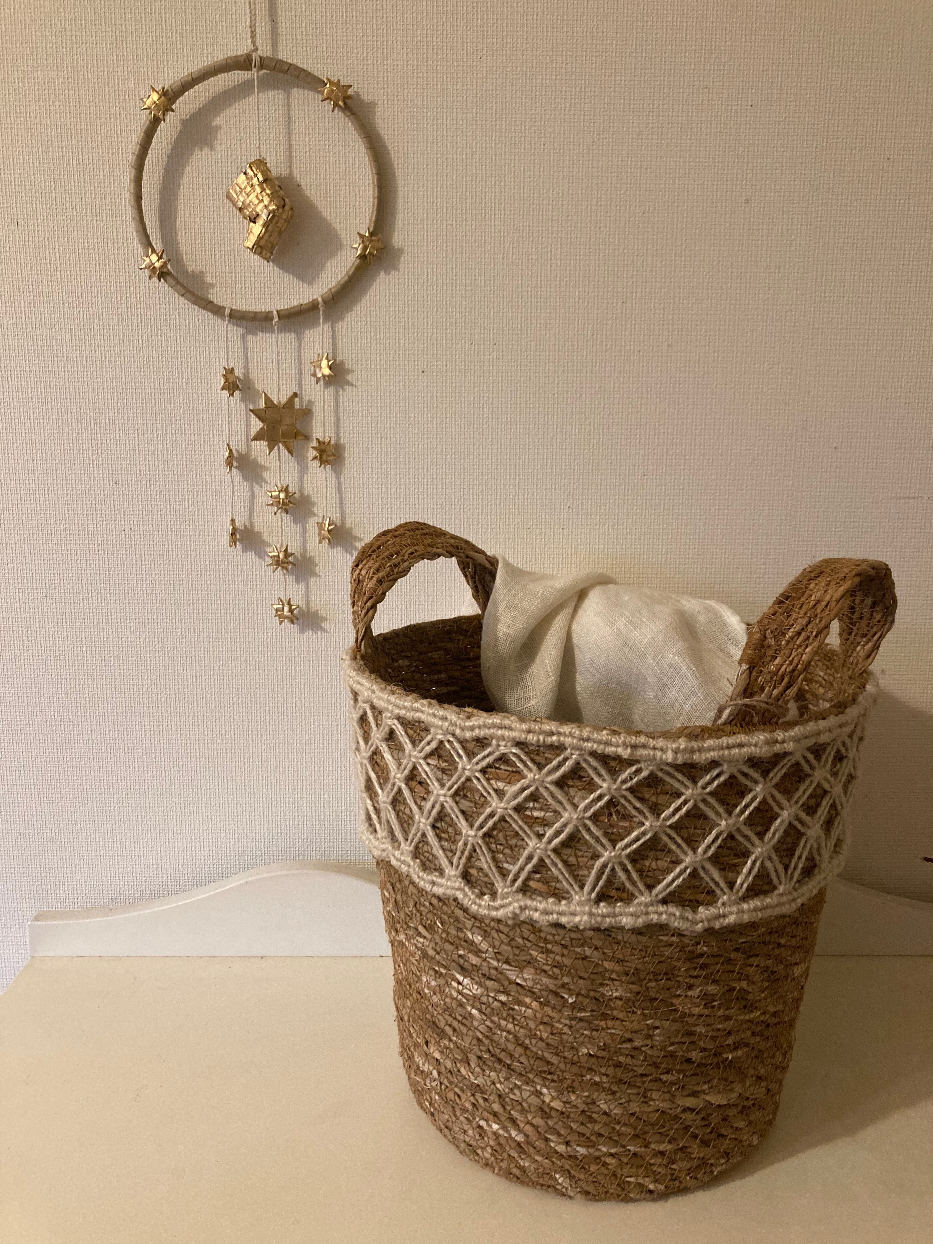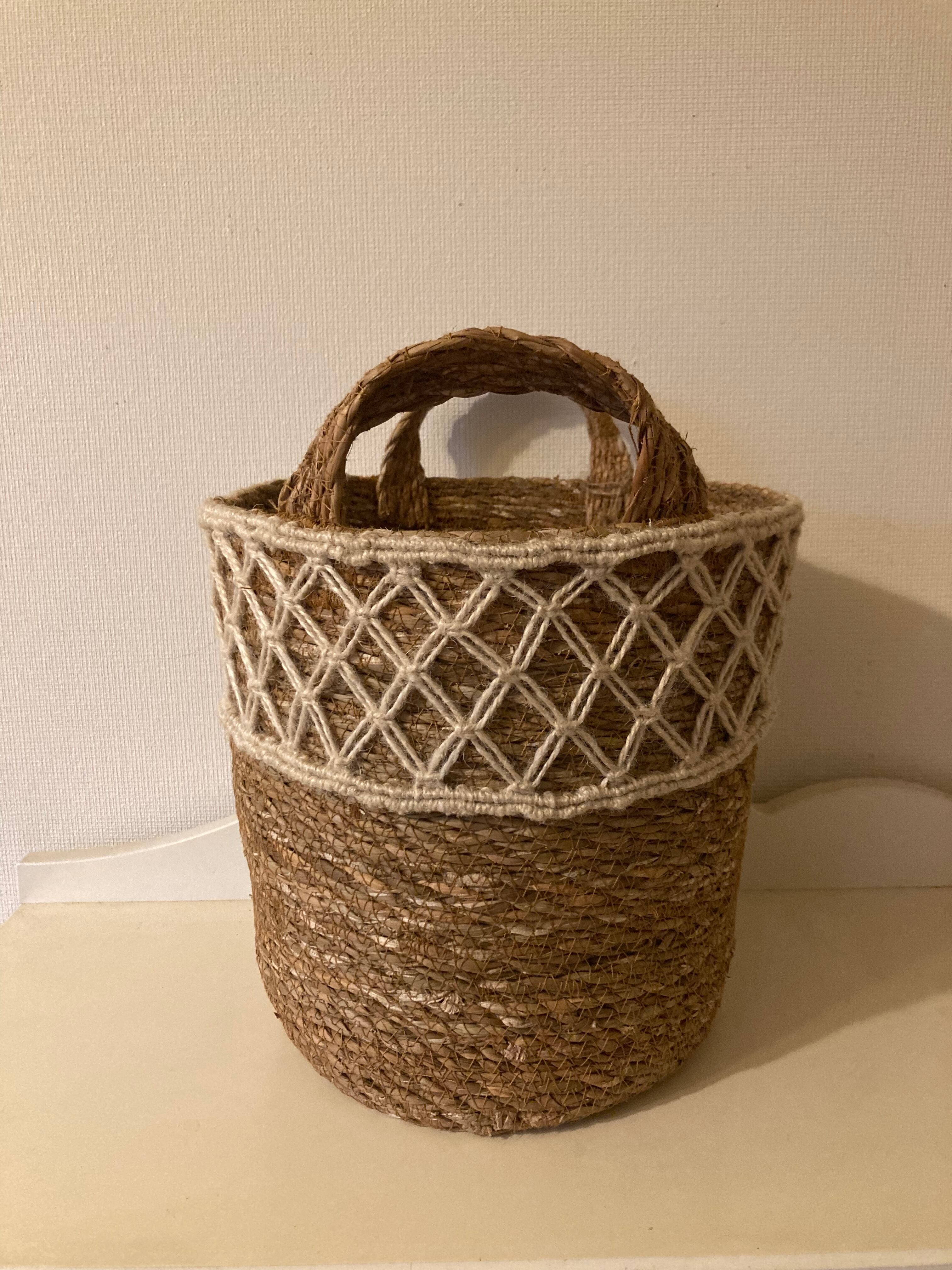 ホグラの縦長バスケットに、幾何学的なマクラメ編みがアクセントのバスケット。