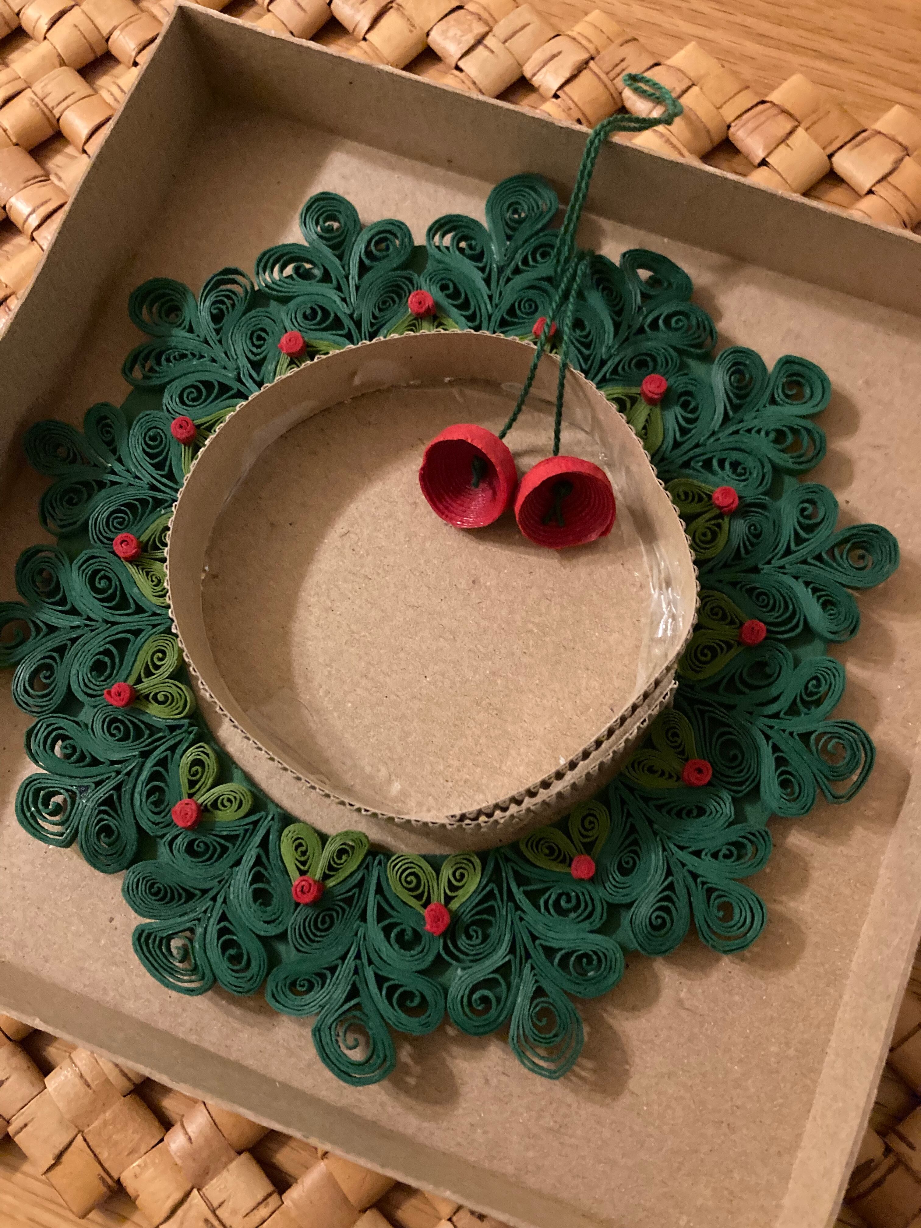 ジュートペーパーをくるくると巻いてシルエットを出している、個性的なクリスマスリースです♫