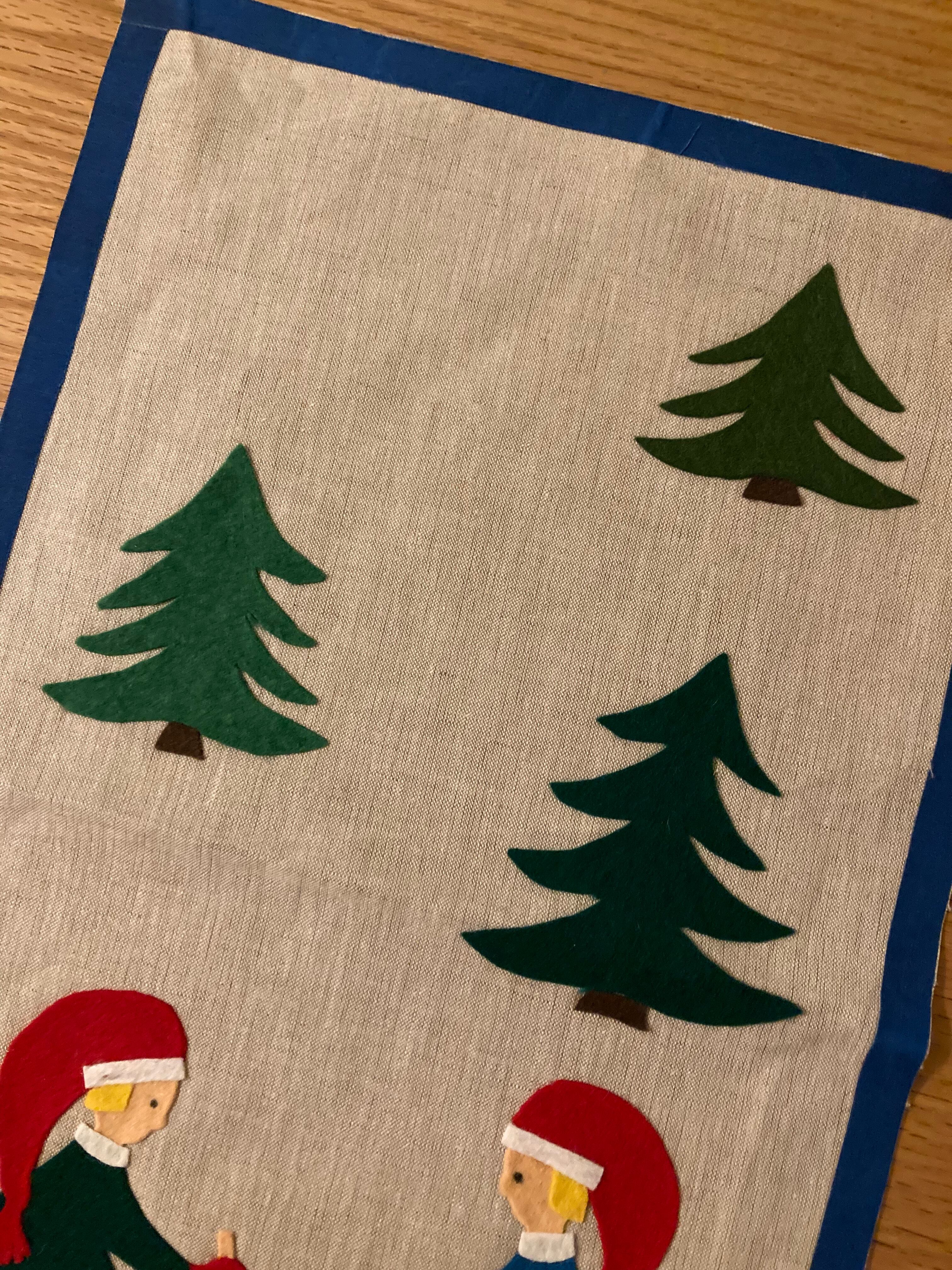 リネン生地に、トムテとツリーアップリケが可愛らしい壁飾りになります♫