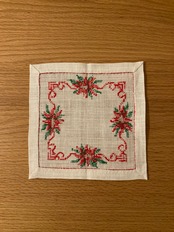 白の張りのあるリネン生地に、ポインセチアの刺繍が素敵なクロスです♫