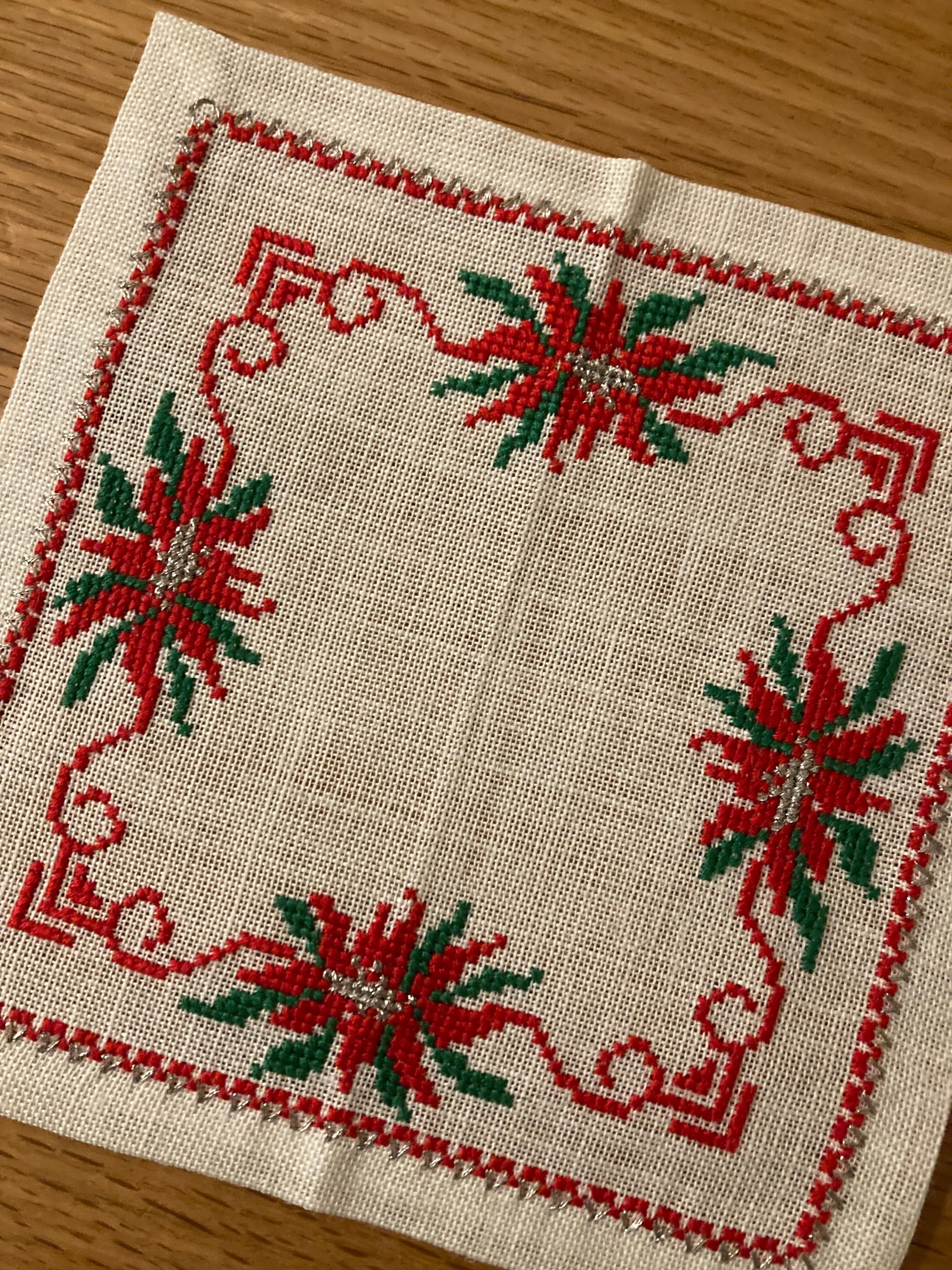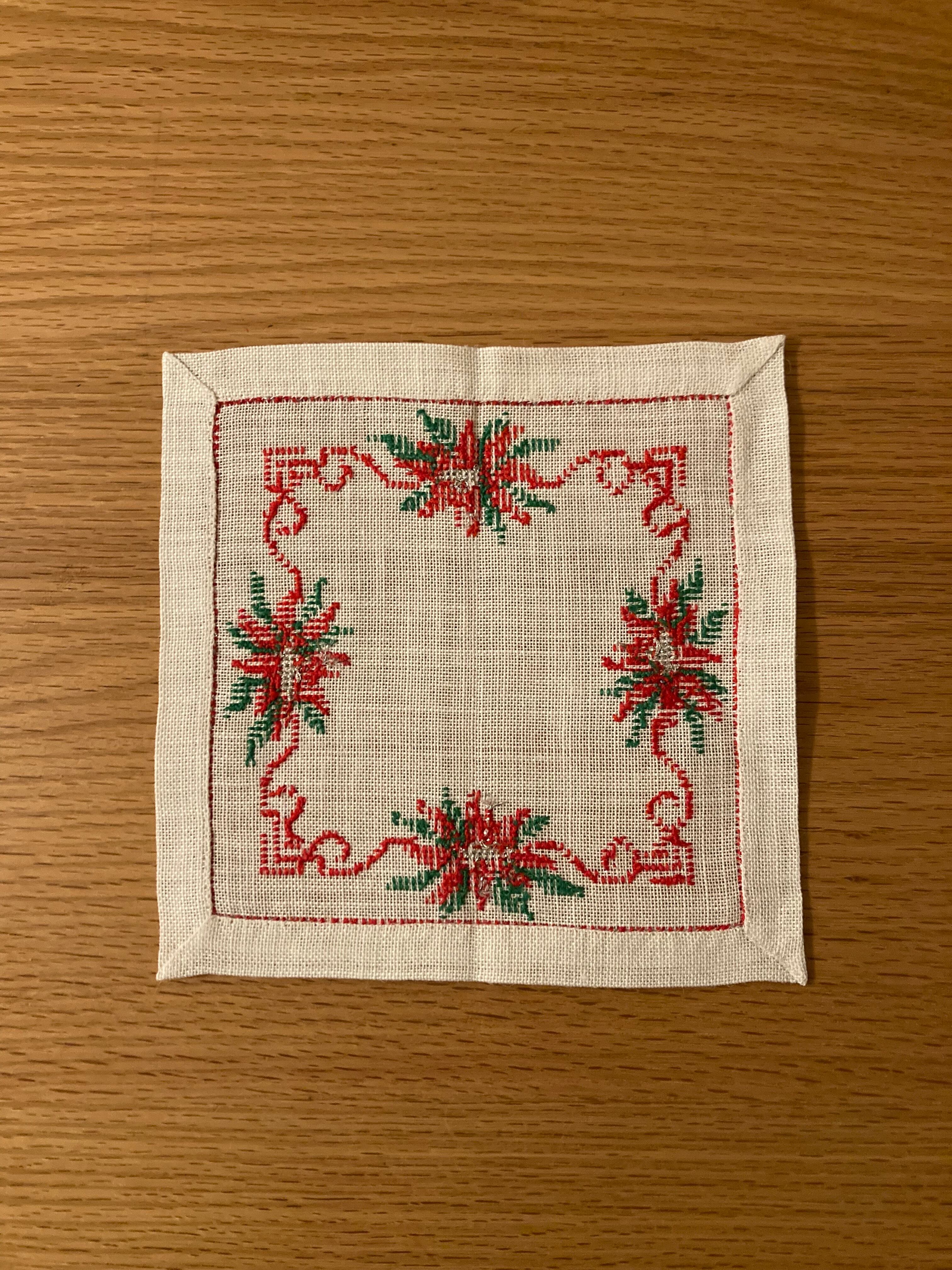 北欧 ポインセチア刺繍のリネンクロス ヴィンテージ