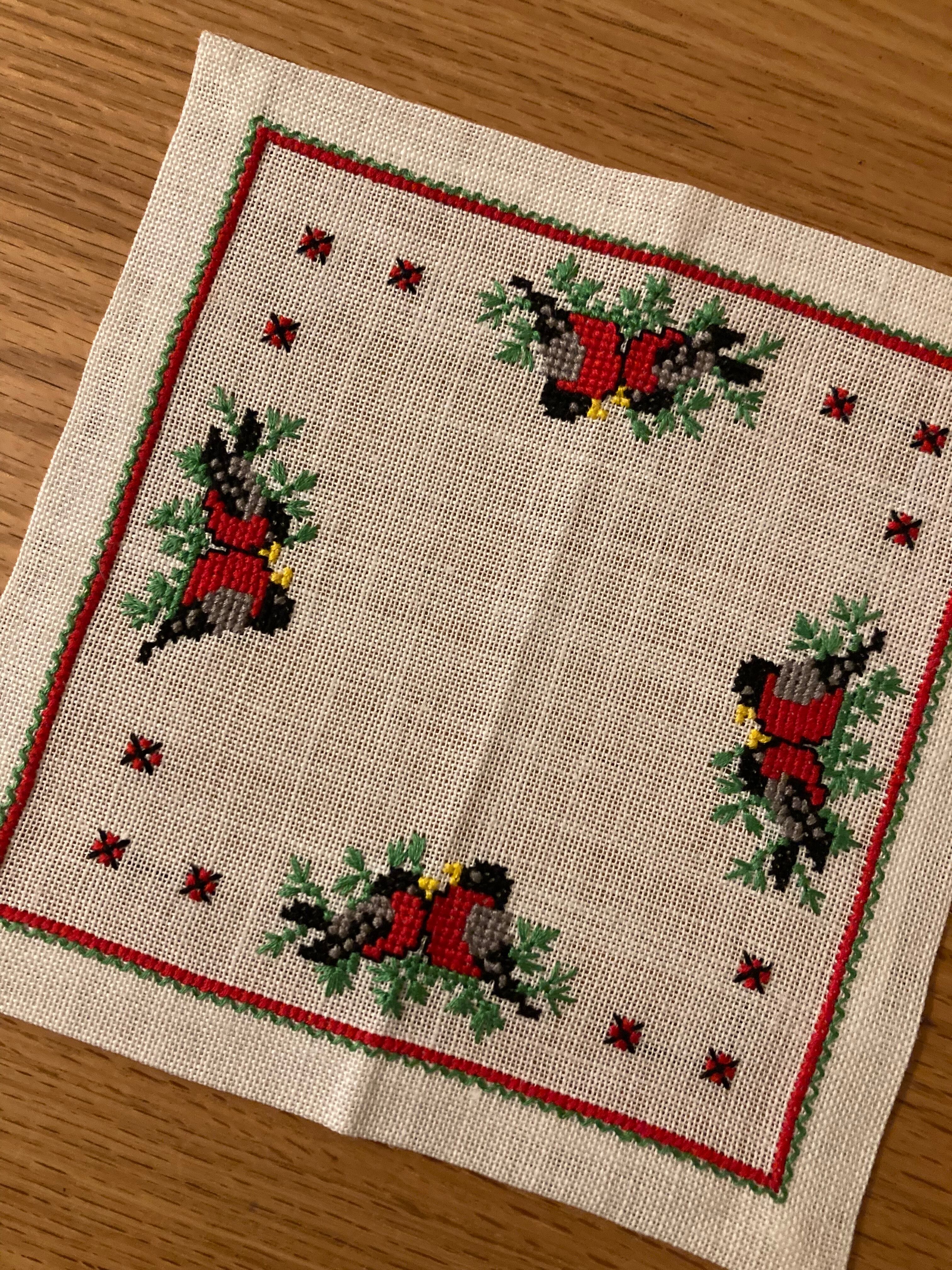 白の張りのあるリネン生地に、クリスマスを象徴する赤と黒の鳥の刺繍か可愛いらしいクロスです♫