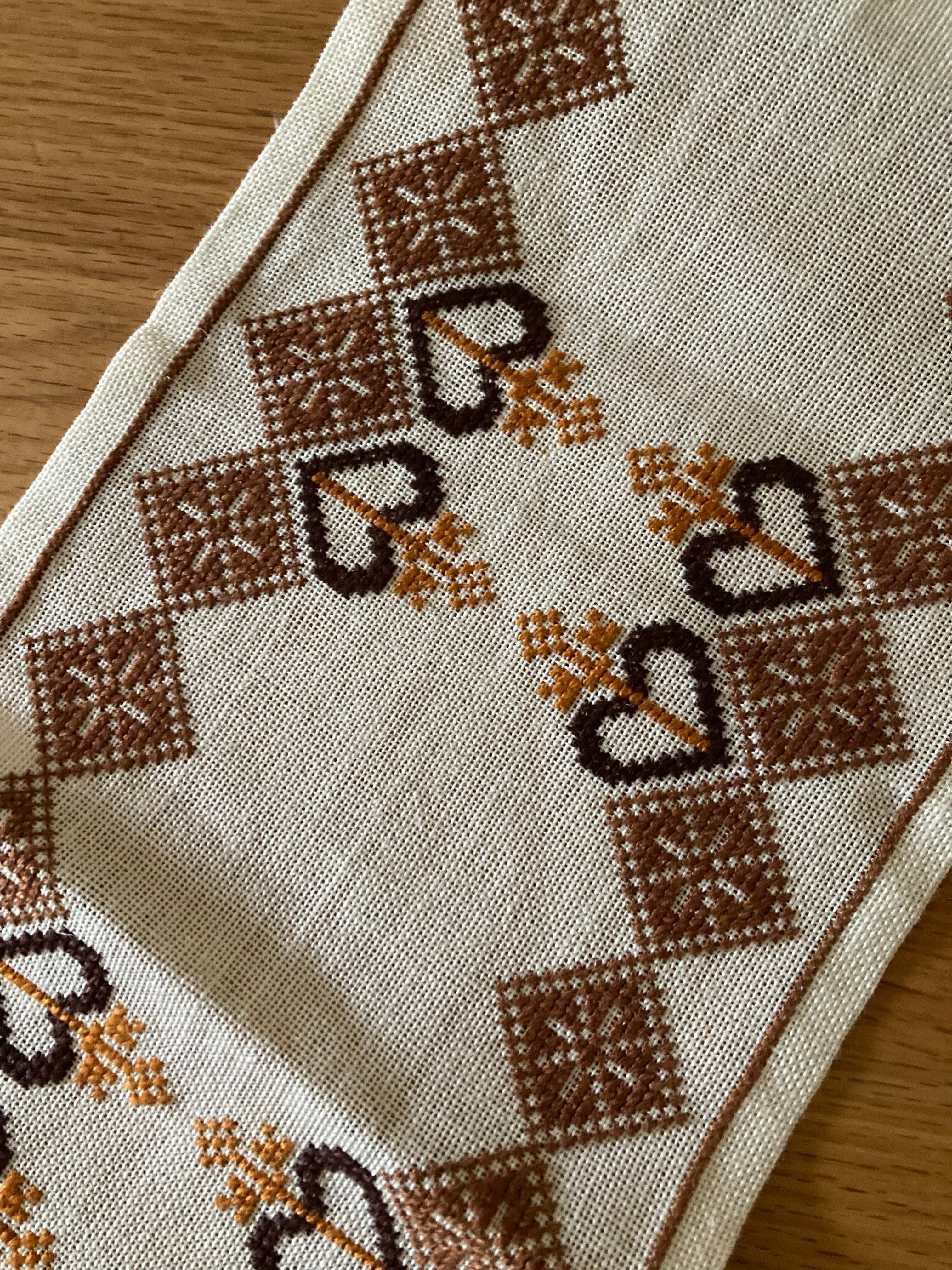 北欧 ハートの刺繍 リネンロングクロス ヴィンテージ