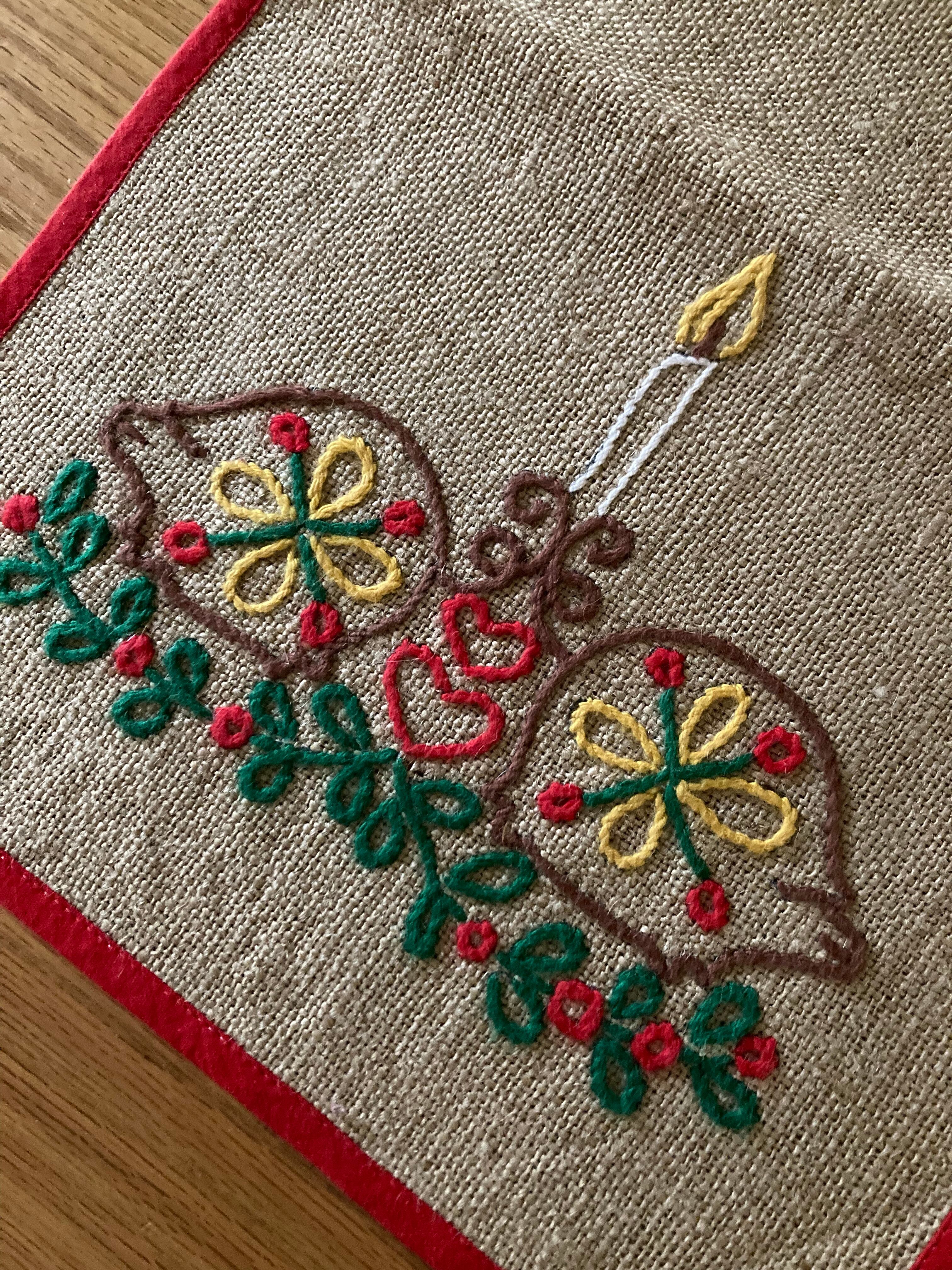 北欧 キャンドルと燭台刺繍 リネンロングクロス ヴィンテージ