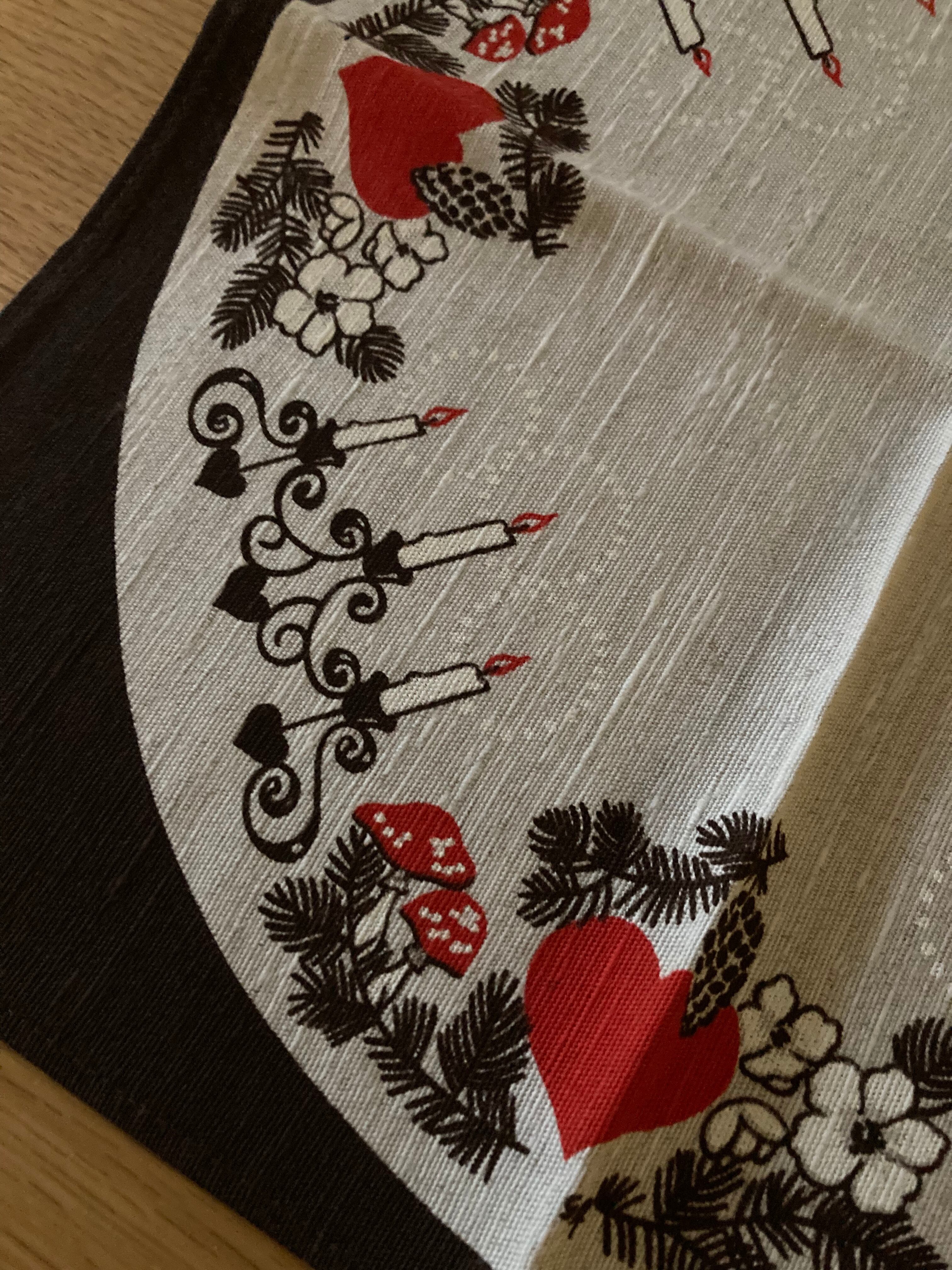 ハーフリネンの生地に、ハートとキャンドル、キノコの柄が、可愛らしいクリスマスのクロスです♫