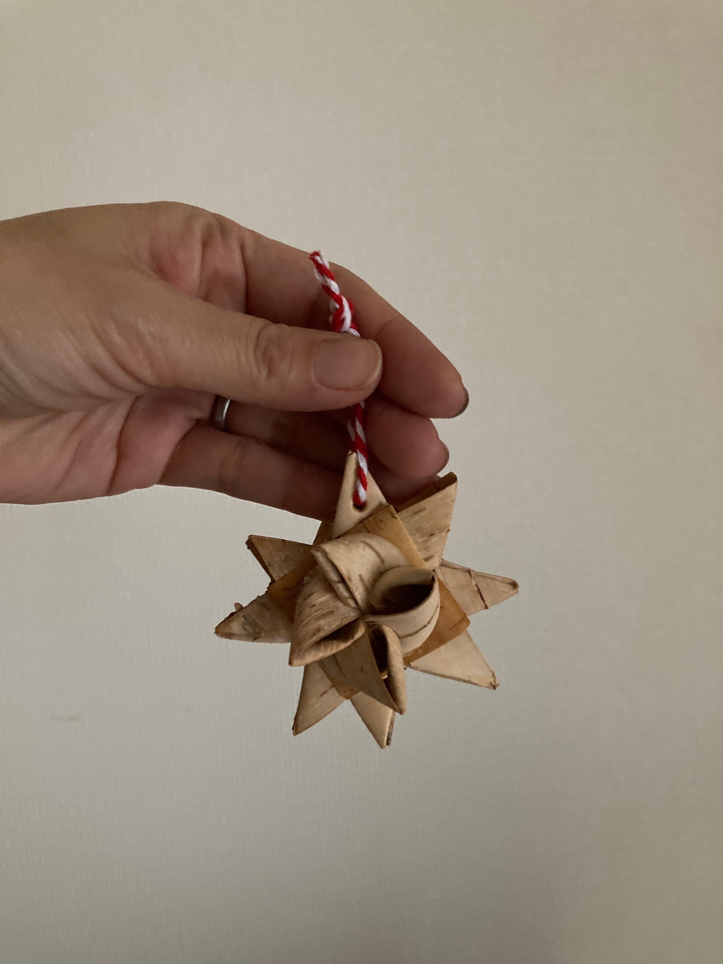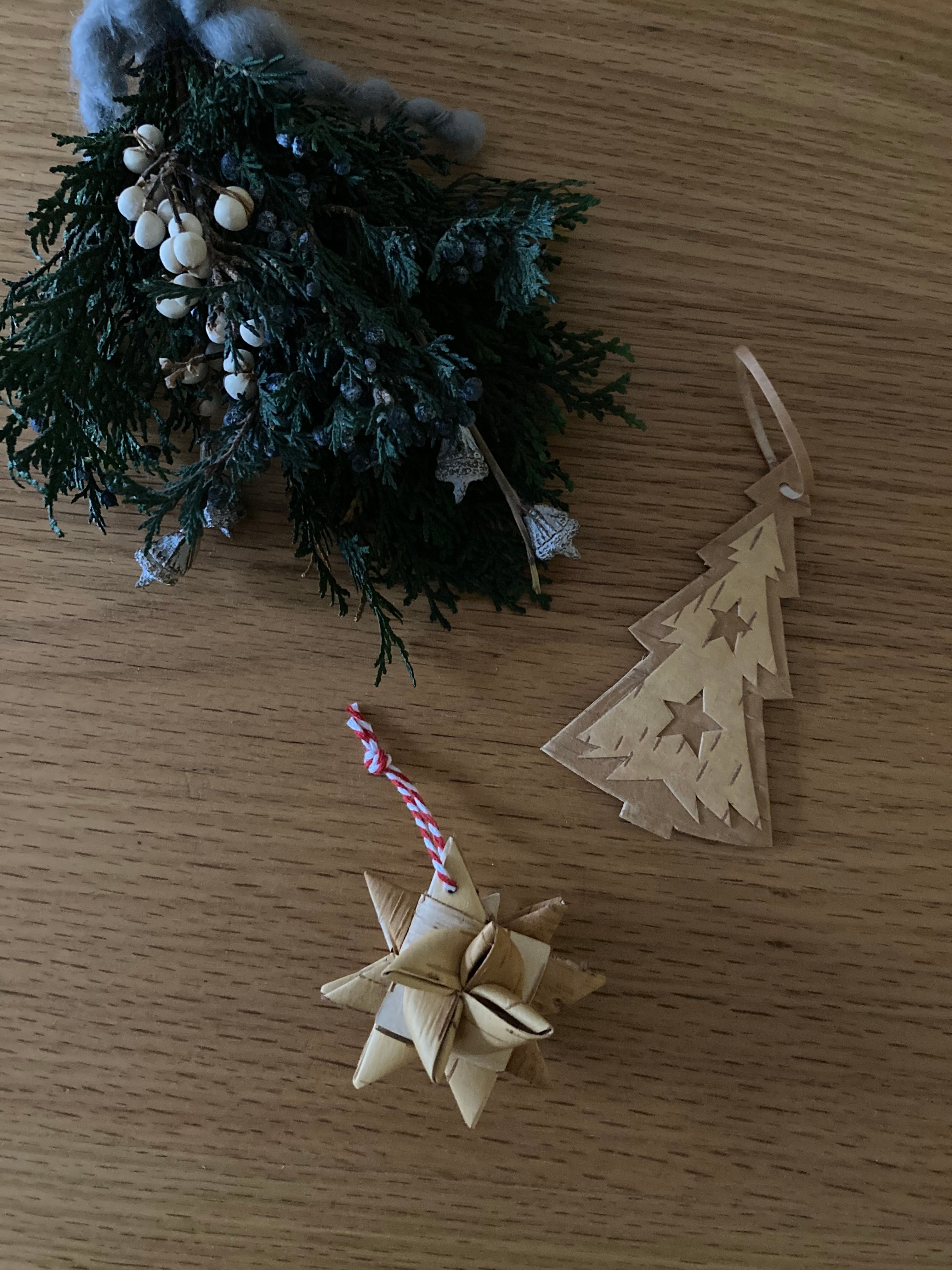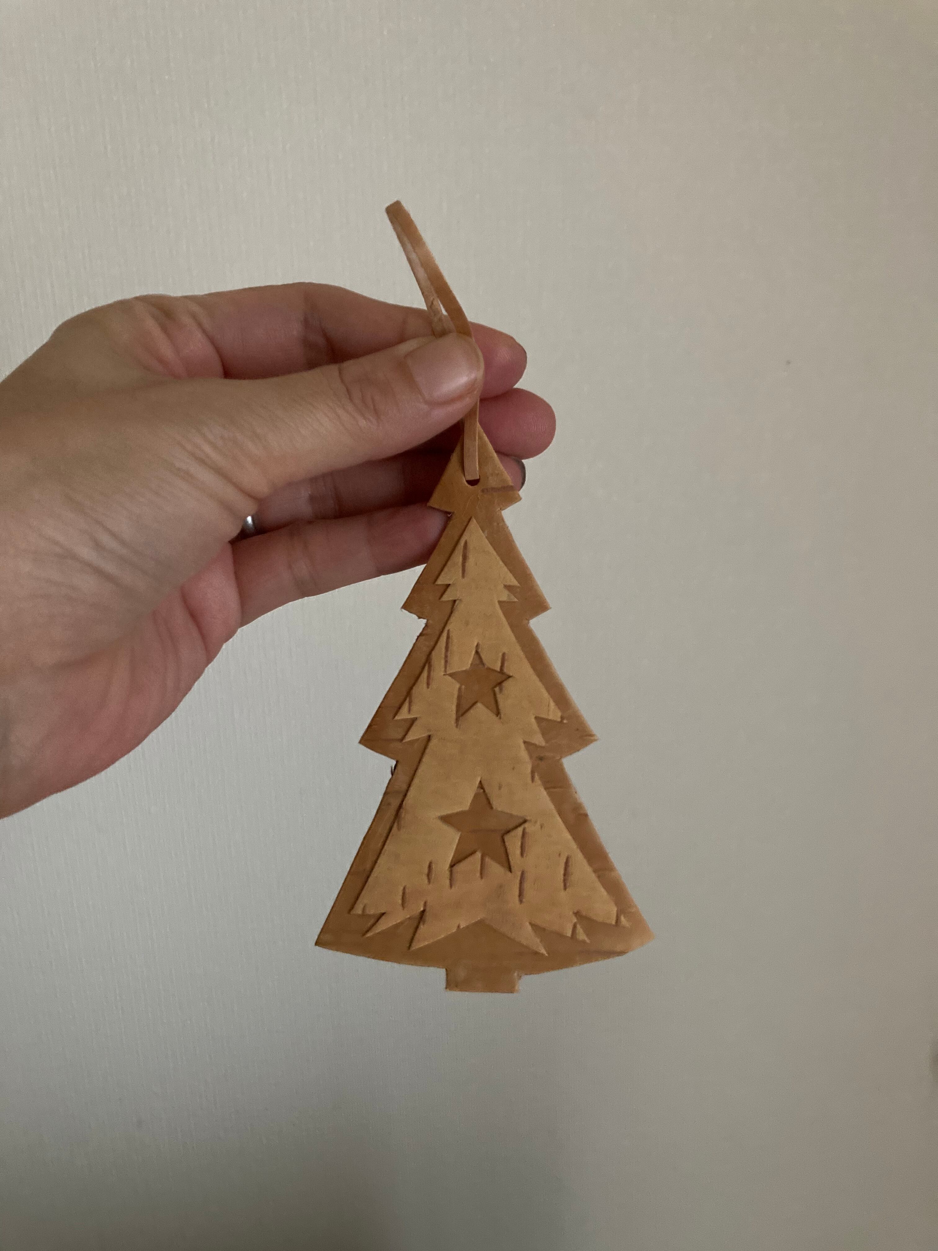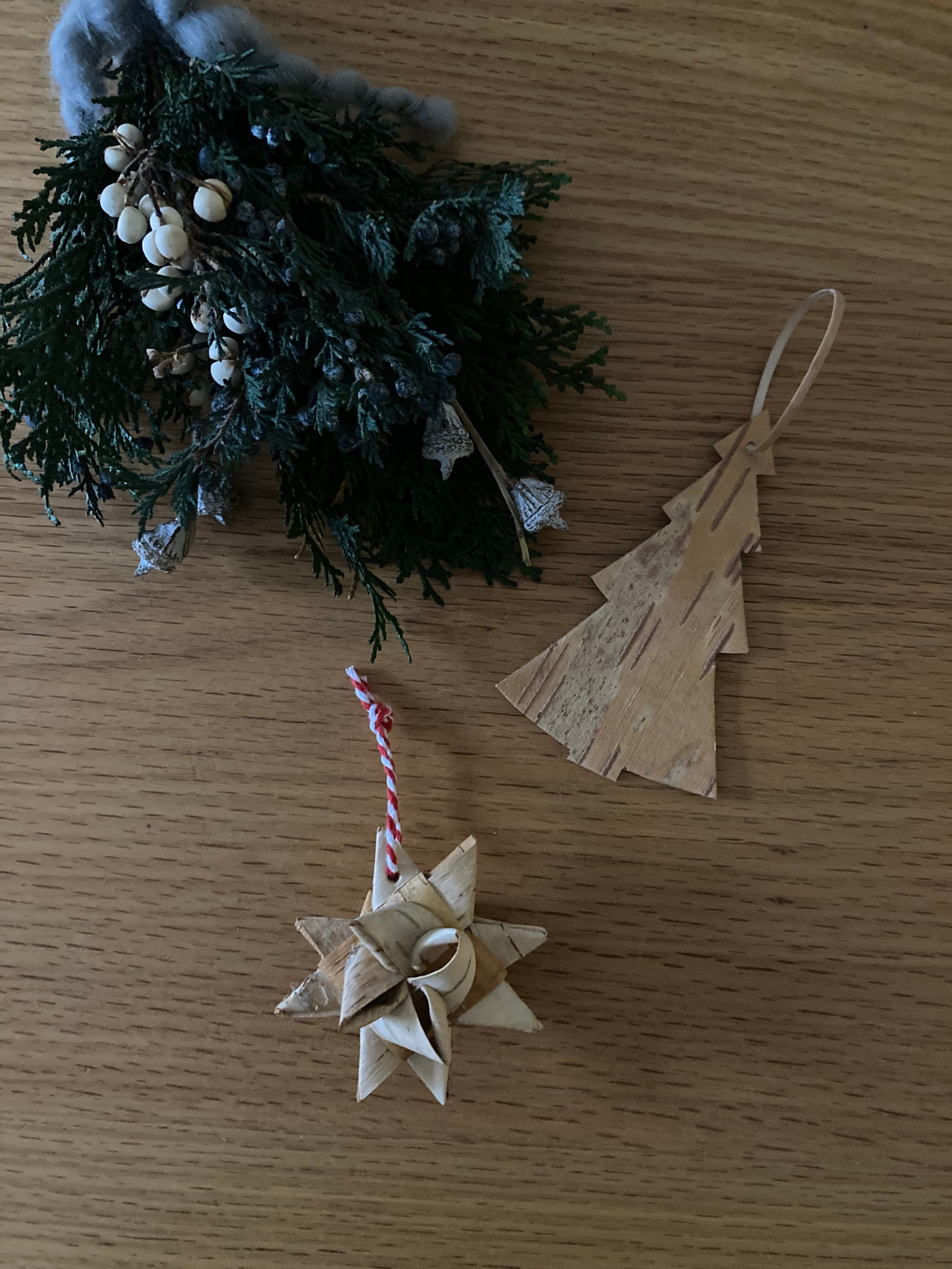 ロシアの白樺細工の職人さんが作った、白樺のツリーと立体の星型のモチーフのオーナメント2点