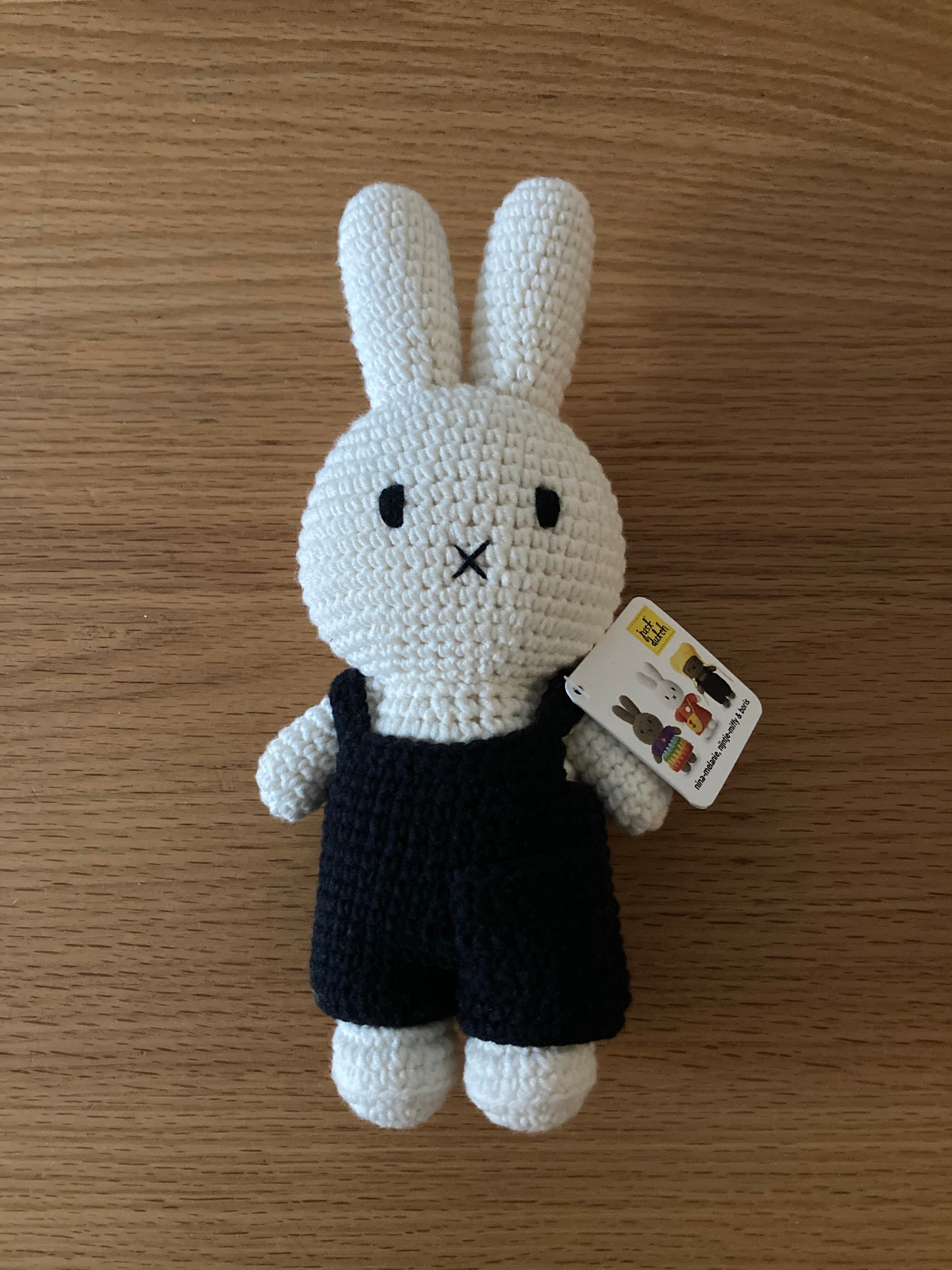 ブラックのシンプルなオーバーオールが可愛らしいミッフィーの編みぐるみになります♫