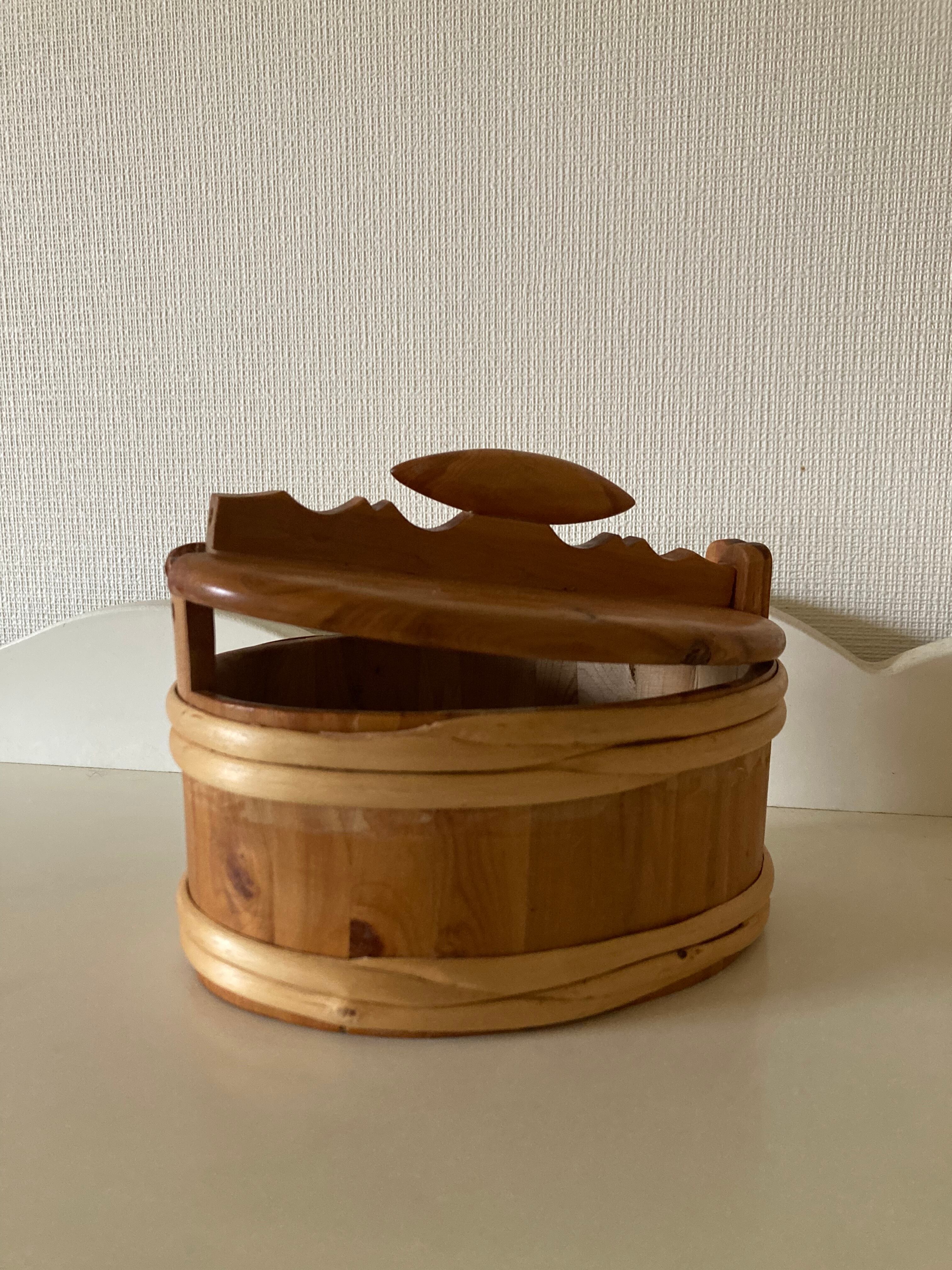 ナチュラルな木の色合いと、蓋のデザインが素敵な蓋付きの木製の入れ物♫