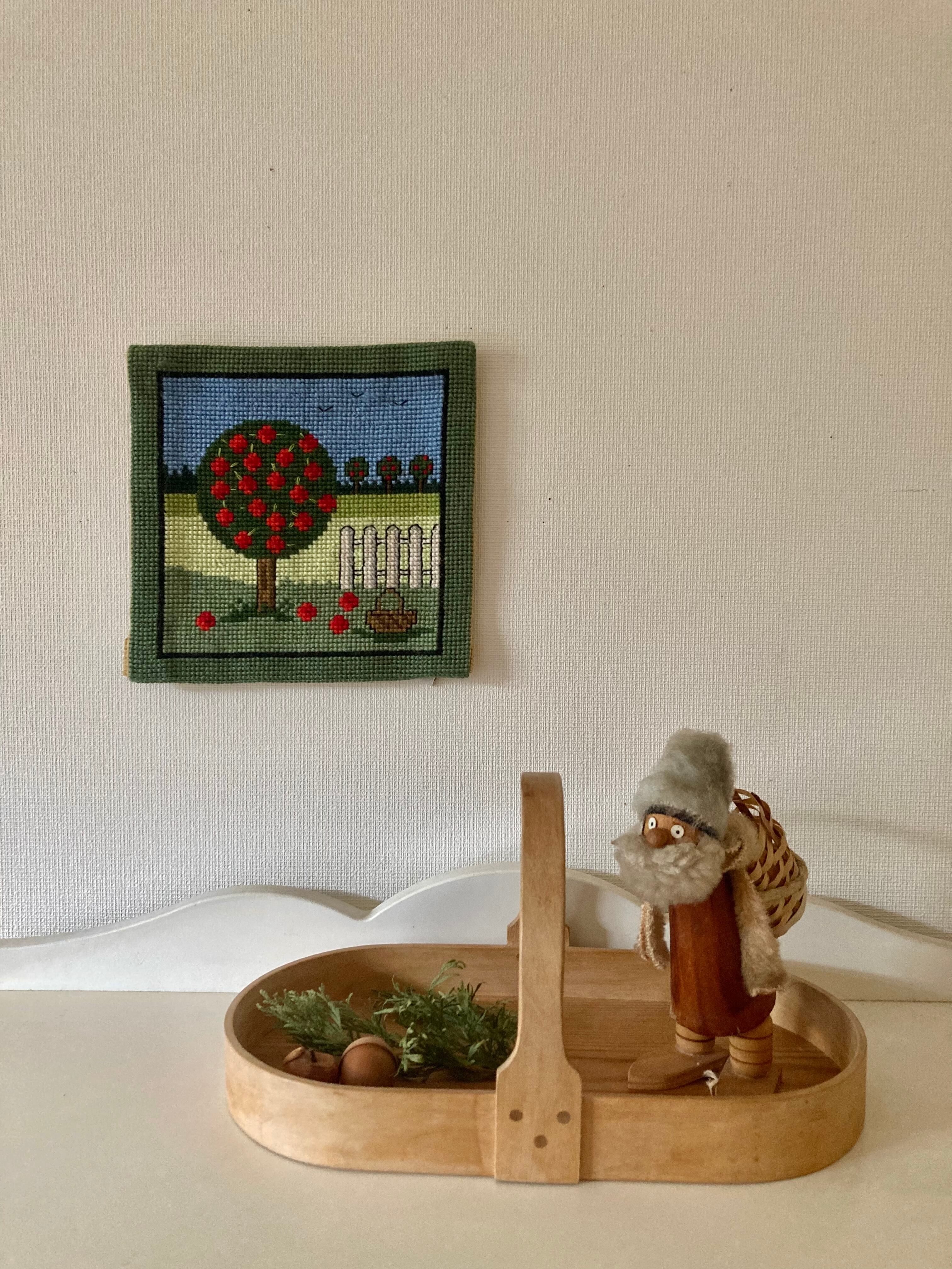 赤いリンゴがなってる丸い木の、秋の風景が刺繍で描かれている、とても凝った可愛いらしい壁飾りになります。木の下に落ちたリンゴとバスケットも可愛いらしいです♫