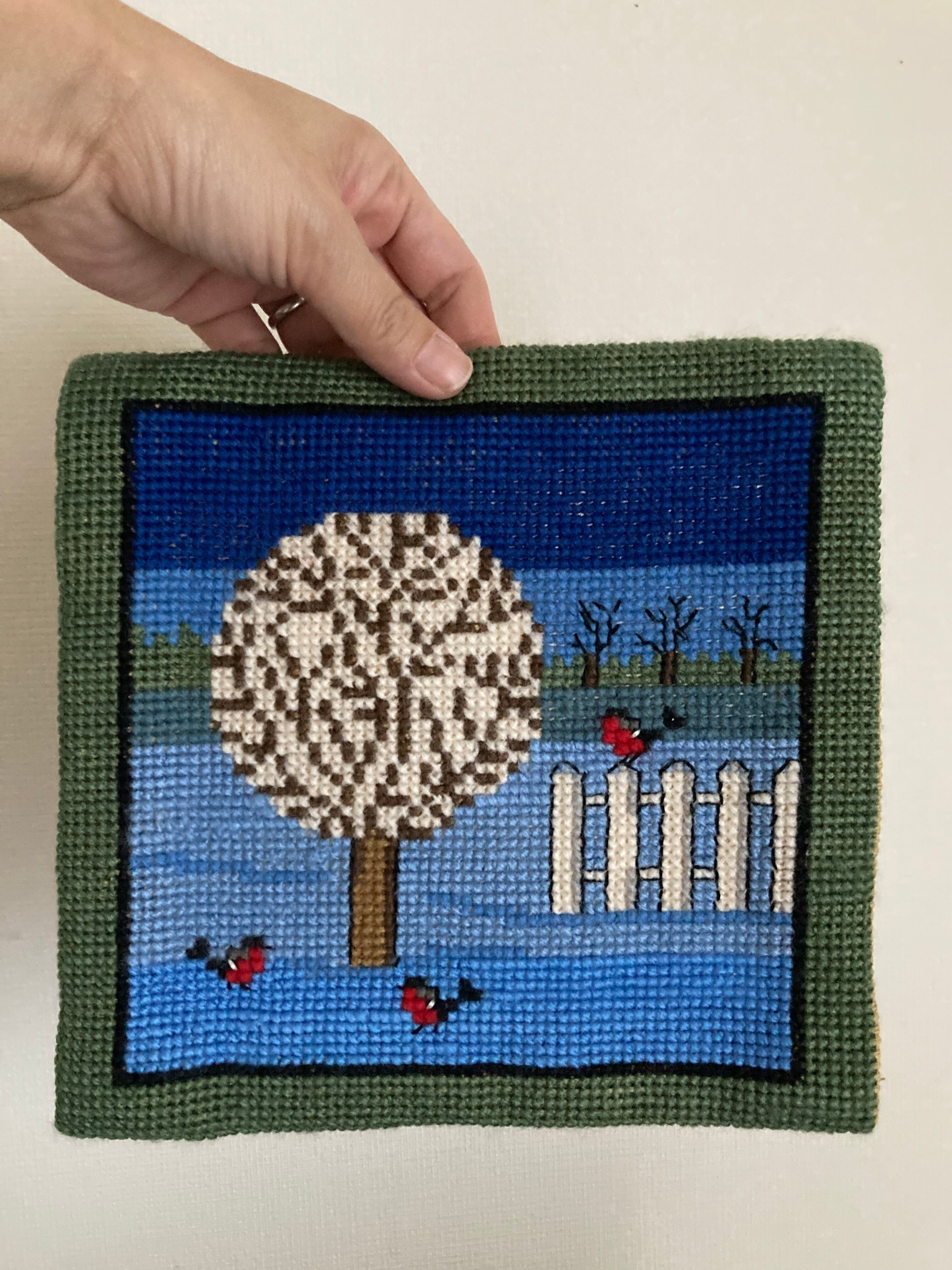 雪が積もった丸い木に、コマドリと、冬の風景が刺繍で描かれている、とても凝った可愛いらしい壁飾りになります。コマドリの赤がまたポイント♫