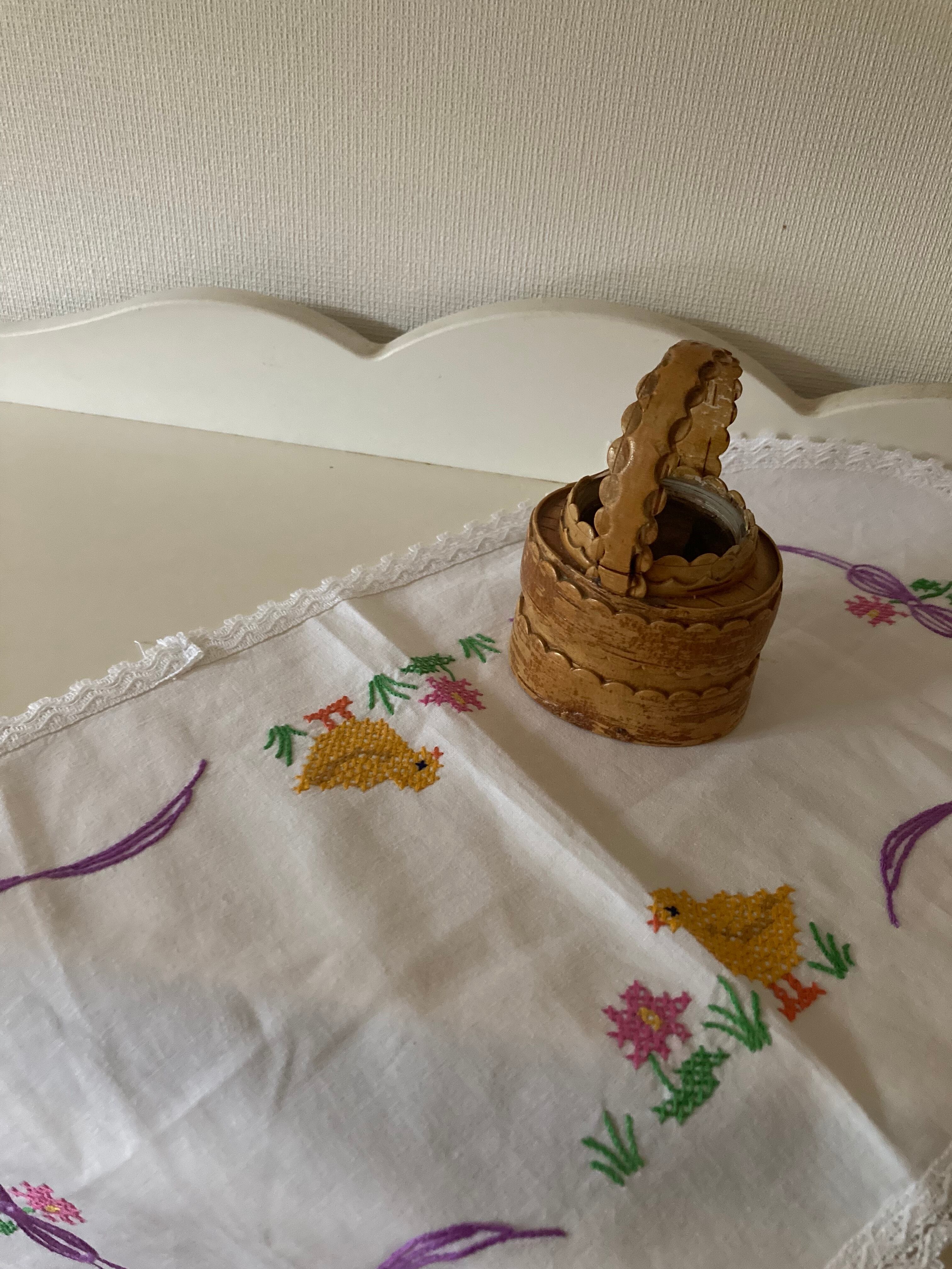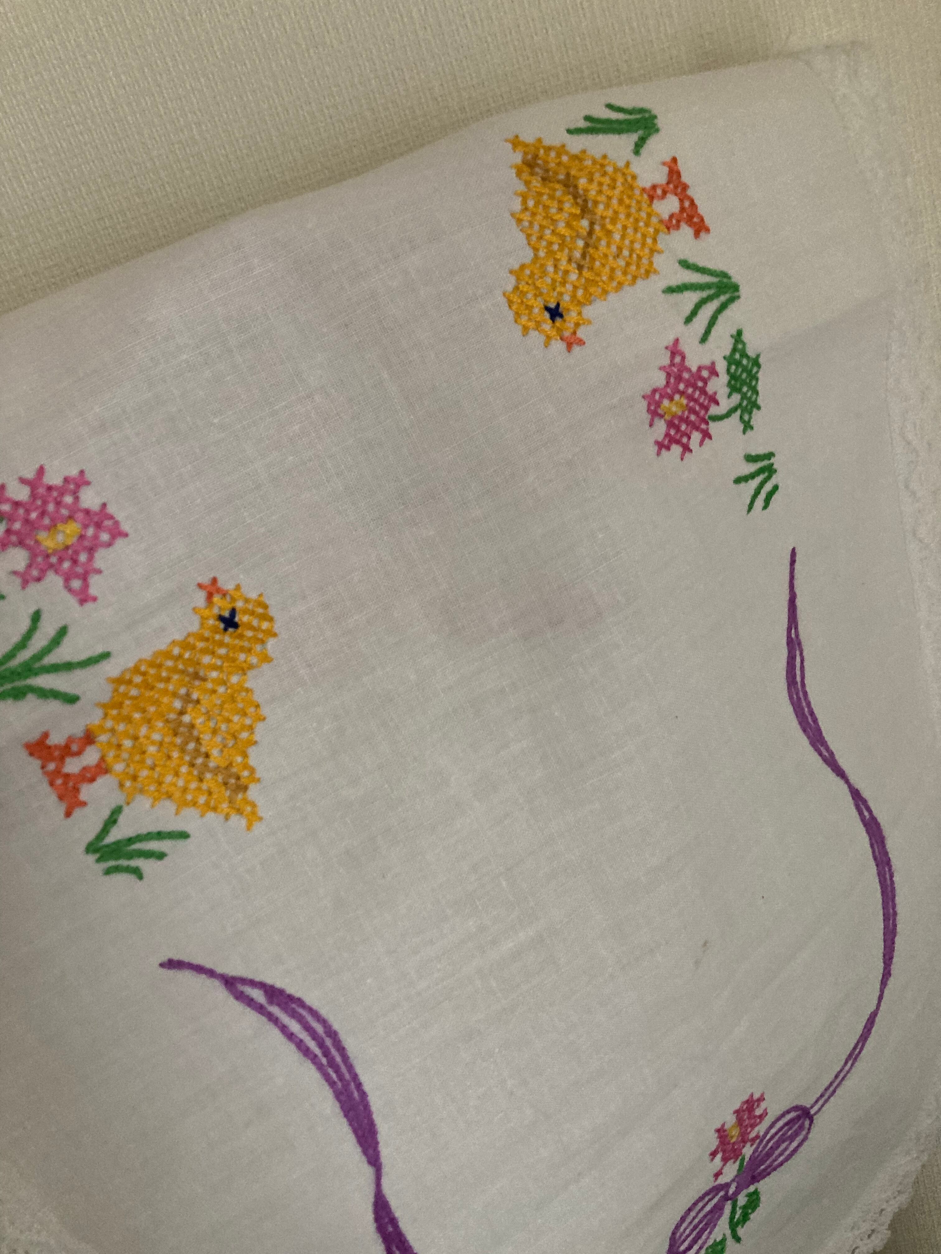 薄手のコットン生地に、ヒヨコにピンクのお花、パープルのリボン刺繍が、とても凝っていて可愛らしい楕円型のクロスになります。