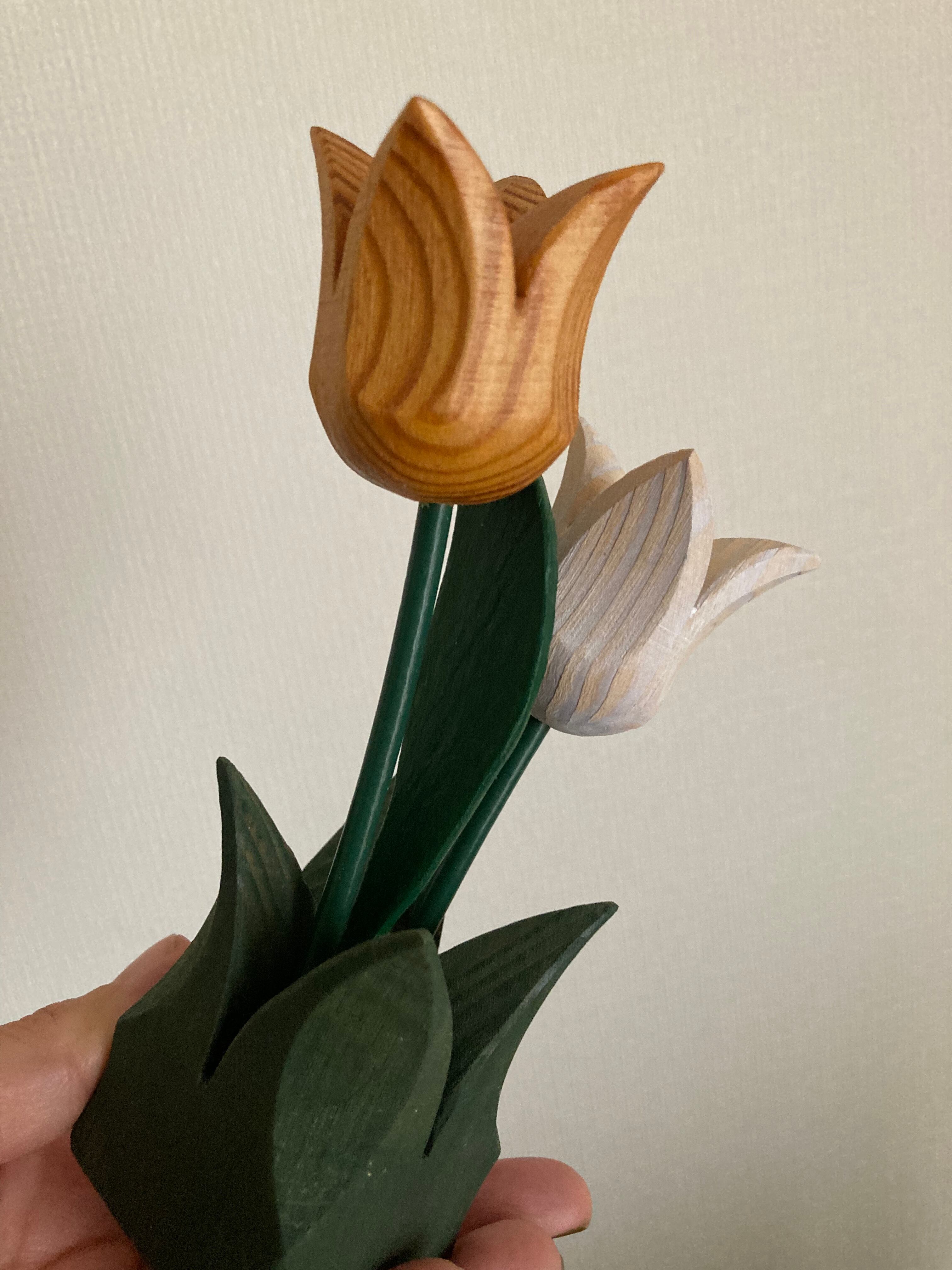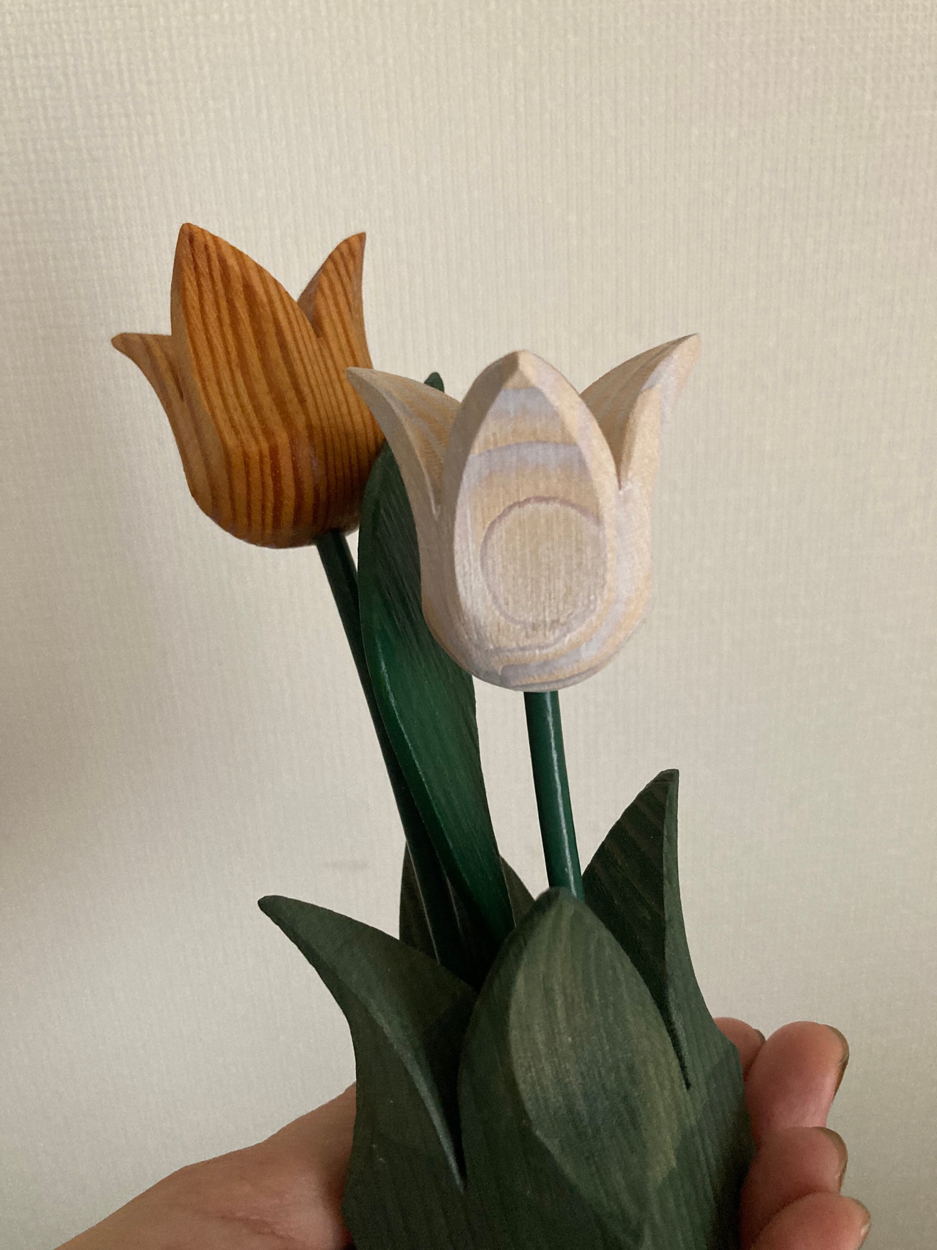 落ち着いた色味の黄色と白の2つのチューリップと、グリーンの葉っぱが可愛らしい木製のチューリップのオブジェです♫